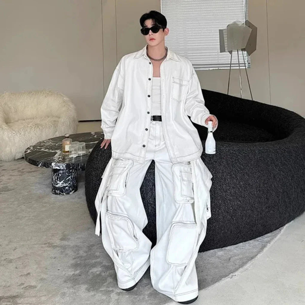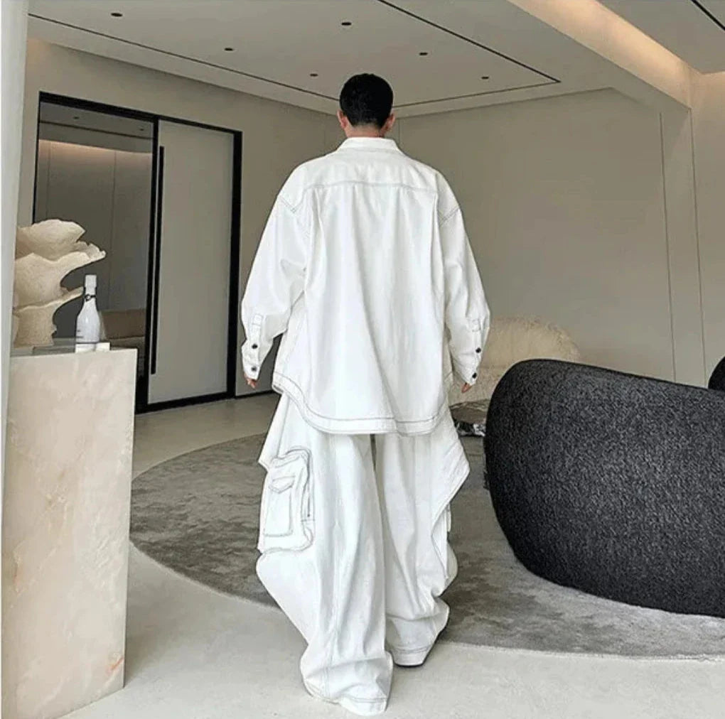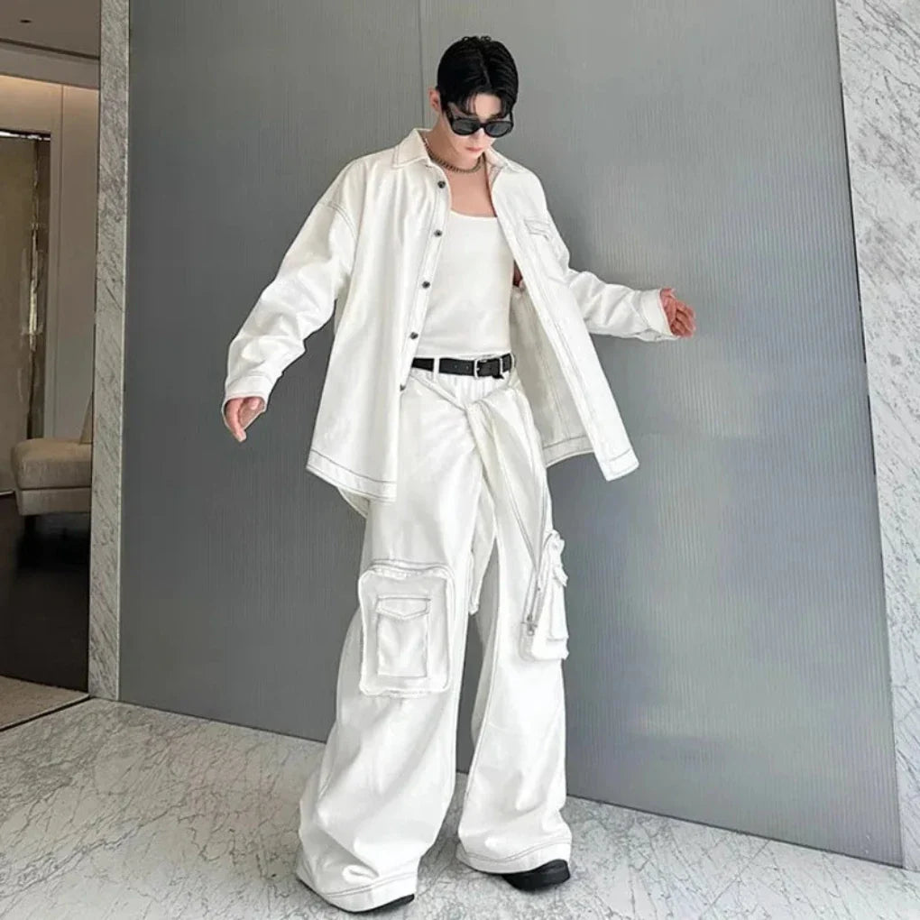 This Baggy Streetwear Cargo Pants Set offers a modern take on casual style. This coordinated set features relaxed-fit cargo pants and a matching jacket. creating a comfortable yet put-together look. In a clean white color.
