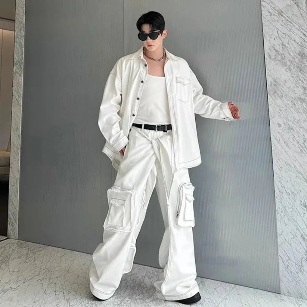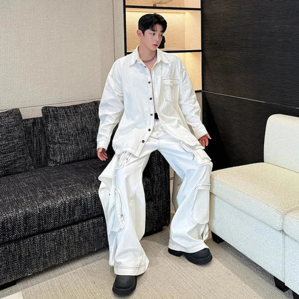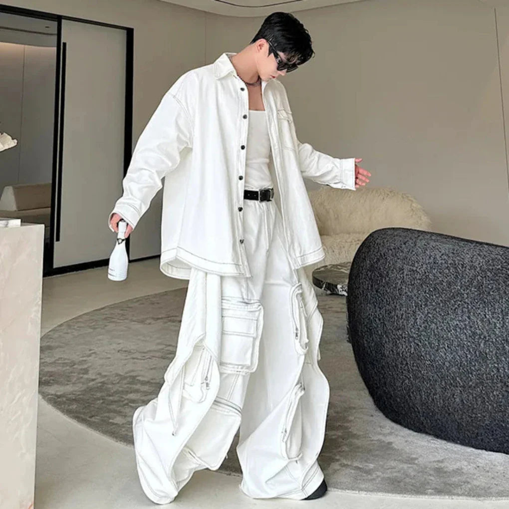 This Baggy Streetwear Cargo Pants Set offers a modern take on casual style. This coordinated set features relaxed-fit cargo pants and a matching jacket. creating a comfortable yet put-together look. In a clean white color.