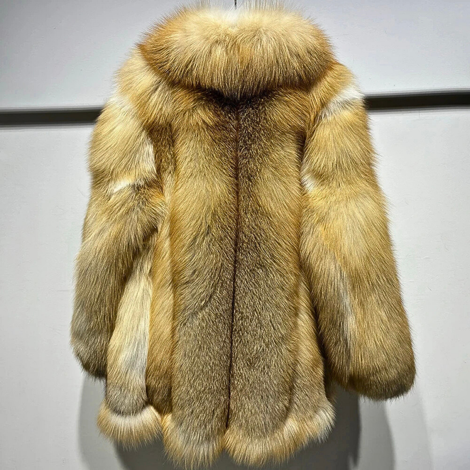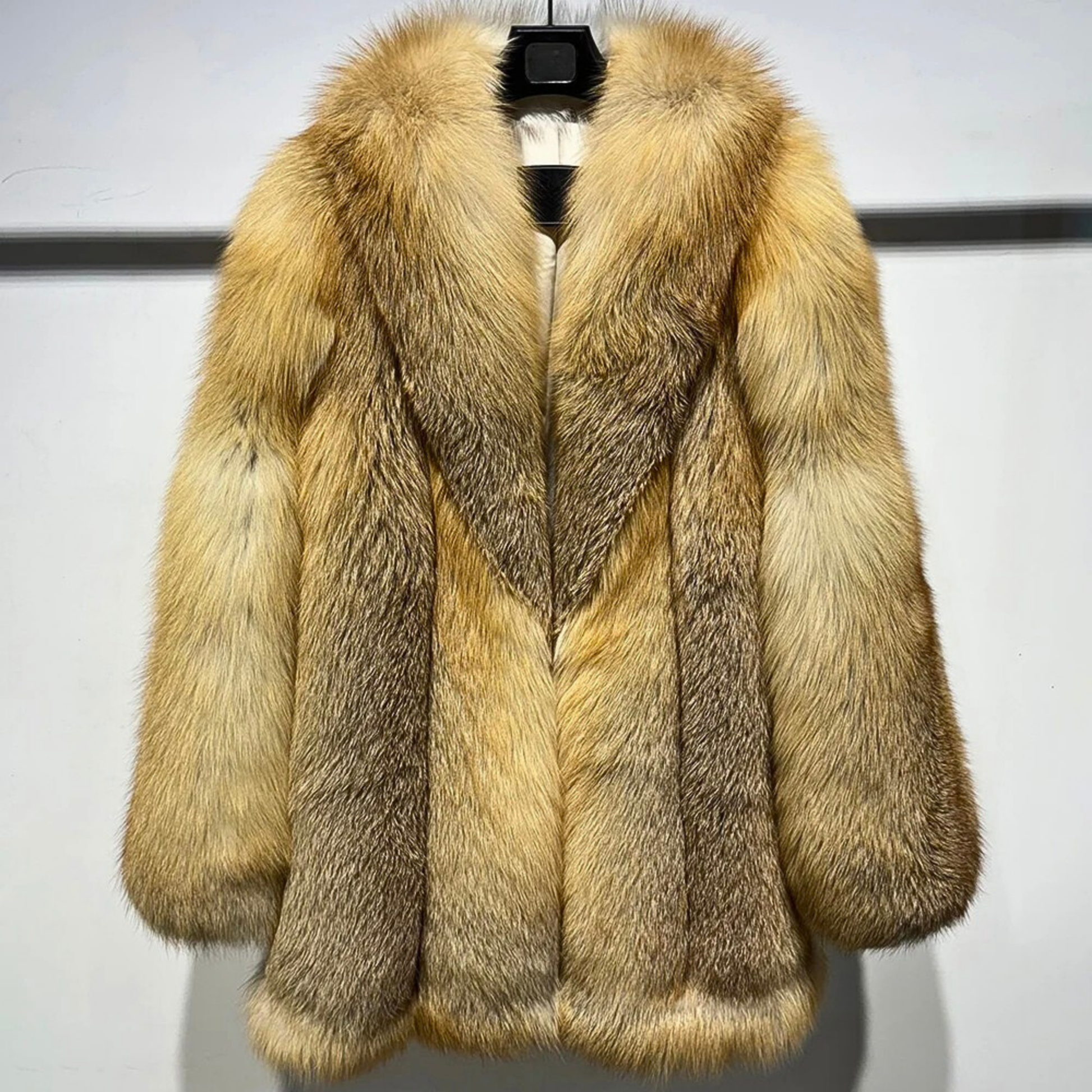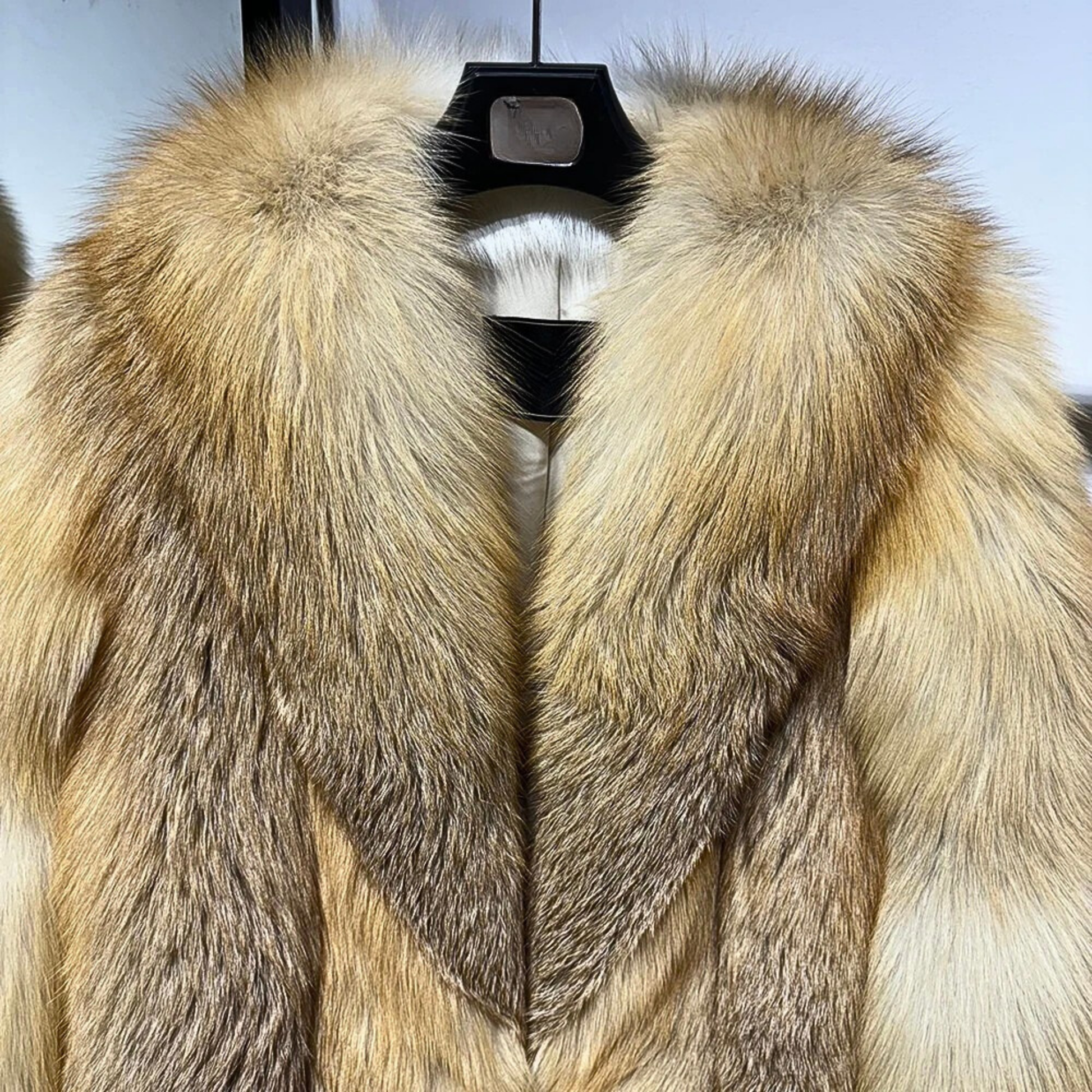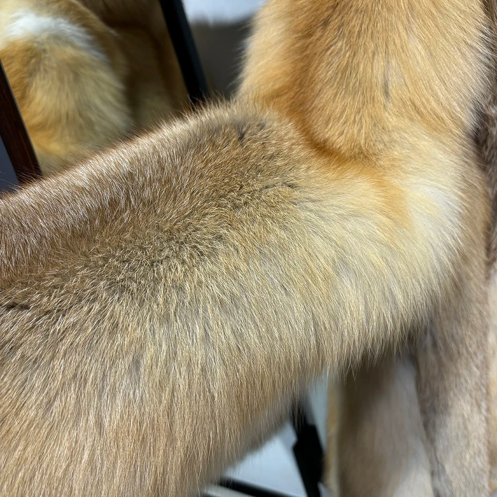 A stunning symbol of luxury. this Golden Fox Fur coat is crafted from 100% genuine fox fur. making it the ultimate cozy luxury piece for your wardrobe.