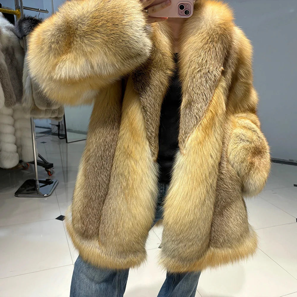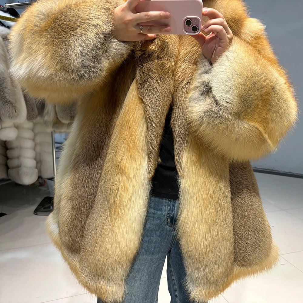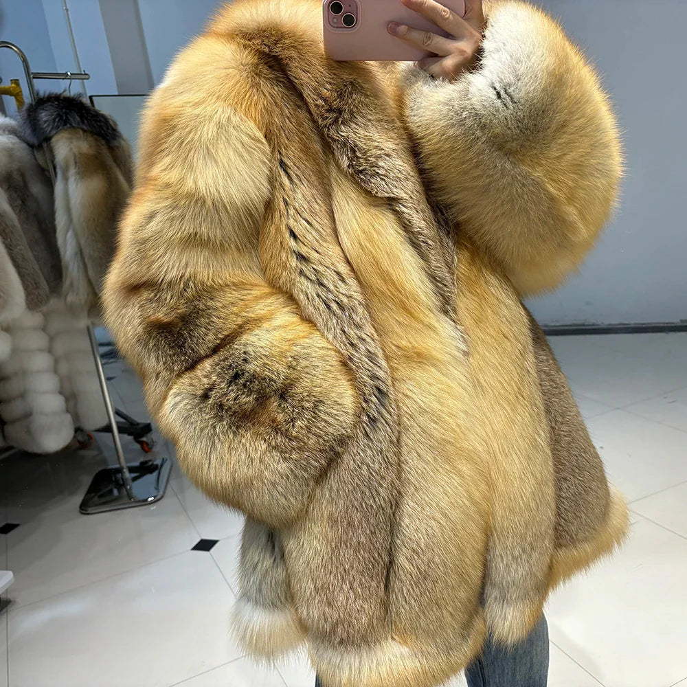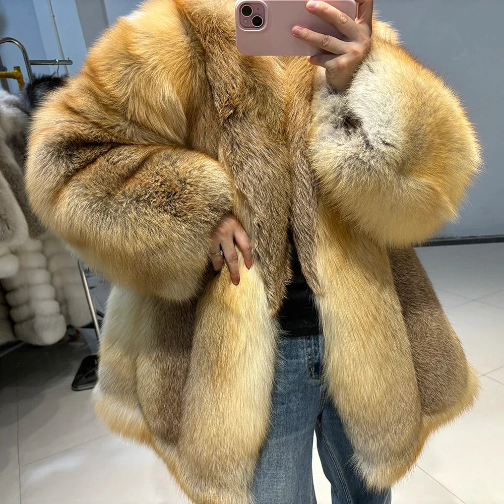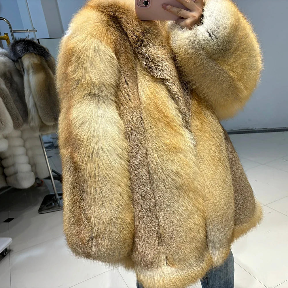 A stunning symbol of luxury. this Golden Fox Fur coat is crafted from 100% genuine fox fur. making it the ultimate cozy luxury piece for your wardrobe.