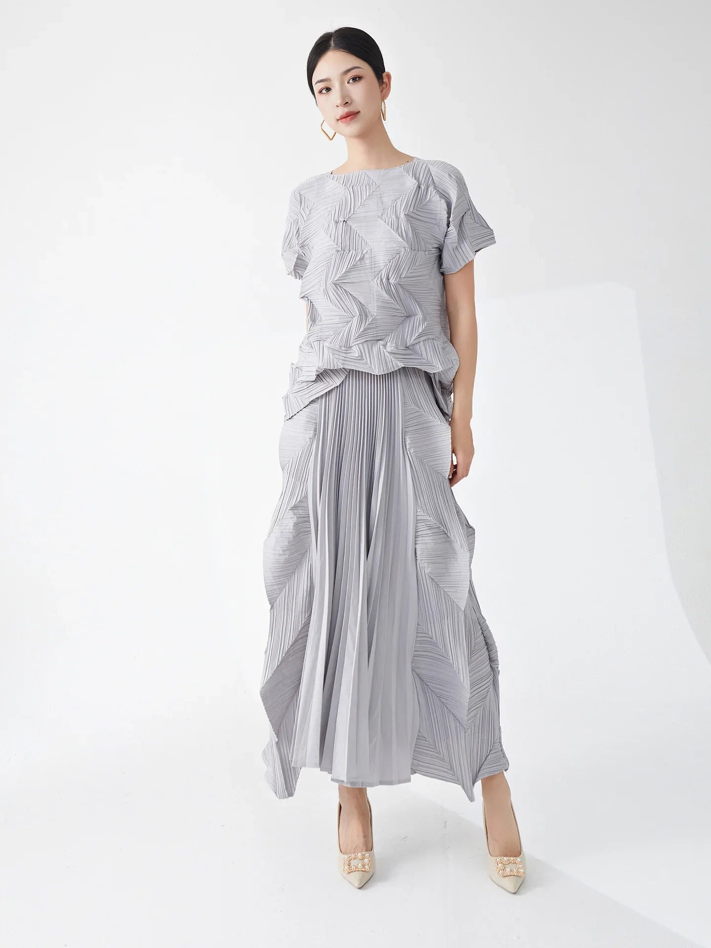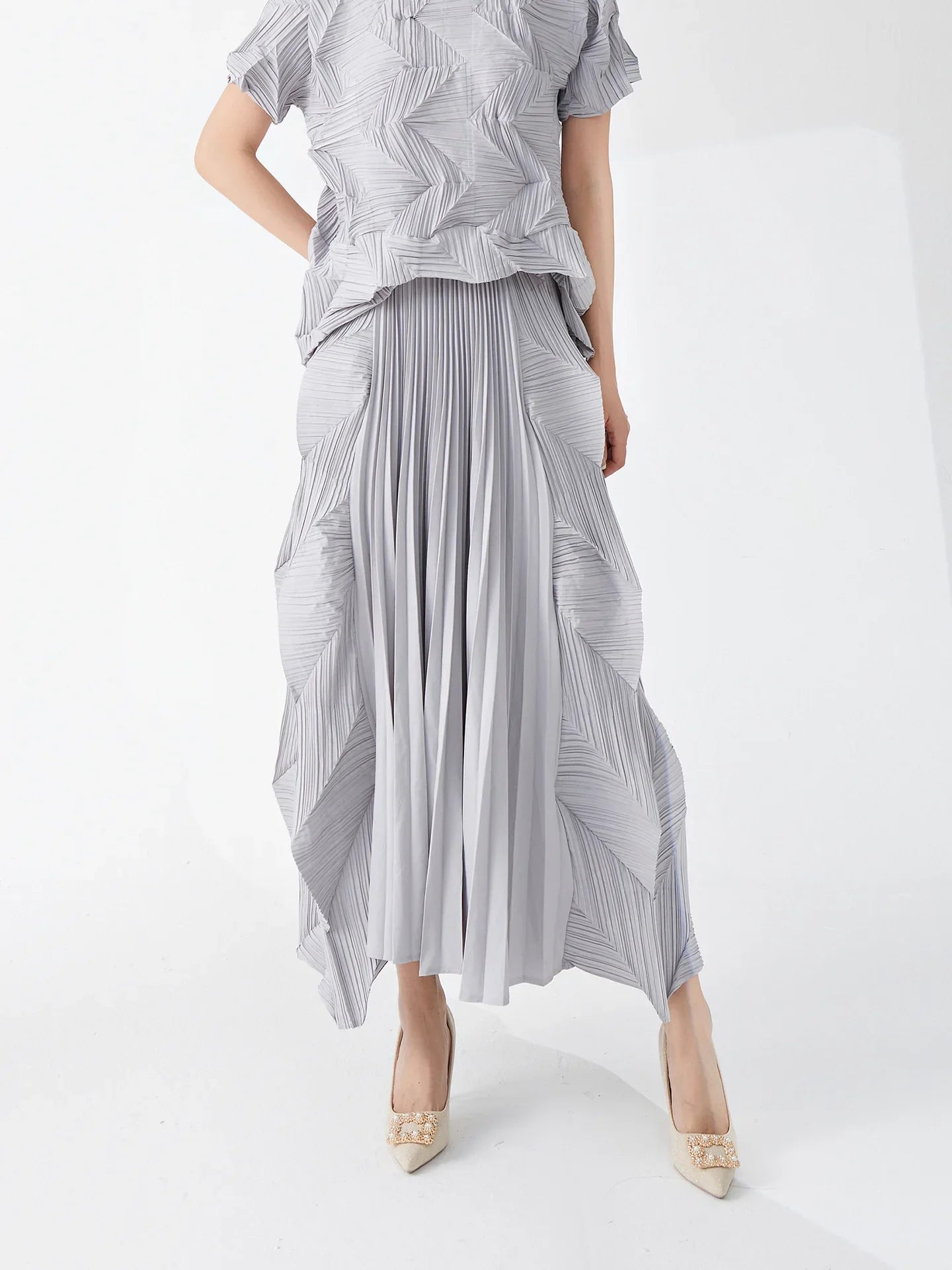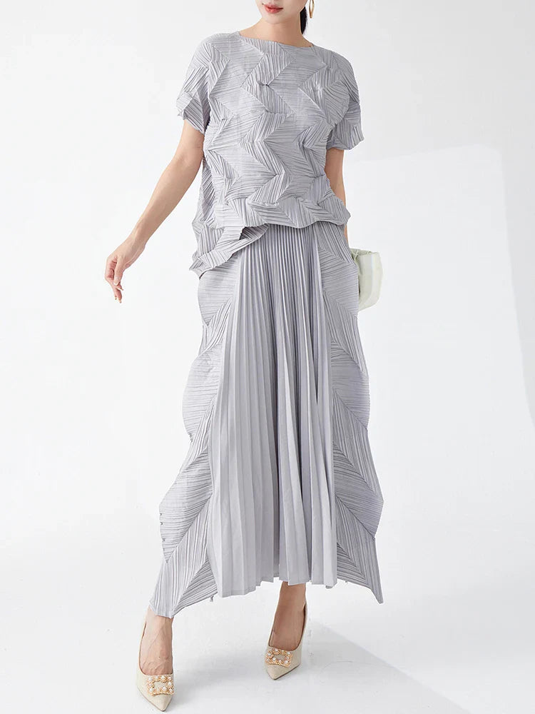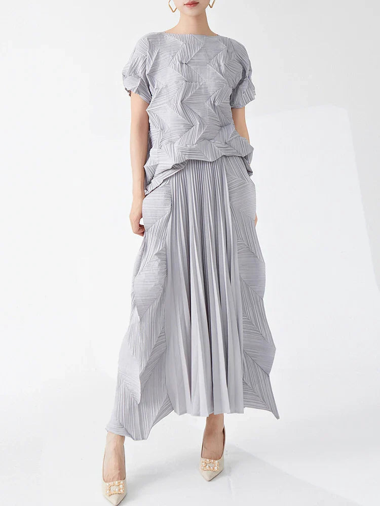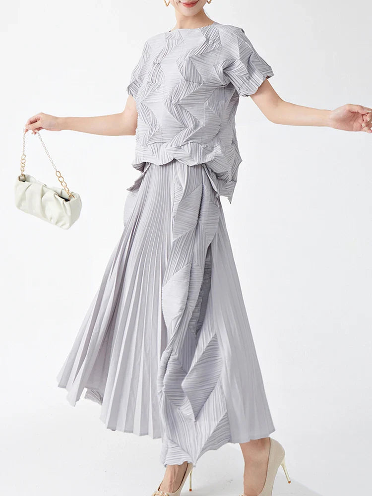 A true fusion of elegance and artistry. this set features a short sleeve top with geometric pleats and a midi-length pull-on skirt. The skirt's elastic waistband ensures a comfortable fit. while the genuine pleats add texture and sophistication.