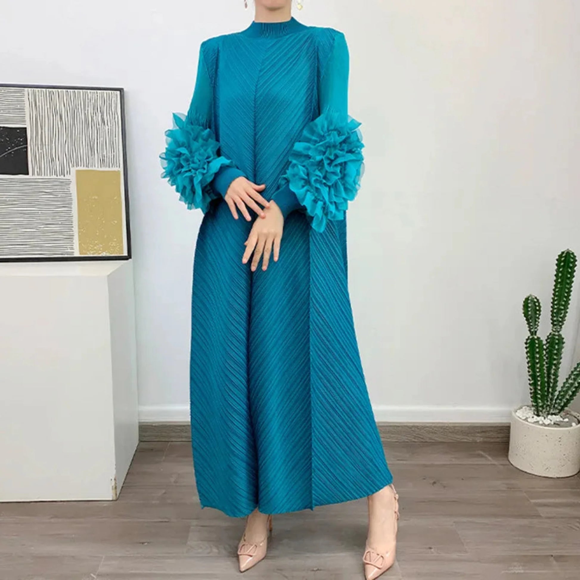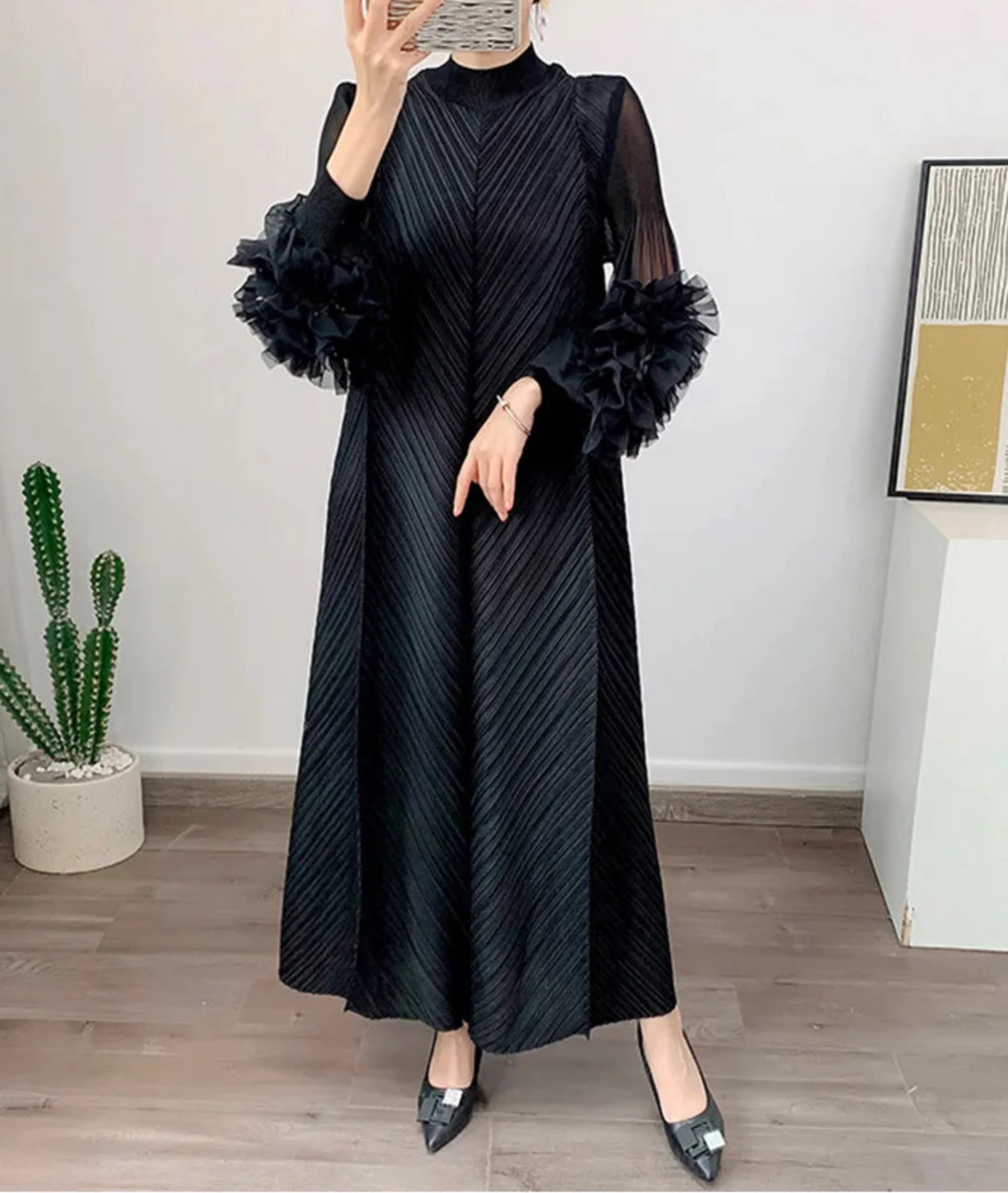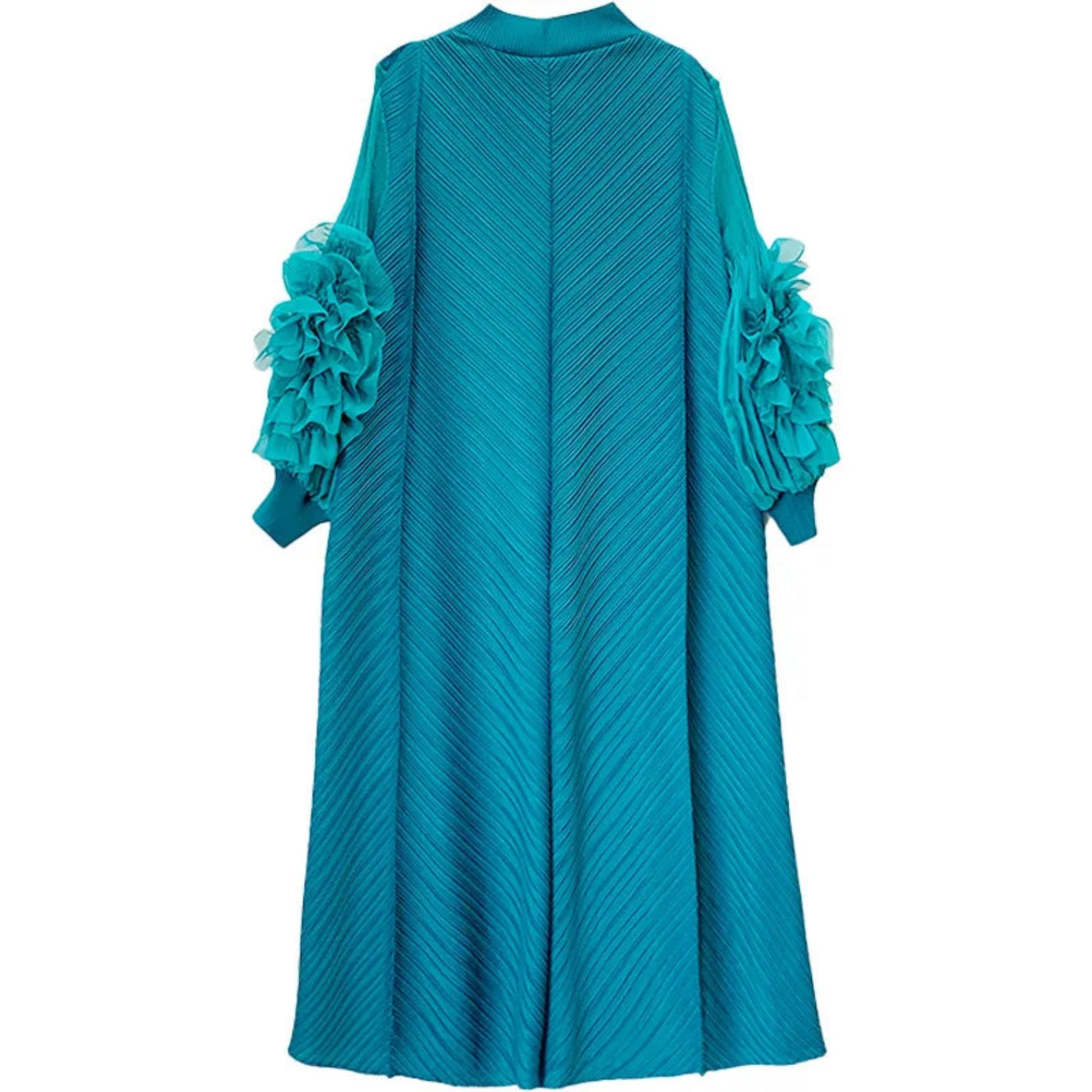 This Japanese Plissé Pleated Midi Dress combines artistry and elegance with delicate pleats and ruffled sleeves shaped like flowers. Designed with long sleeves and a flattering silhouette. it offers a unique. sophisticated style perfect for any refined occasion.