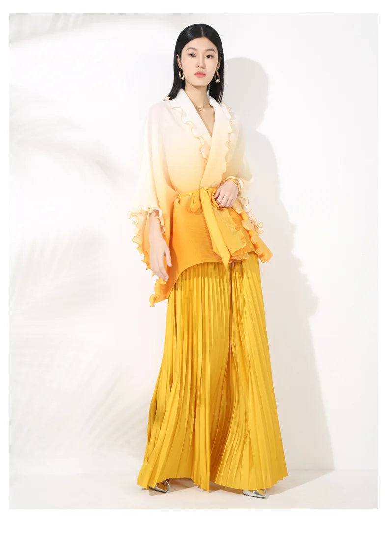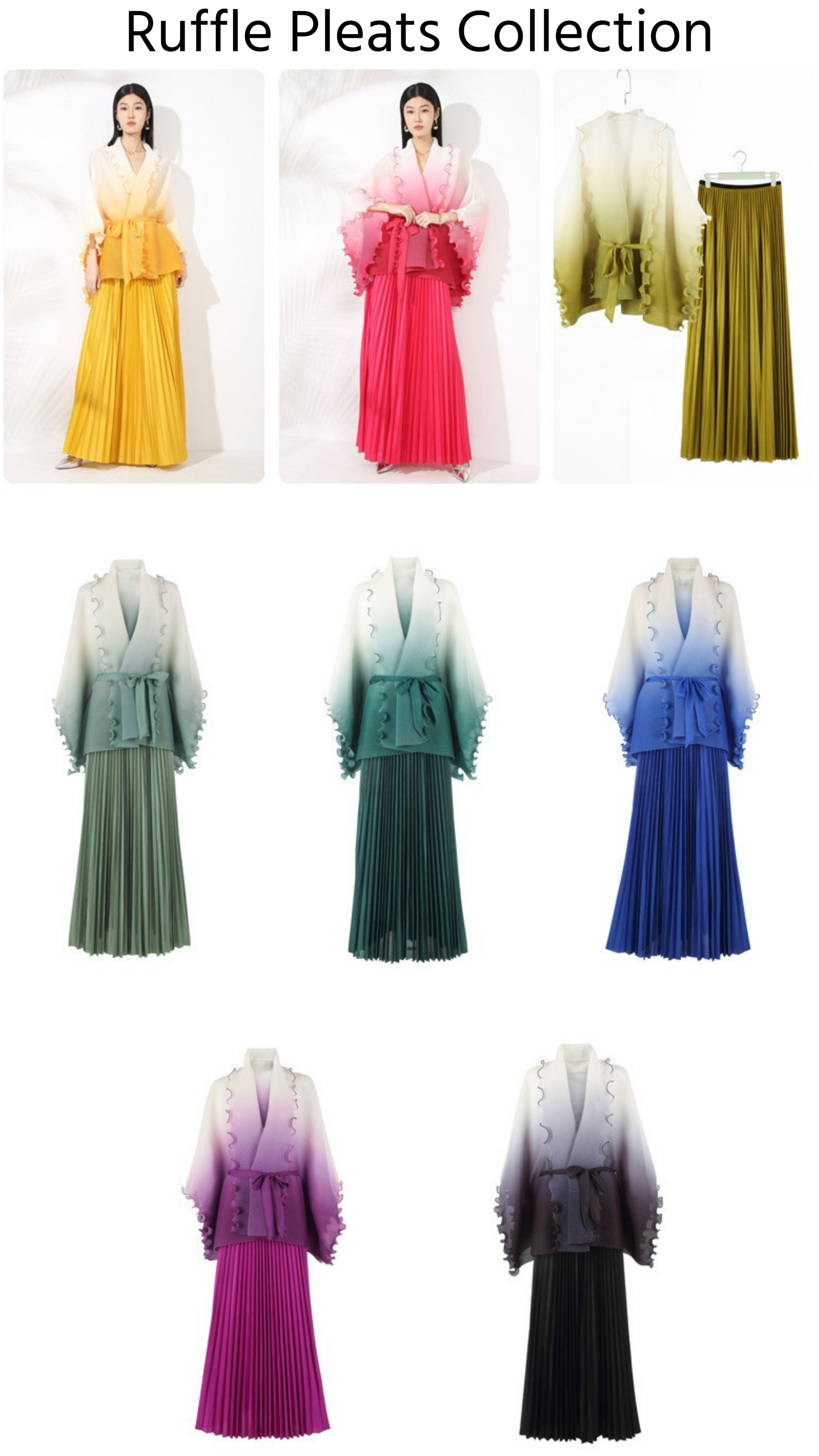 A refined fusion of elegance and ease. this set features a flowing kimono-sleeve pleated top and a matching plissé midi skirt