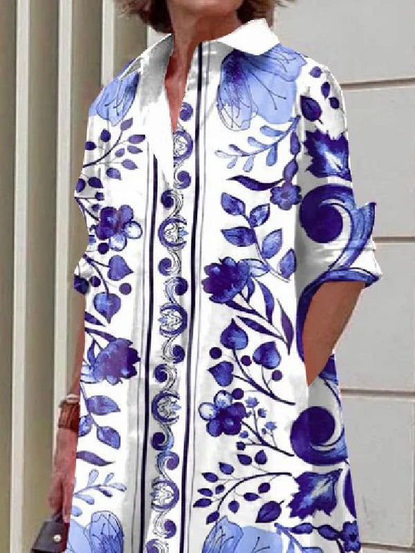 Long Sleeves Floral Printed Lapel Midi Dresses