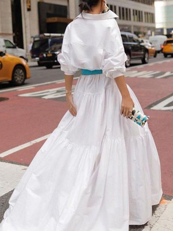 Long Sleeves Loose Belted Pleated Solid Color Lapel Maxi Dresses