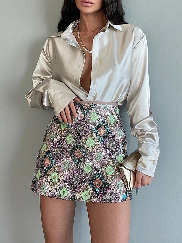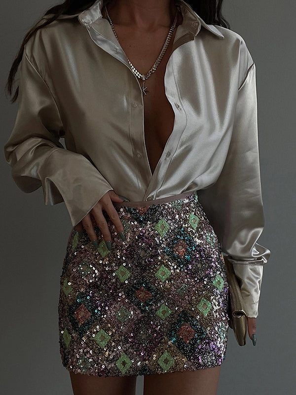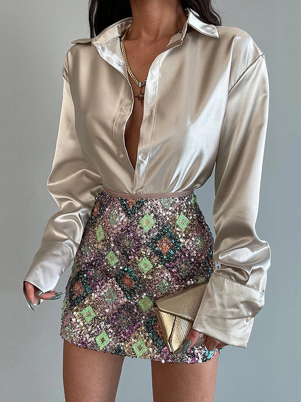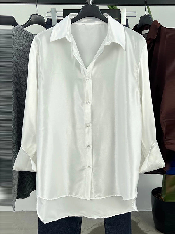 Long Sleeves Loose Buttoned Shiny Solid Color Lapel Blouses&Shirts Tops