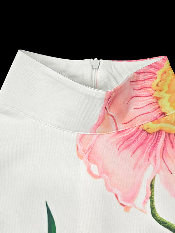 Long Sleeves Loose Flower Print High Neck Midi Dresses