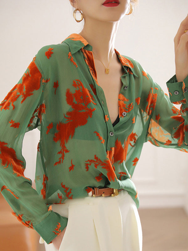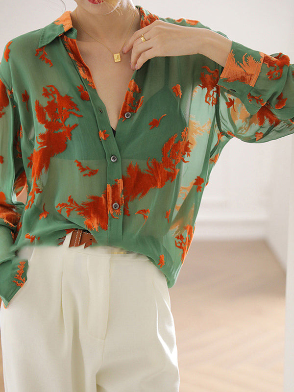 Long Sleeves Printed See-Through Lapel Blouses&Shirts Tops