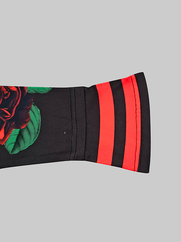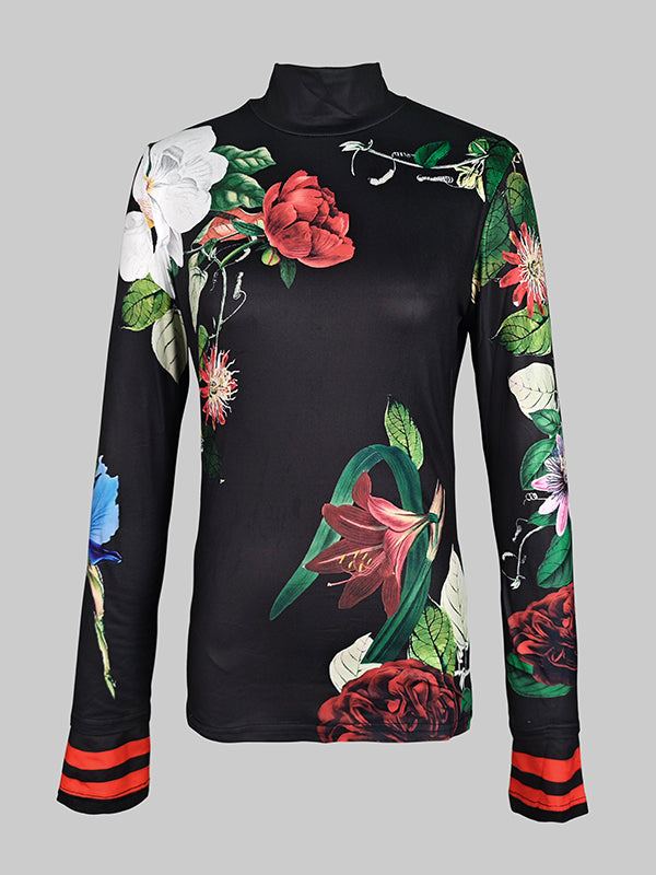 Long Sleeves Skinny Floral Printed Split-Joint High Neck T-shirts