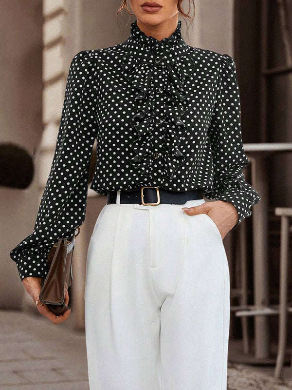 Loose Puff Sleeves Floral Pleated Polka-Dot Split-Joint Stand Collar Blouses