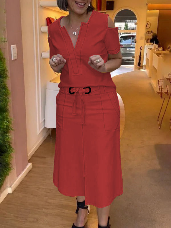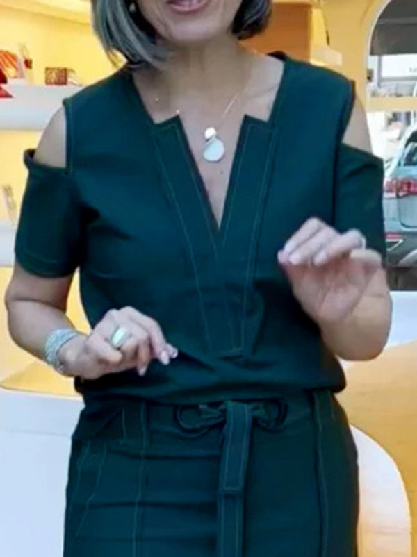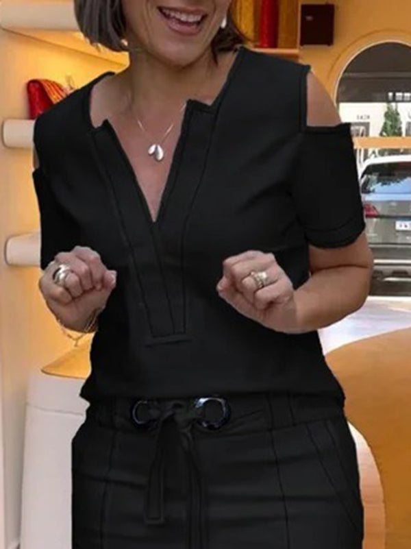 Loose Short Sleeves Solid Color Split-Joint Cold Shoulder Blouses&Shirts Tops