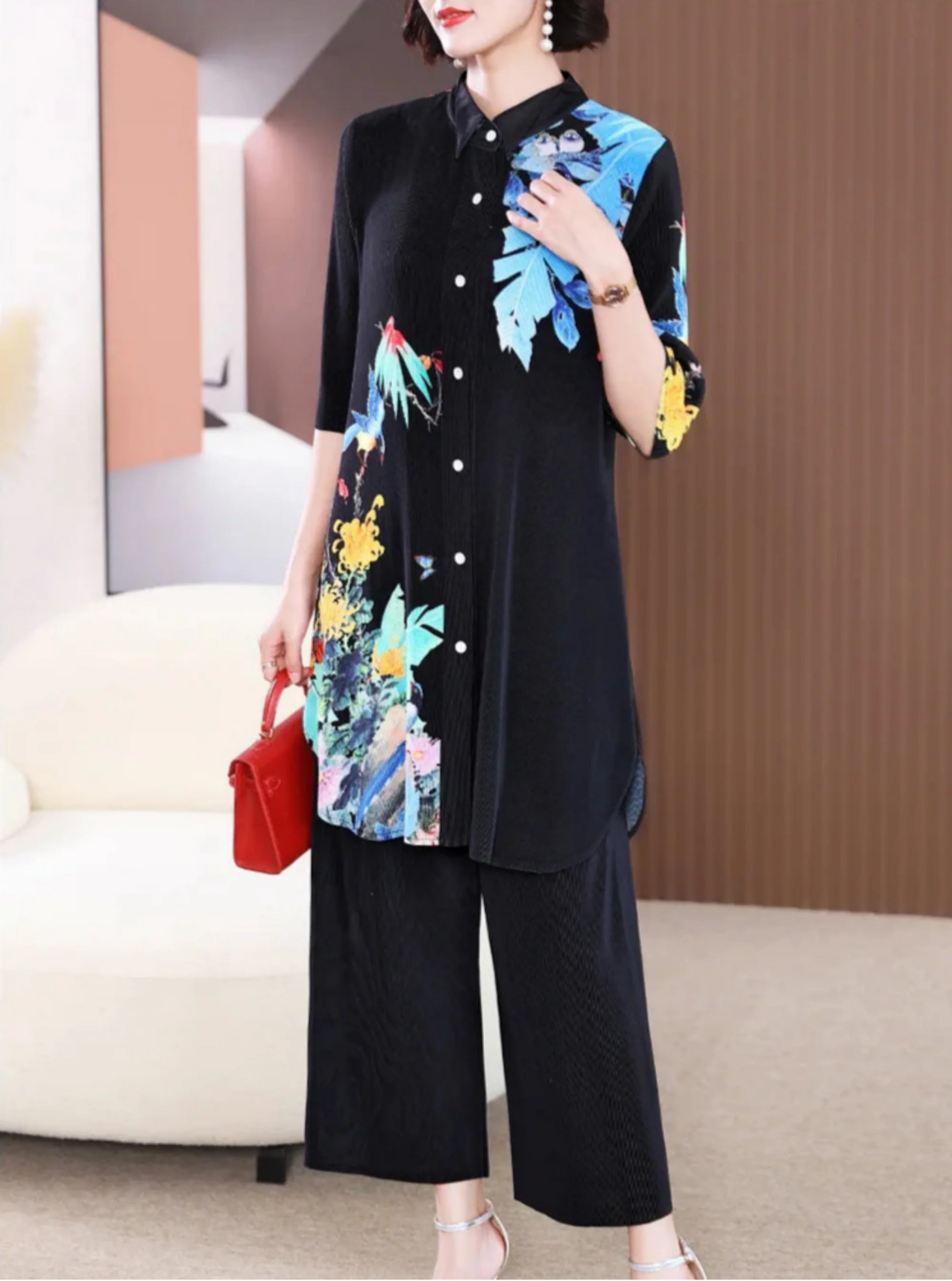 This luxurious botanical print 2-piece set combines a short-sleeve button-up blouse and matching pleated trousers. The pull-on pants with an elastic waistband ensure comfort. while the elegant design offers a stylish and unique look.