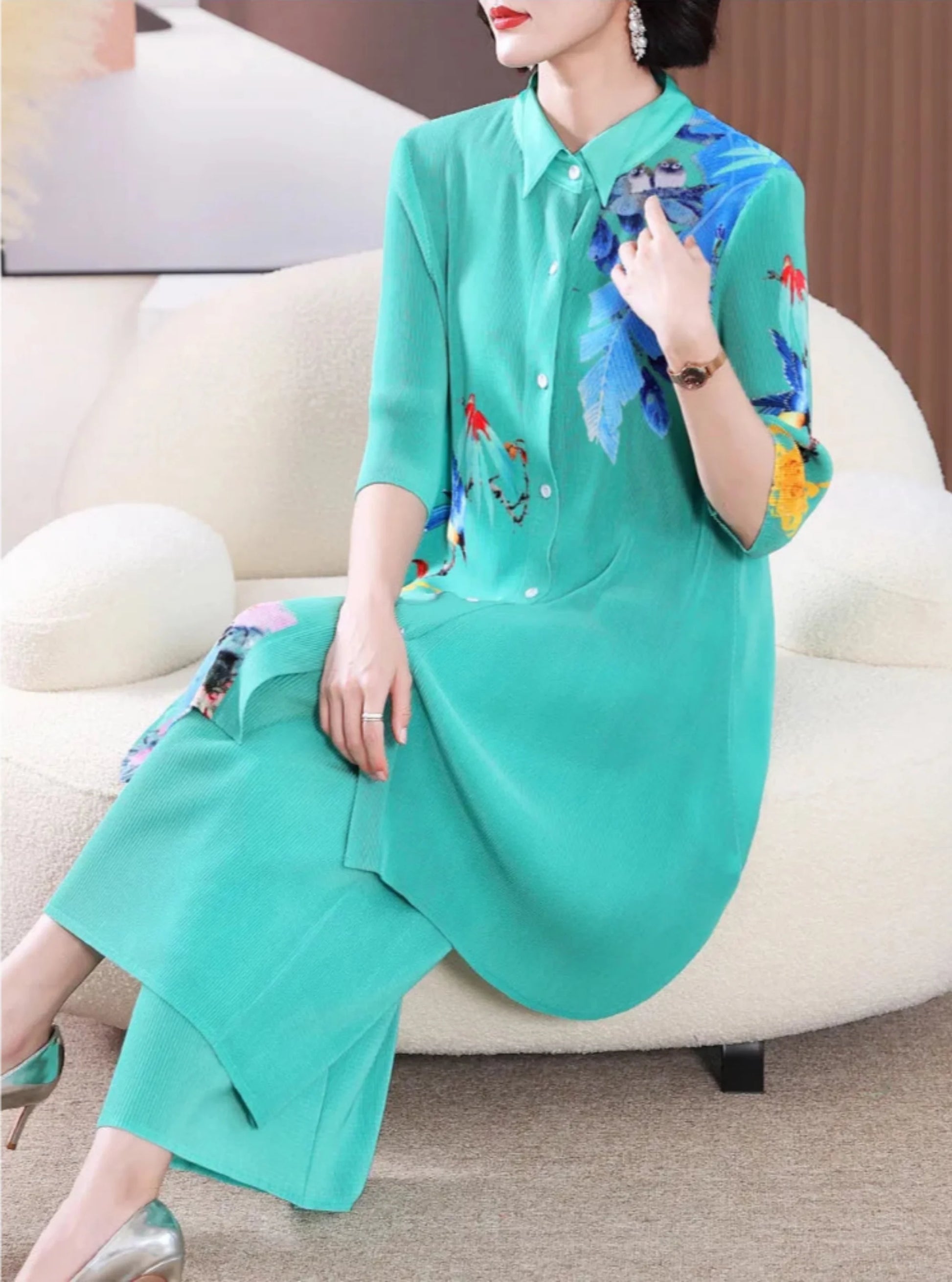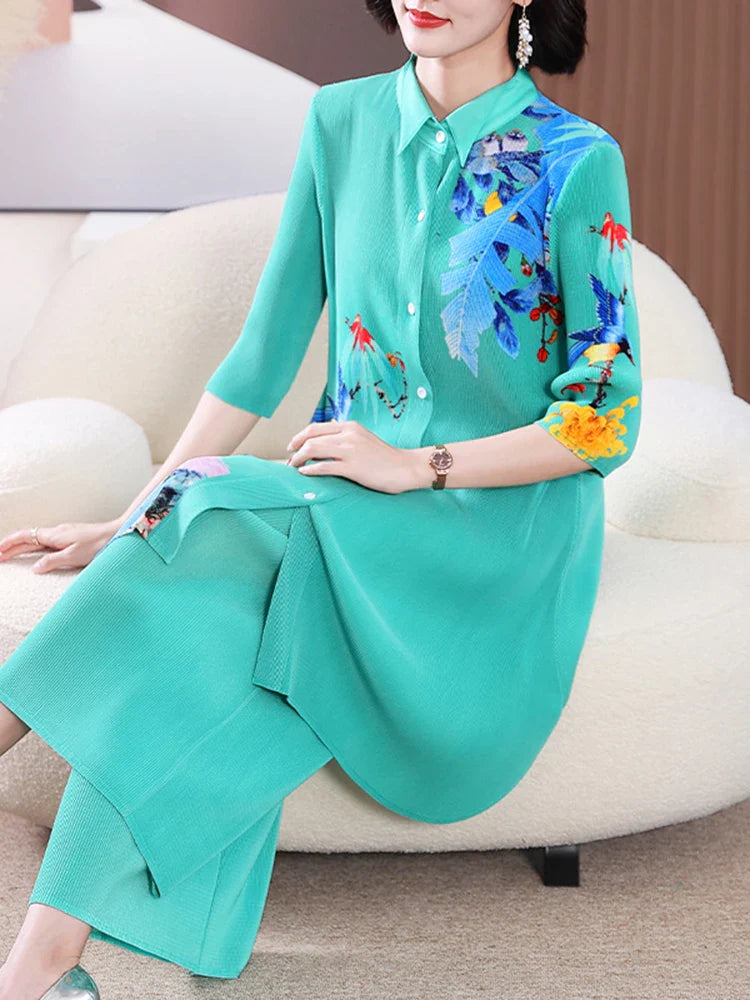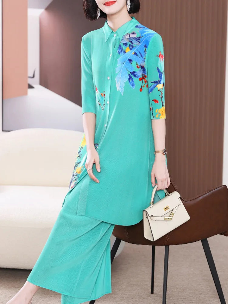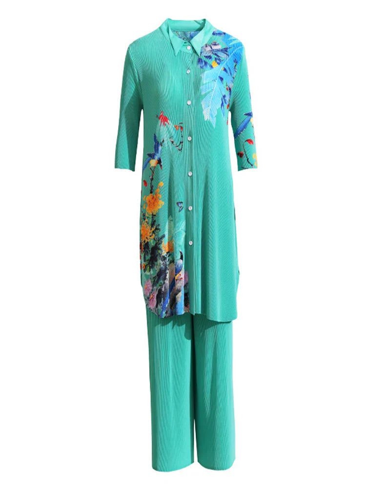 Luxe Botanical Print Pleated Tunic & Trouser Set
