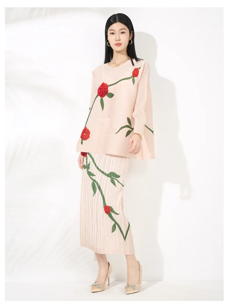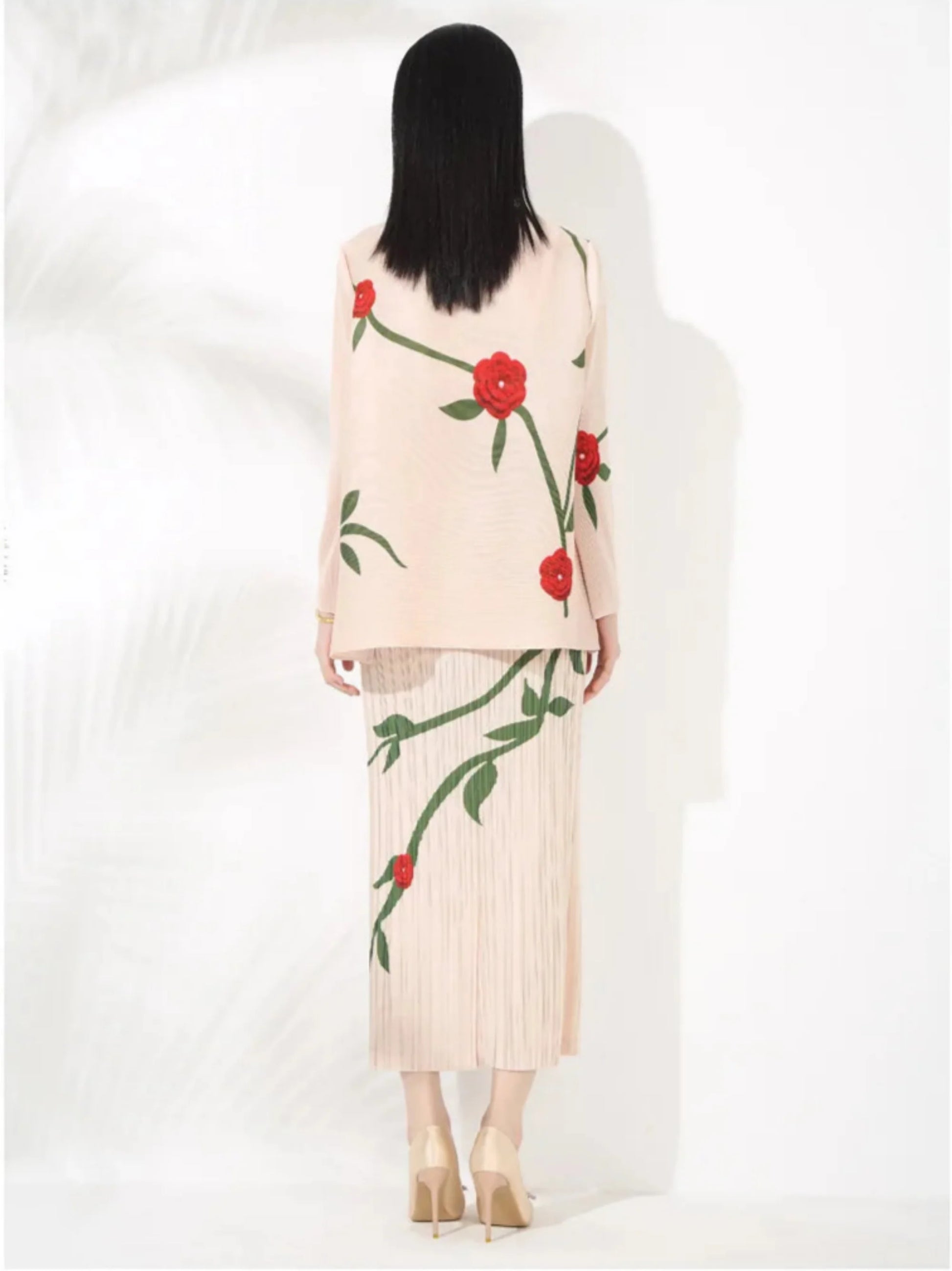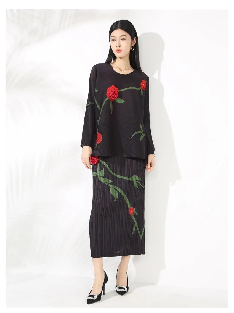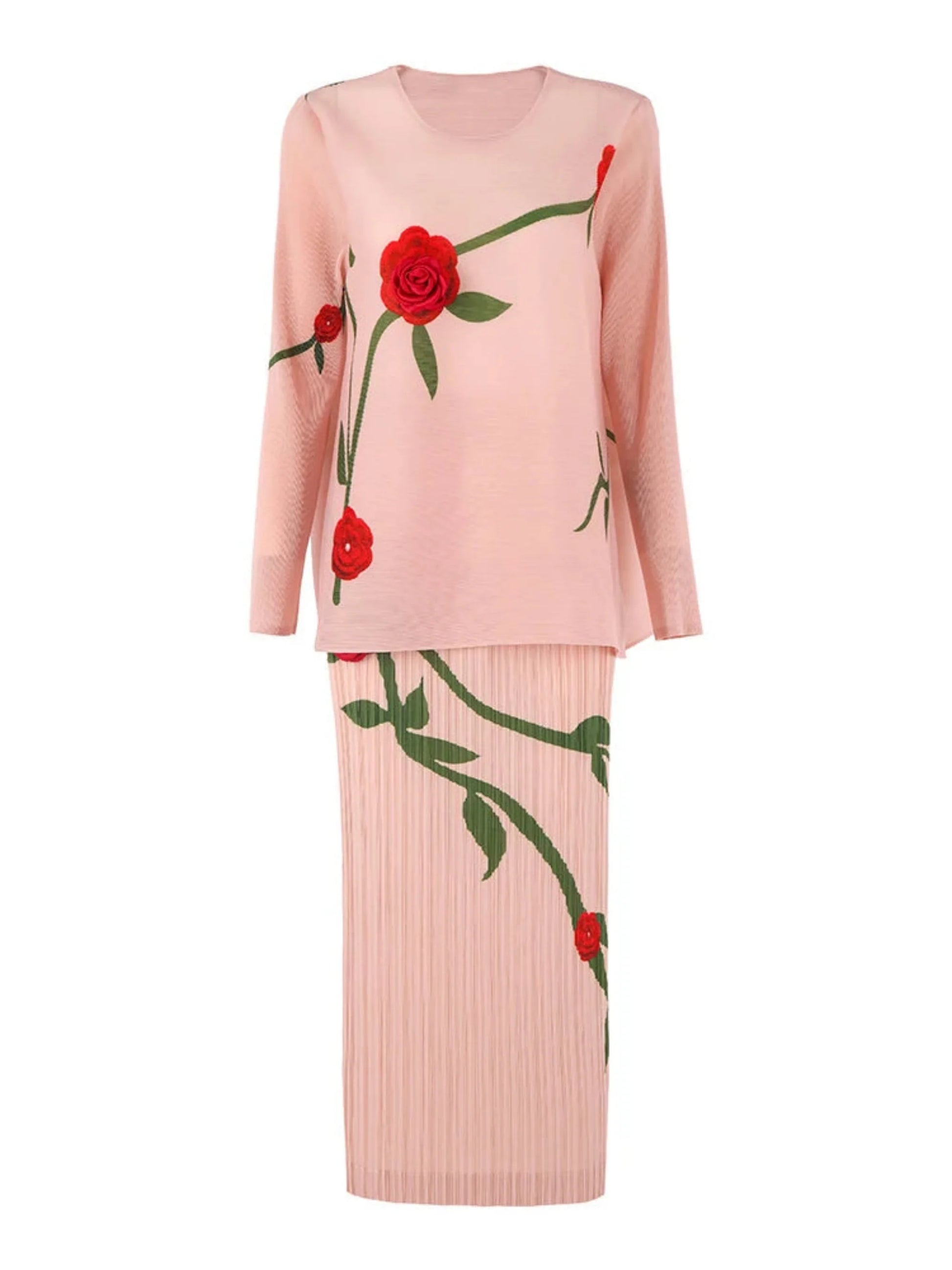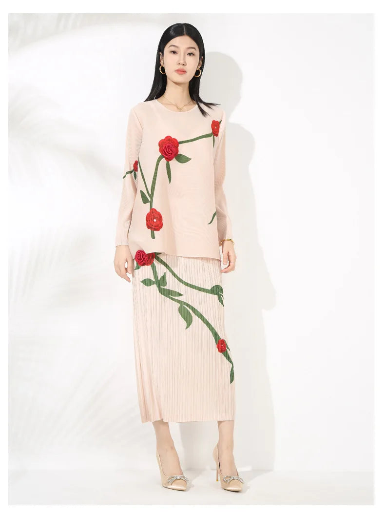 Luxe Feminine Rose Top & Pleated Skirt Set
