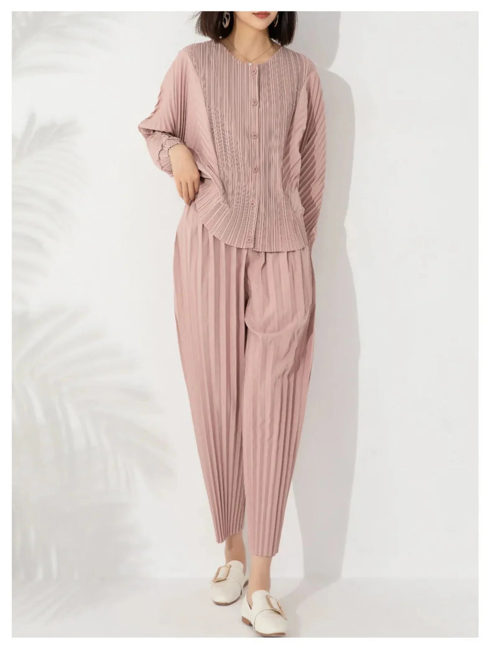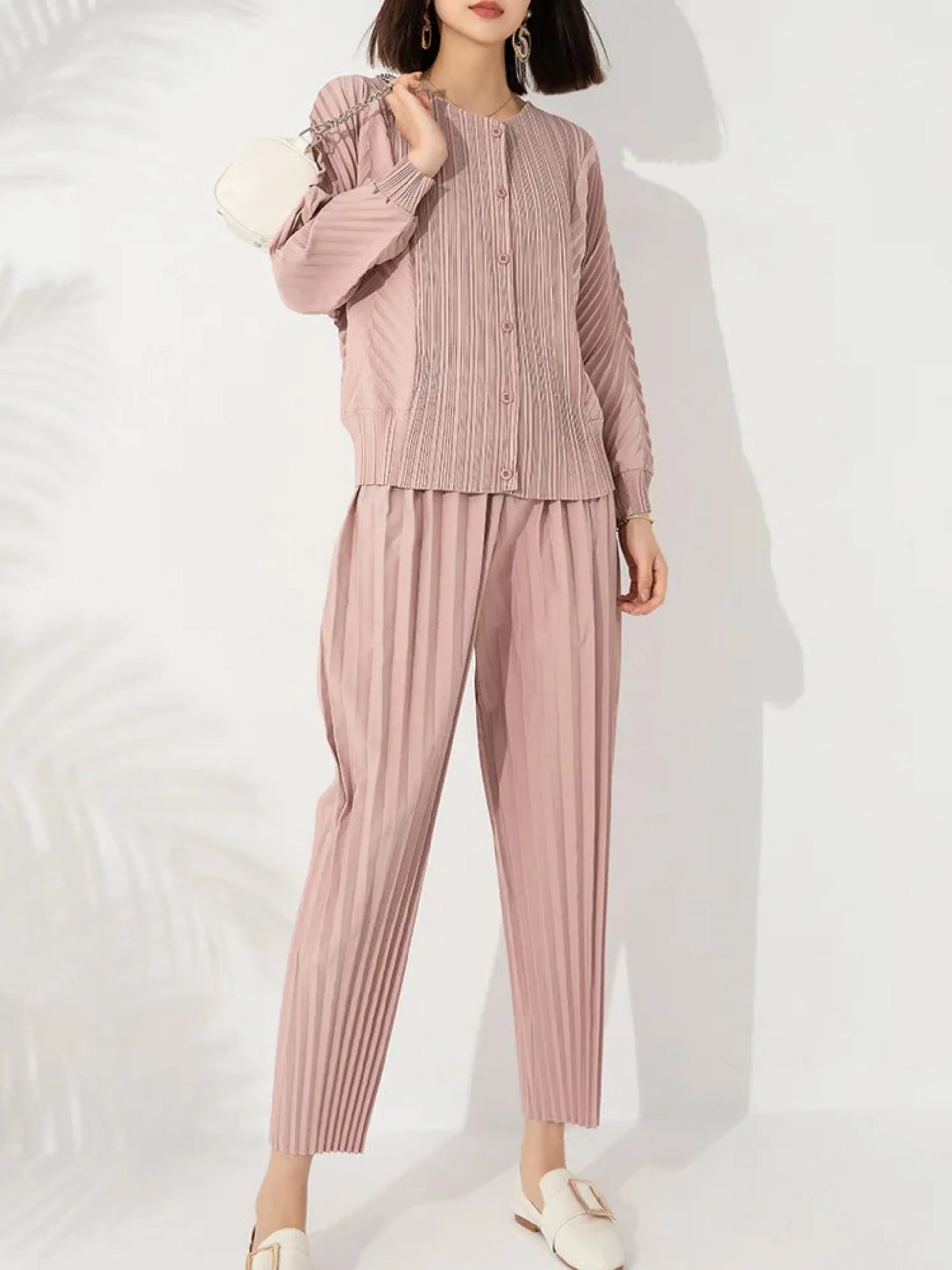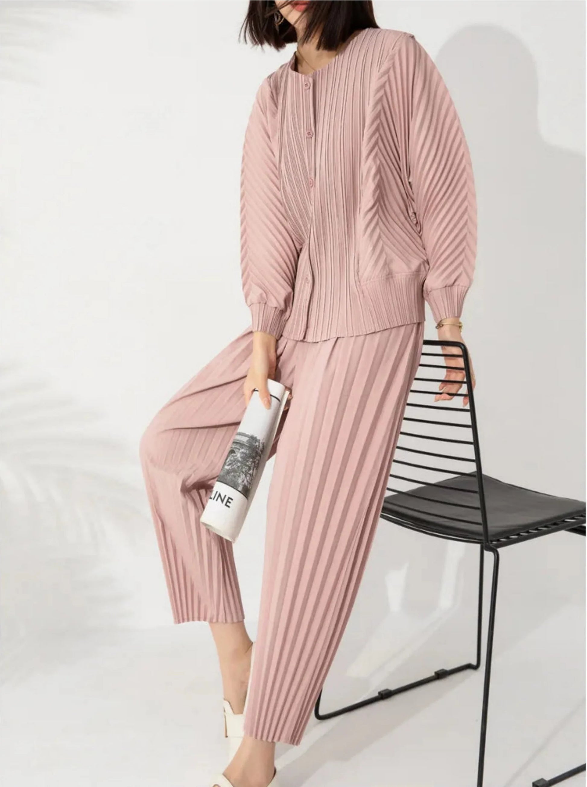 This Japanese-inspired pleated set combines luxury and comfort. bringing timeless elegance to your wardrobe. With a tailored button-up cardigan top and stylish pull-on pants. it creates a relaxed yet refined silhouette.