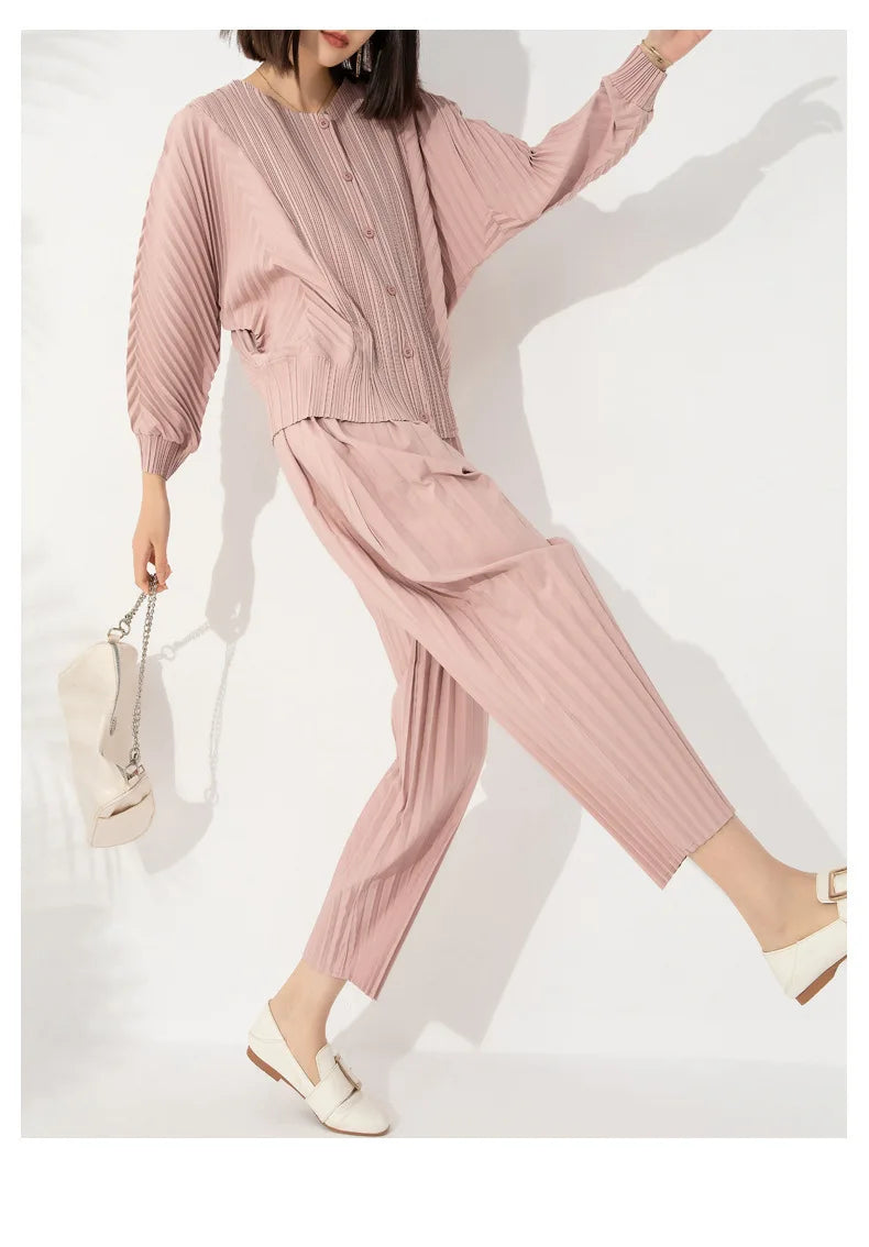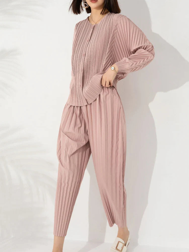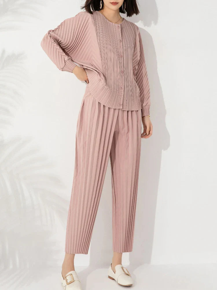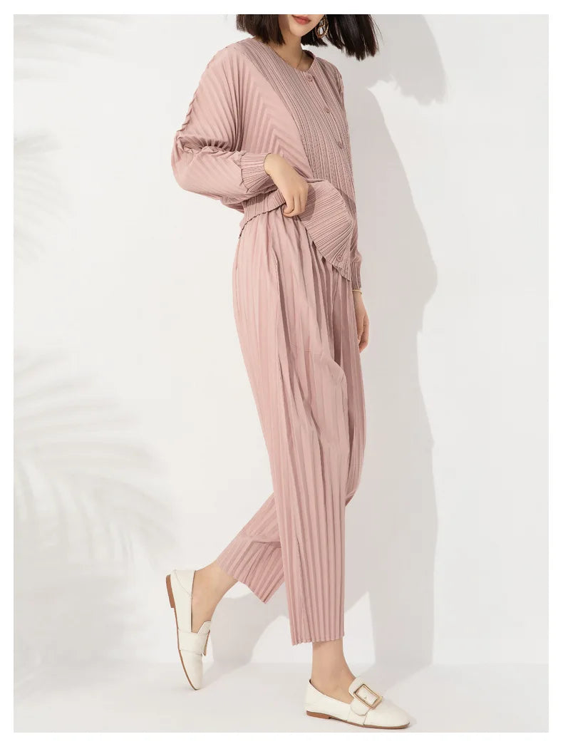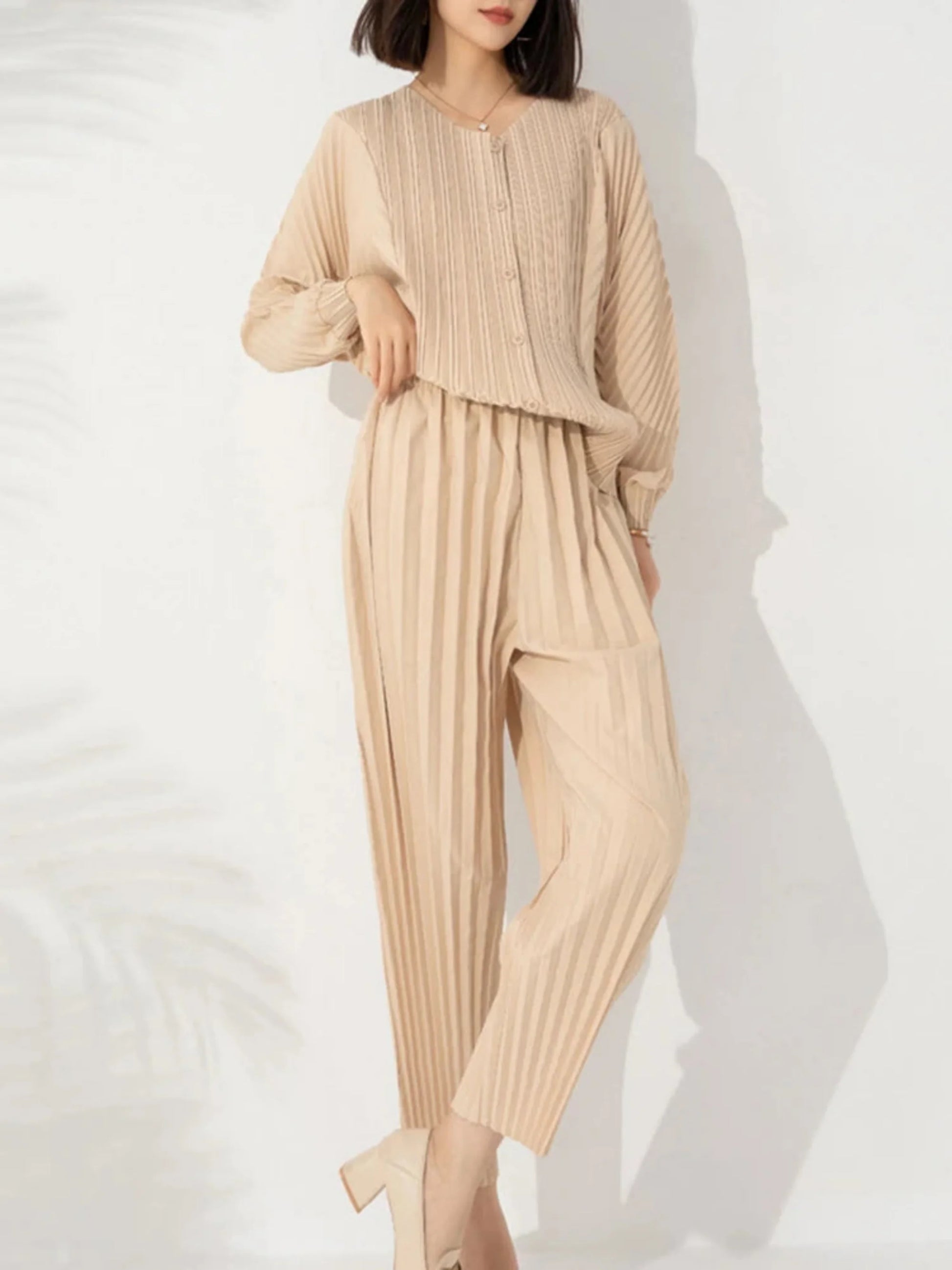 This Japanese-inspired pleated set combines luxury and comfort. bringing timeless elegance to your wardrobe. With a tailored button-up cardigan top and stylish pull-on pants. it creates a relaxed yet refined silhouette.