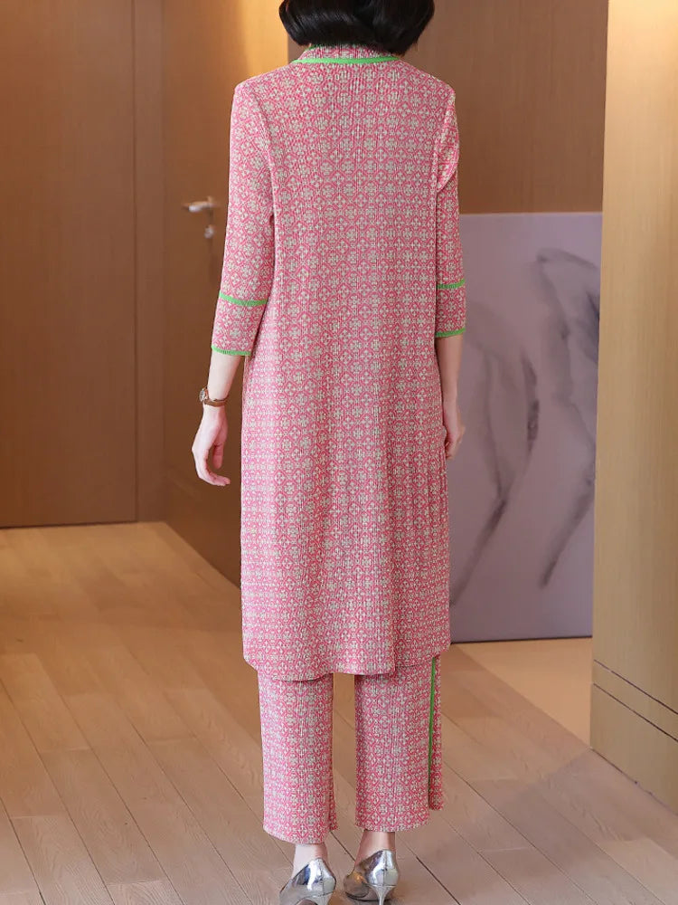 This luxe plissé pleated set offers effortless sophistication. The tunic top drapes beautifully. while the pull-on pants with an elastic waistband provide comfort and style.