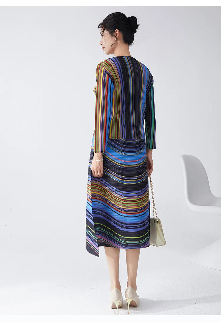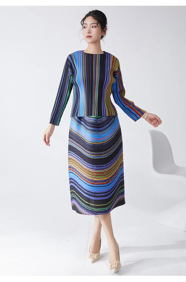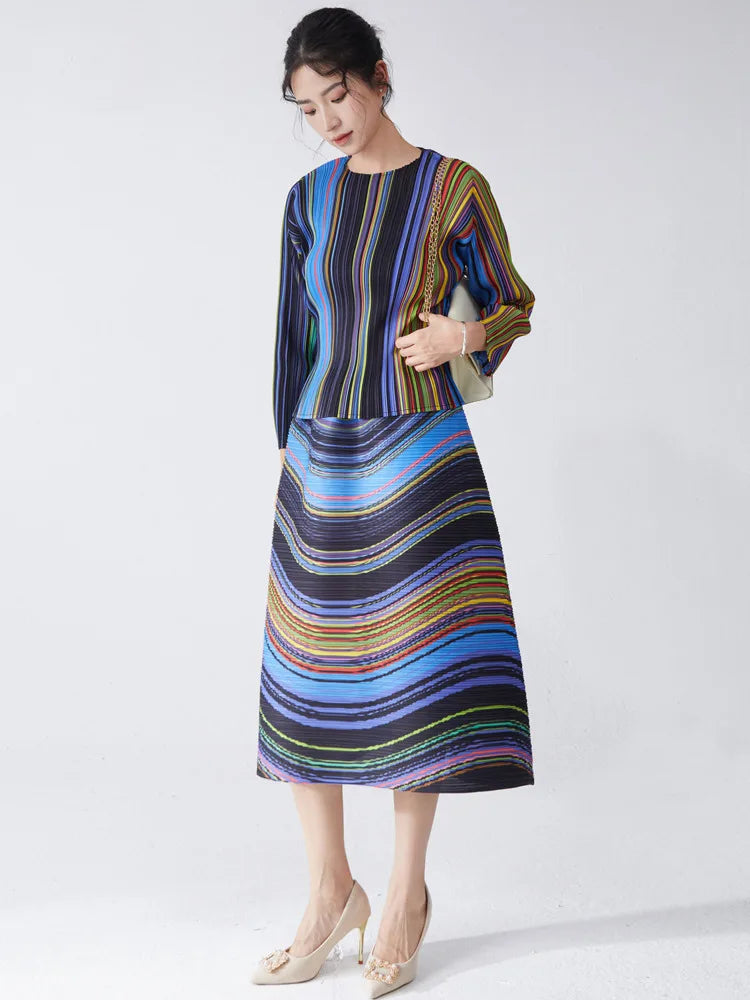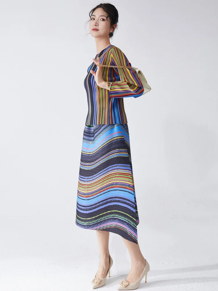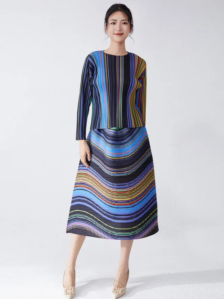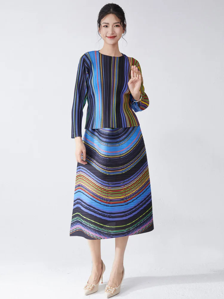 A striking blend of color and elegance. this 2-piece set features vibrant blue-striped pleats for a sophisticated yet comfortable look. The premium pleats and elastic waistband offer versatility. transitioning seamlessly from casual to formal occasions.
