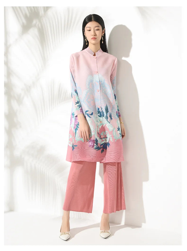 This 2-piece matching set features a long-length blouse and wide-leg pants for an effortlessly chic look. The premium pleats add texture and elegance. while the elastic waistband ensures a comfortable. pull-on fit