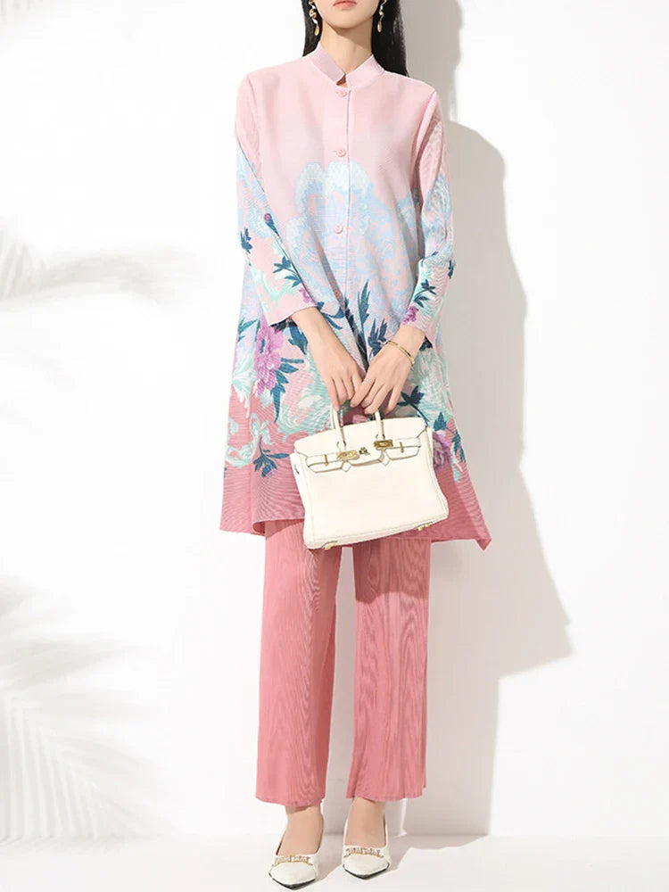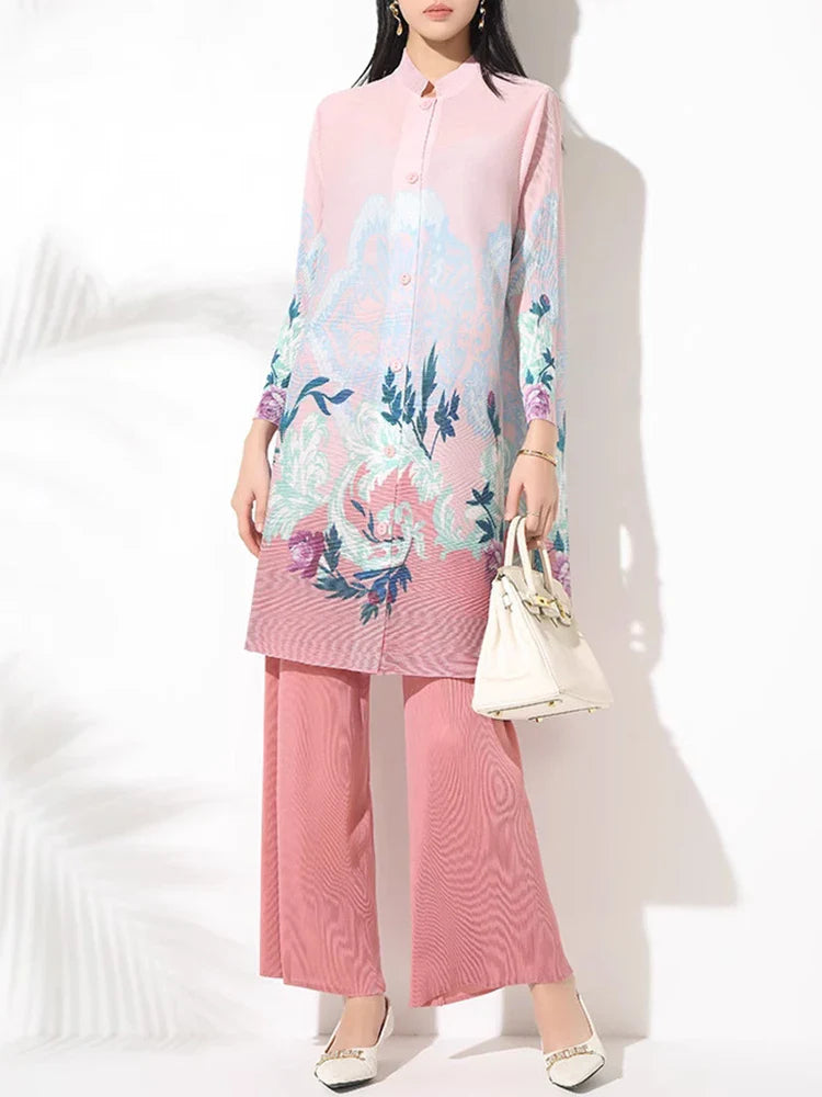Luxury Floral Pleated Blouse & Wide-Leg Pant Set