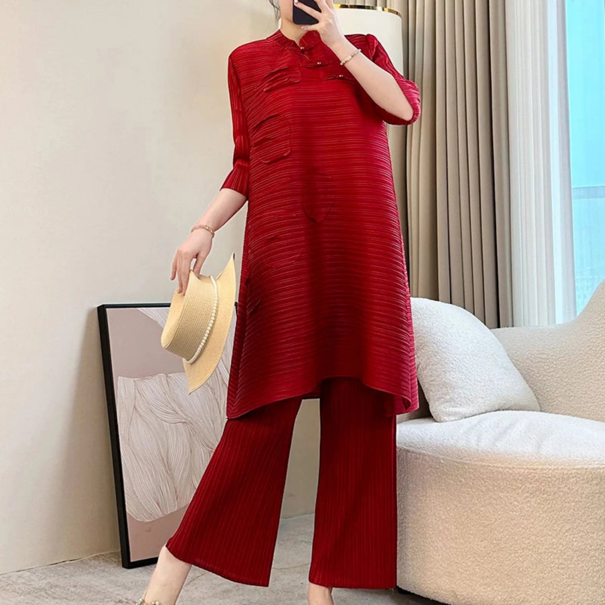 For women who crave bold. elegant fashion with zero compromise on comfort. This striking red 2-piece matching set blends soft structure with easy movement for a polished look that feels amazing. The pleats do all the work so you don't have to.