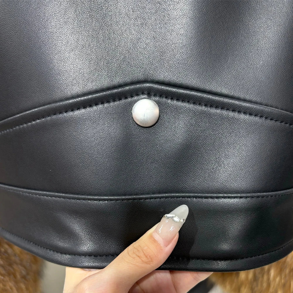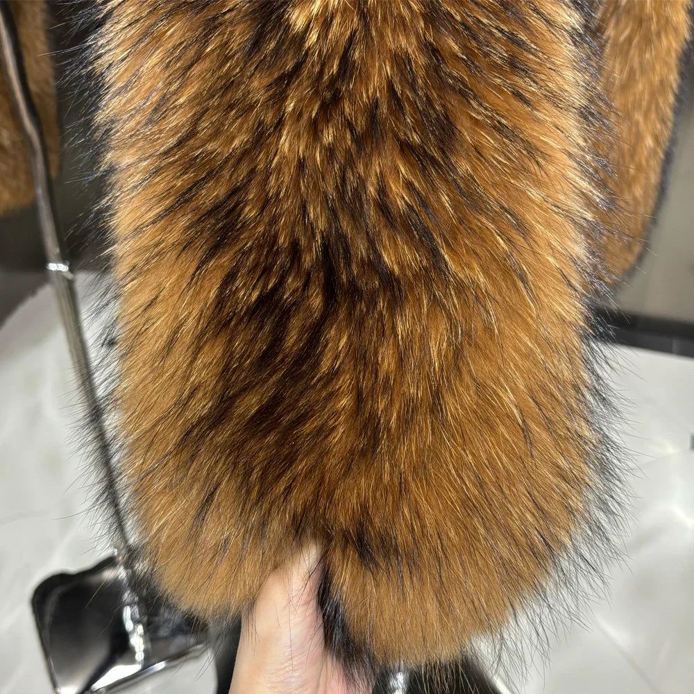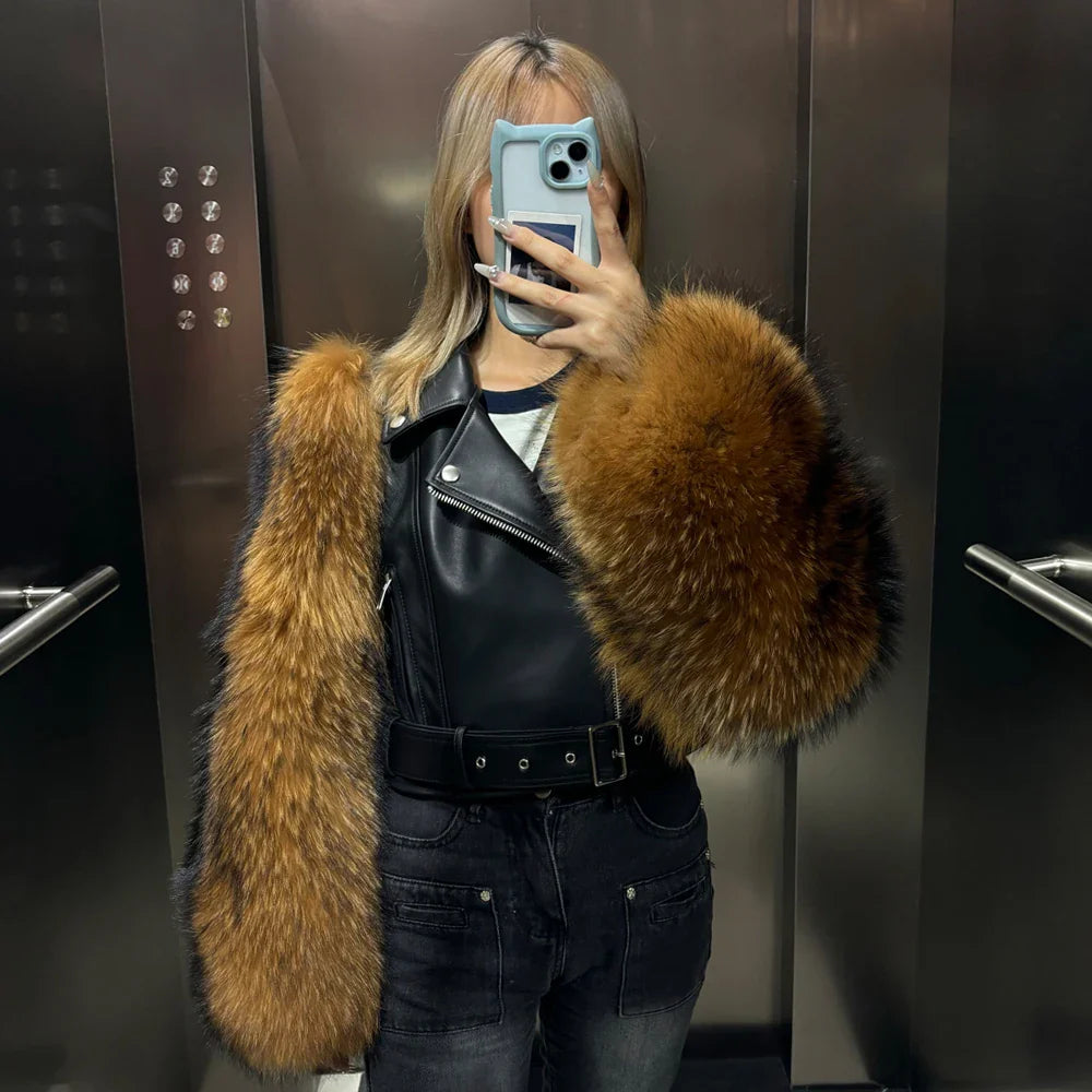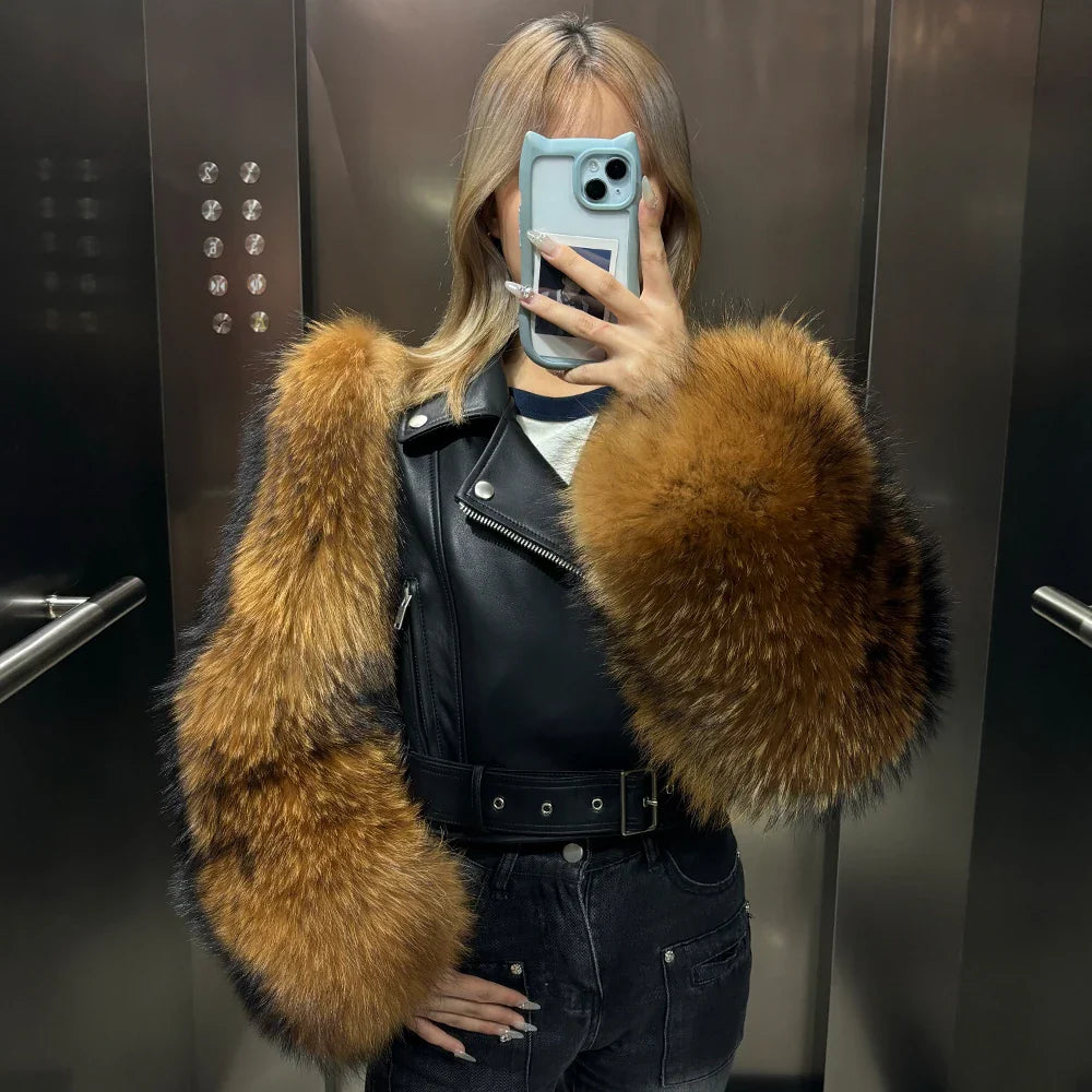 A masterpiece of modern luxury. this cropped leather jacket is crafted from sheepskin leather and suede. featuring bold red raccoon fur on the sleeves.