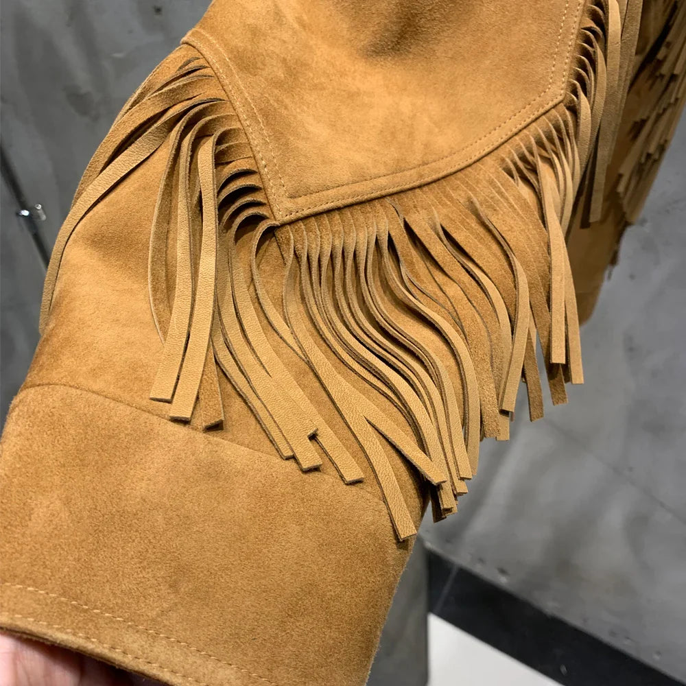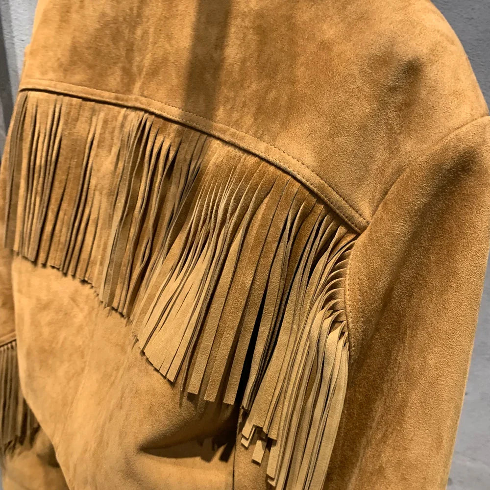 A wardrobe essential for the style-conscious. this Women's Luxury Leather & Suede Fringe Crop Jacket features a cropped silhouette with striking fringe detailing.