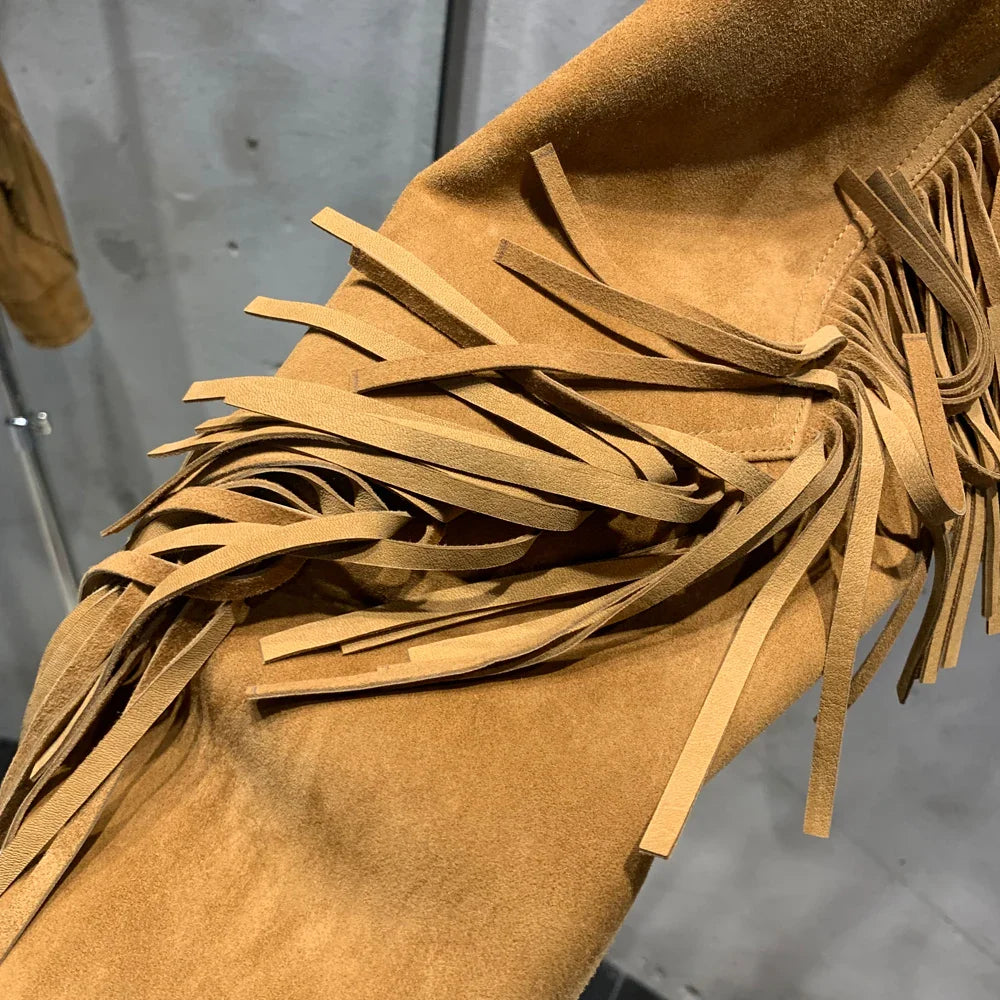 Crafted from supple 100% real sheepskin leather and luxurious suede. it's designed for a flattering. bohemian look. Styling Tip: Pair it with a flowy maxi dress and ankle boots for a chic. festival-inspired look.