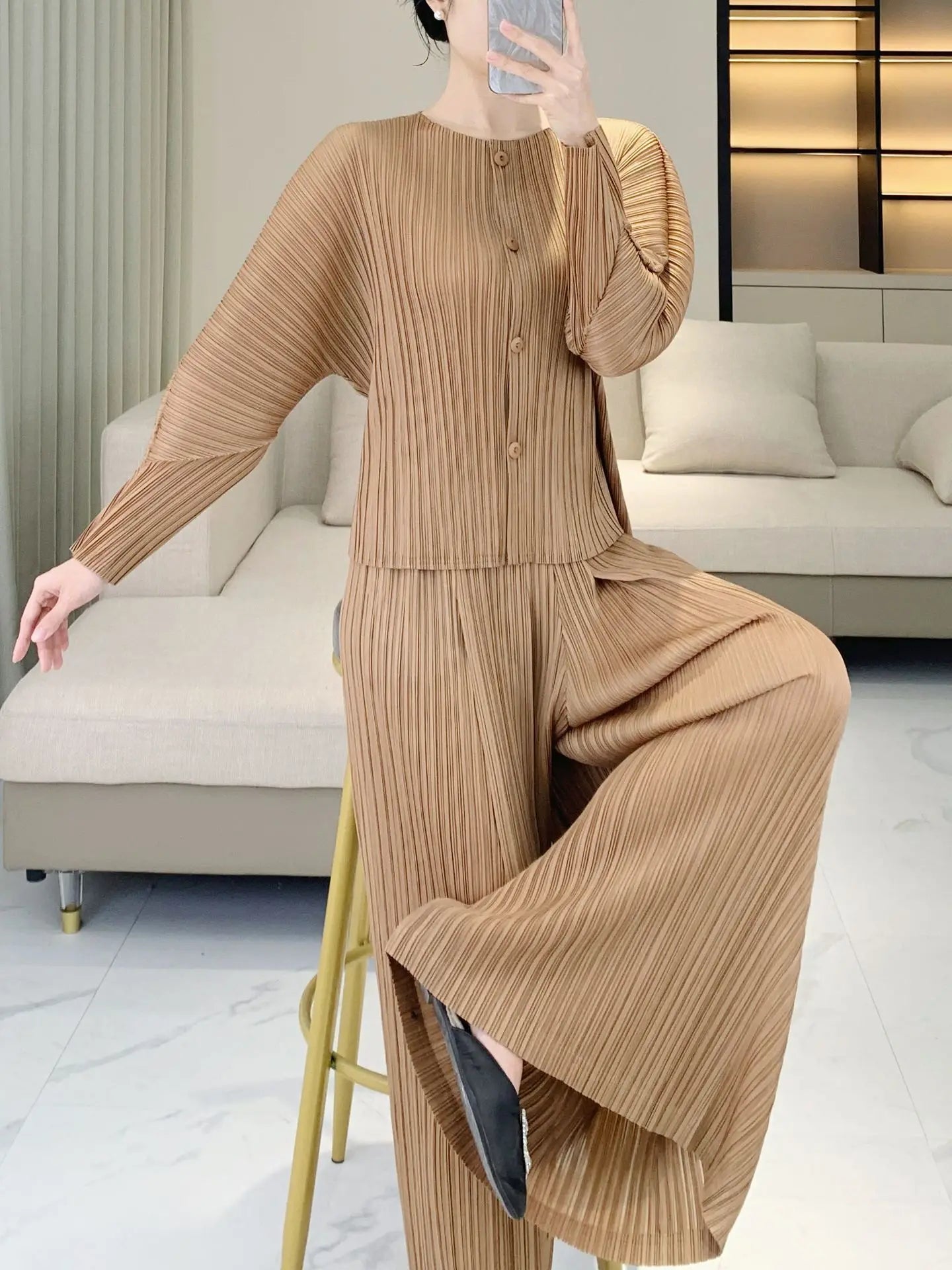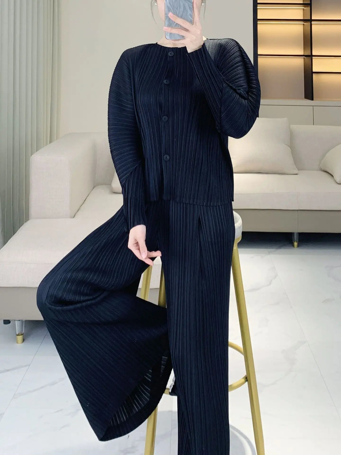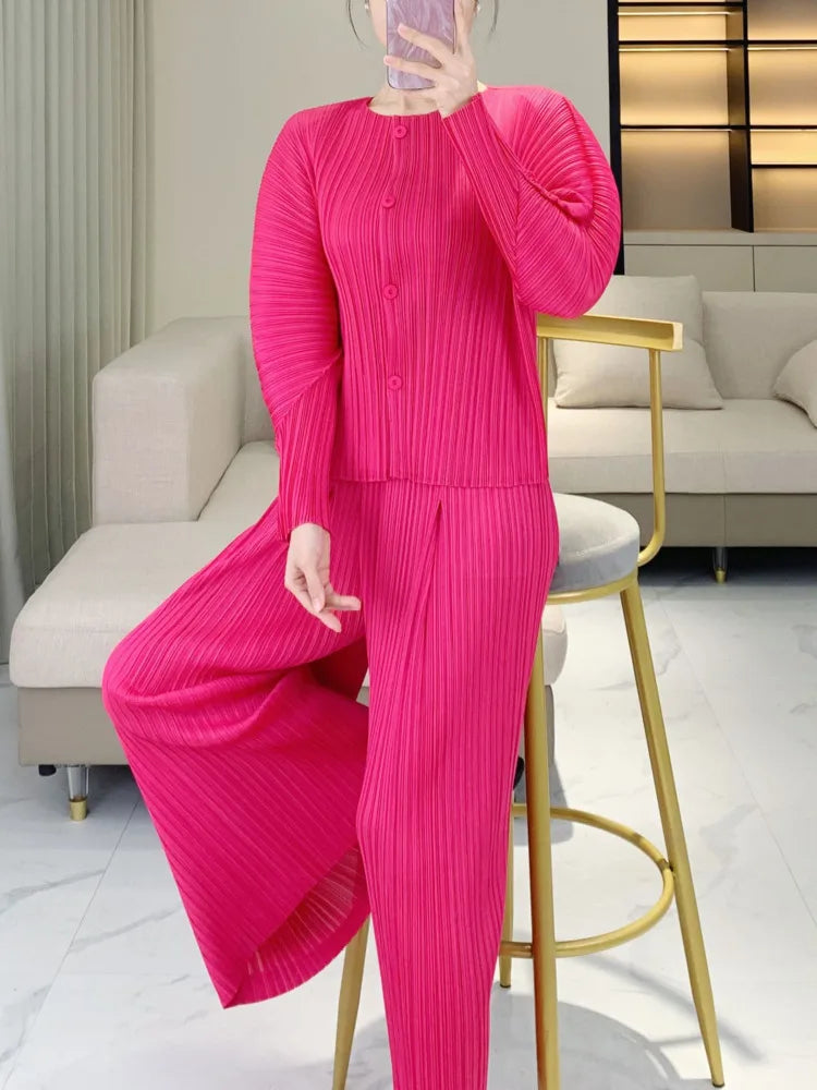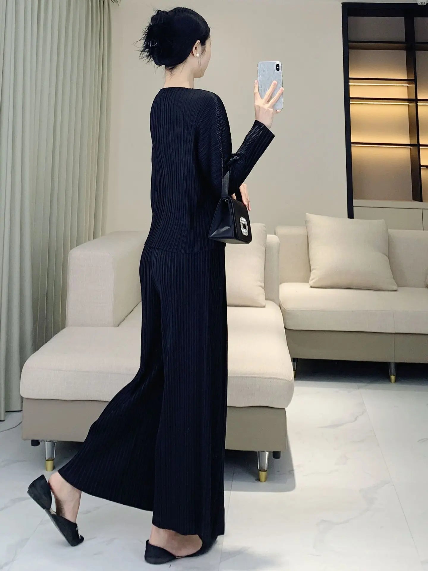 This 2-piece matching set features a long sleeve top and wide-leg pants. offering a chic. comfortable fit. The premium pleats and elastic waistband ensure both style and ease.