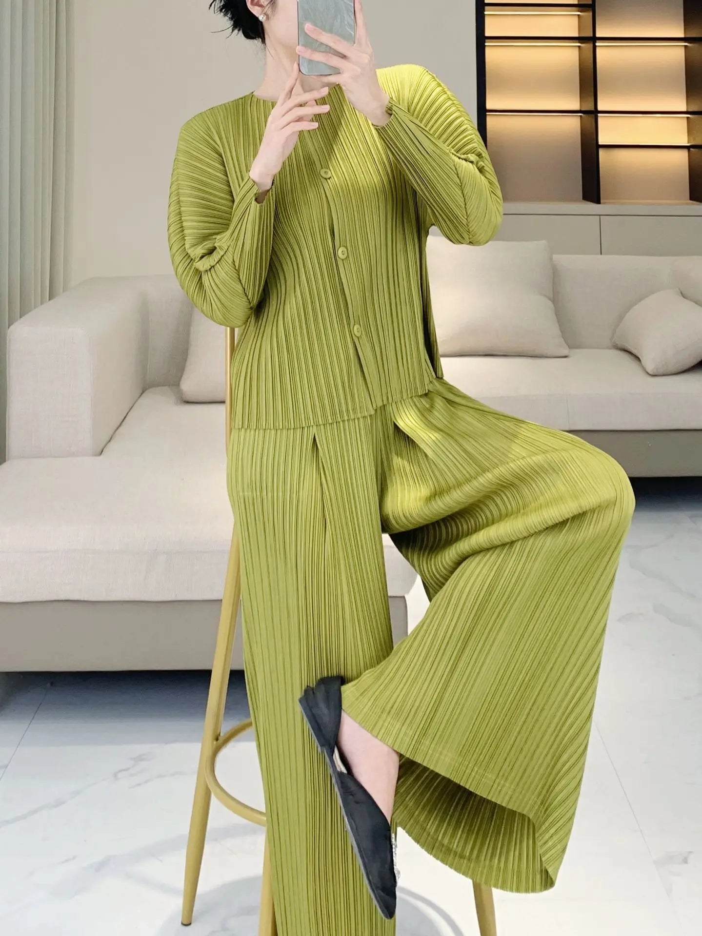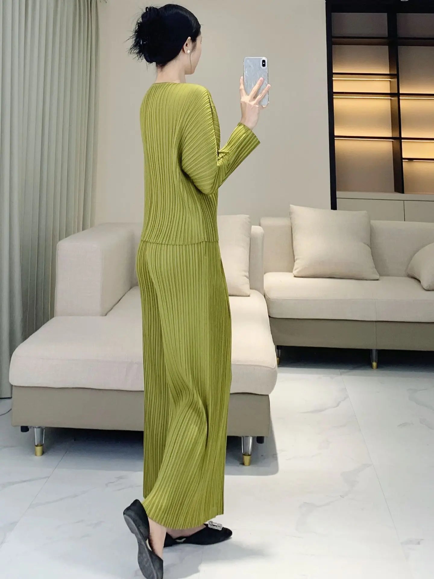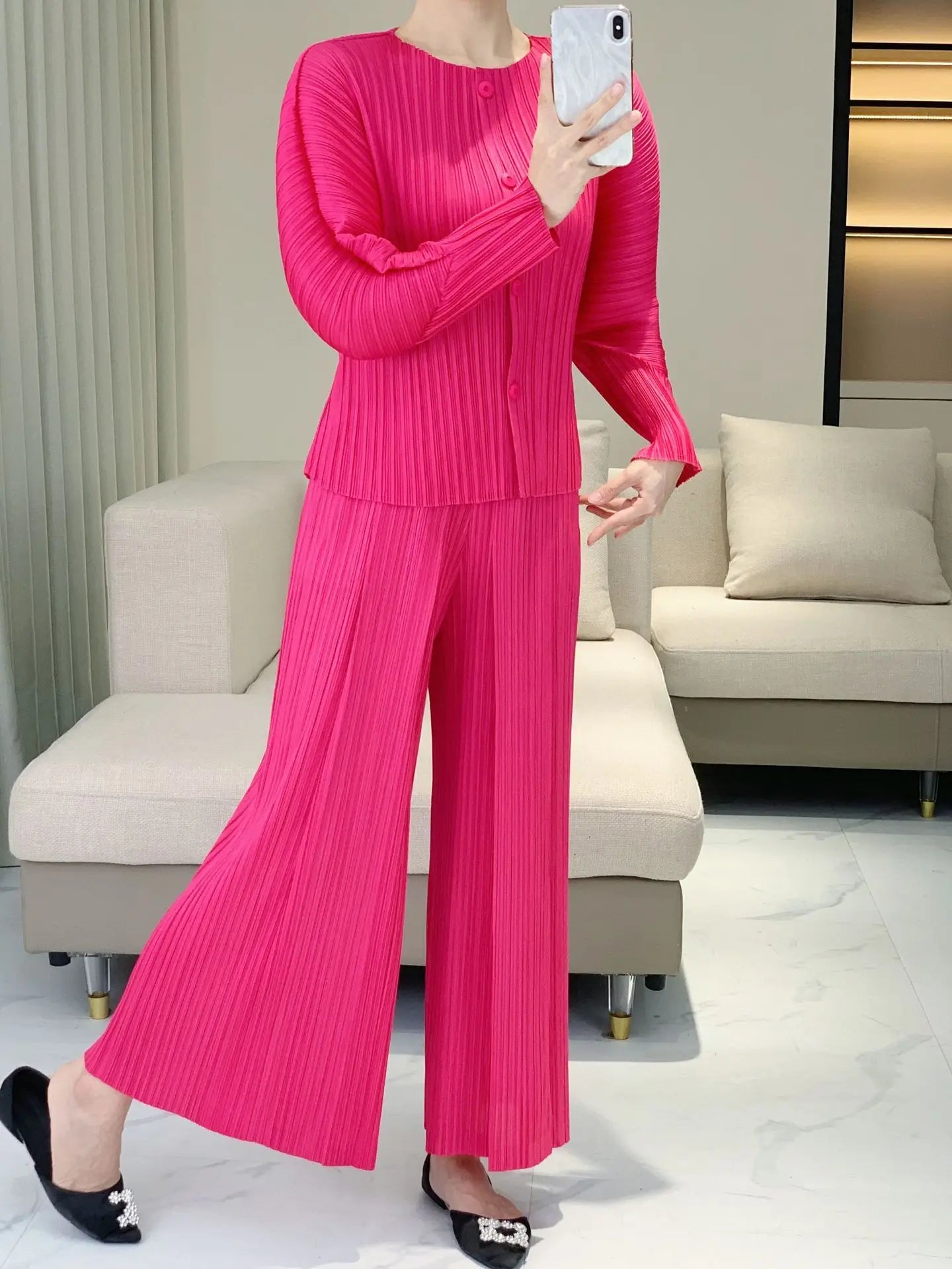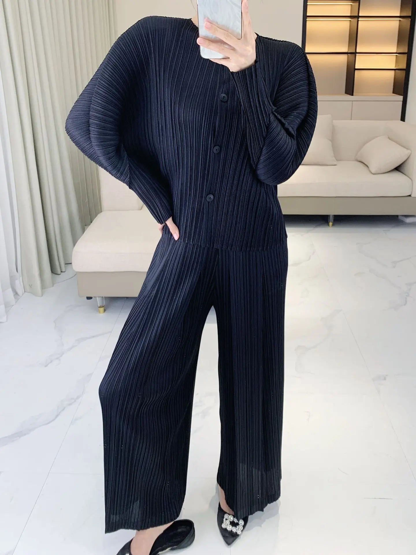 This 2-piece matching set features a long sleeve top and wide-leg pants. offering a chic. comfortable fit. The premium pleats and elastic waistband ensure both style and ease.