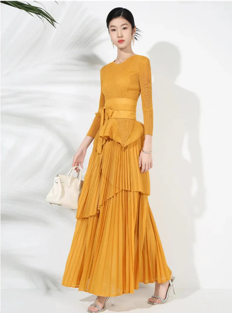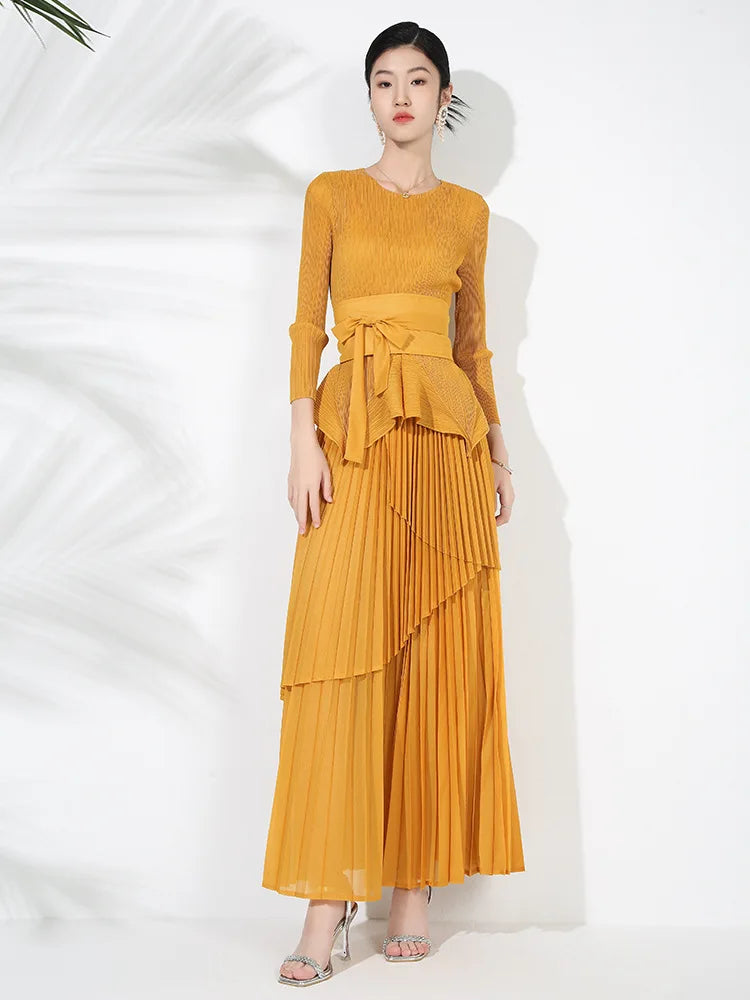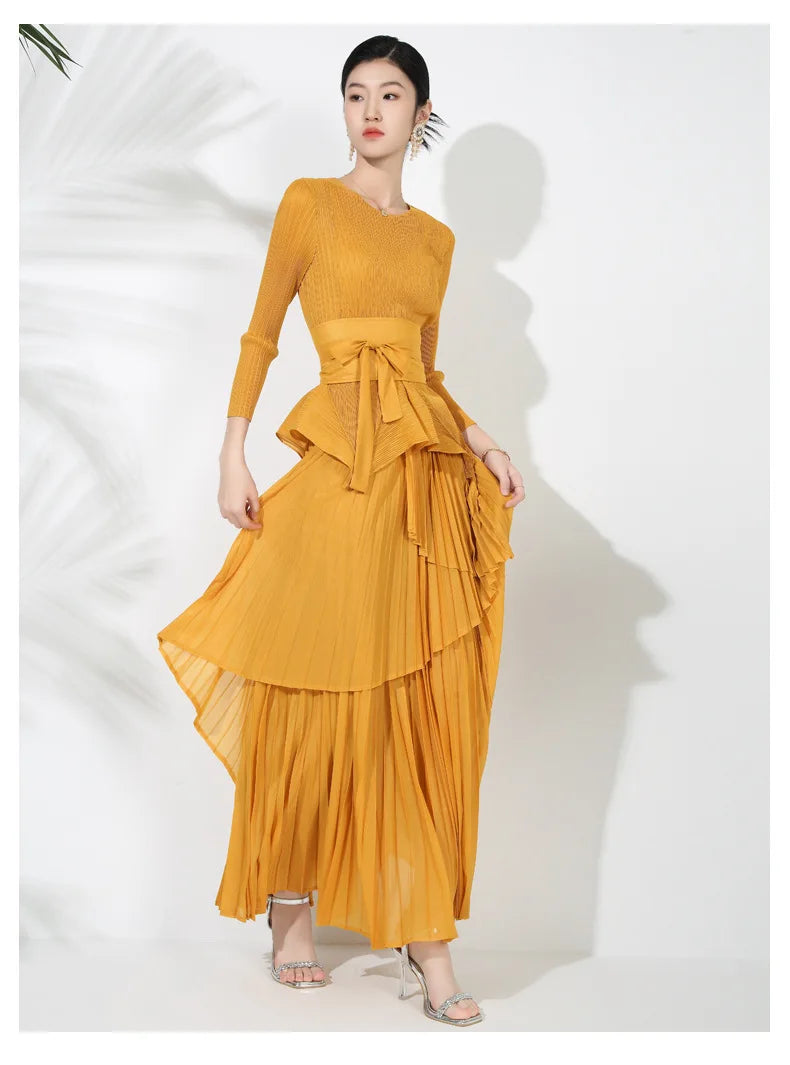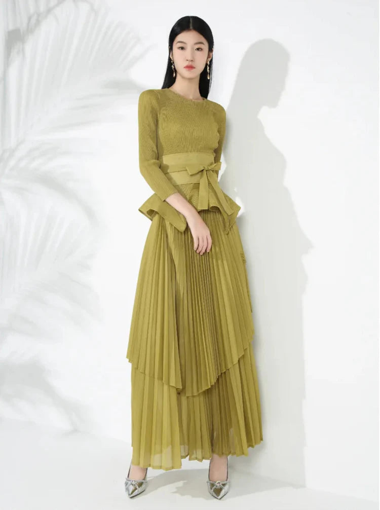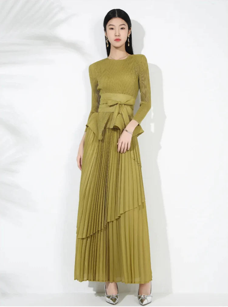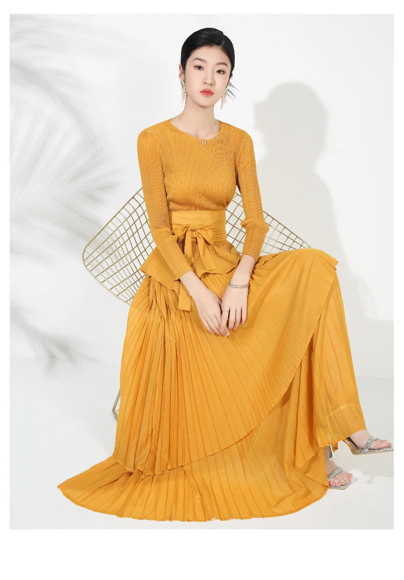Maxi Skirt Set with Pleated Long Sleeve Top