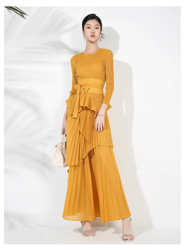 This luxurious set combines elegance and comfort. The pleated long sleeve top pairs perfectly with the flowing maxi skirt. featuring cascading ruffles.