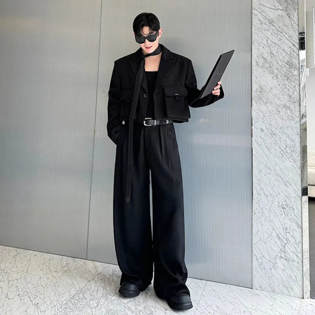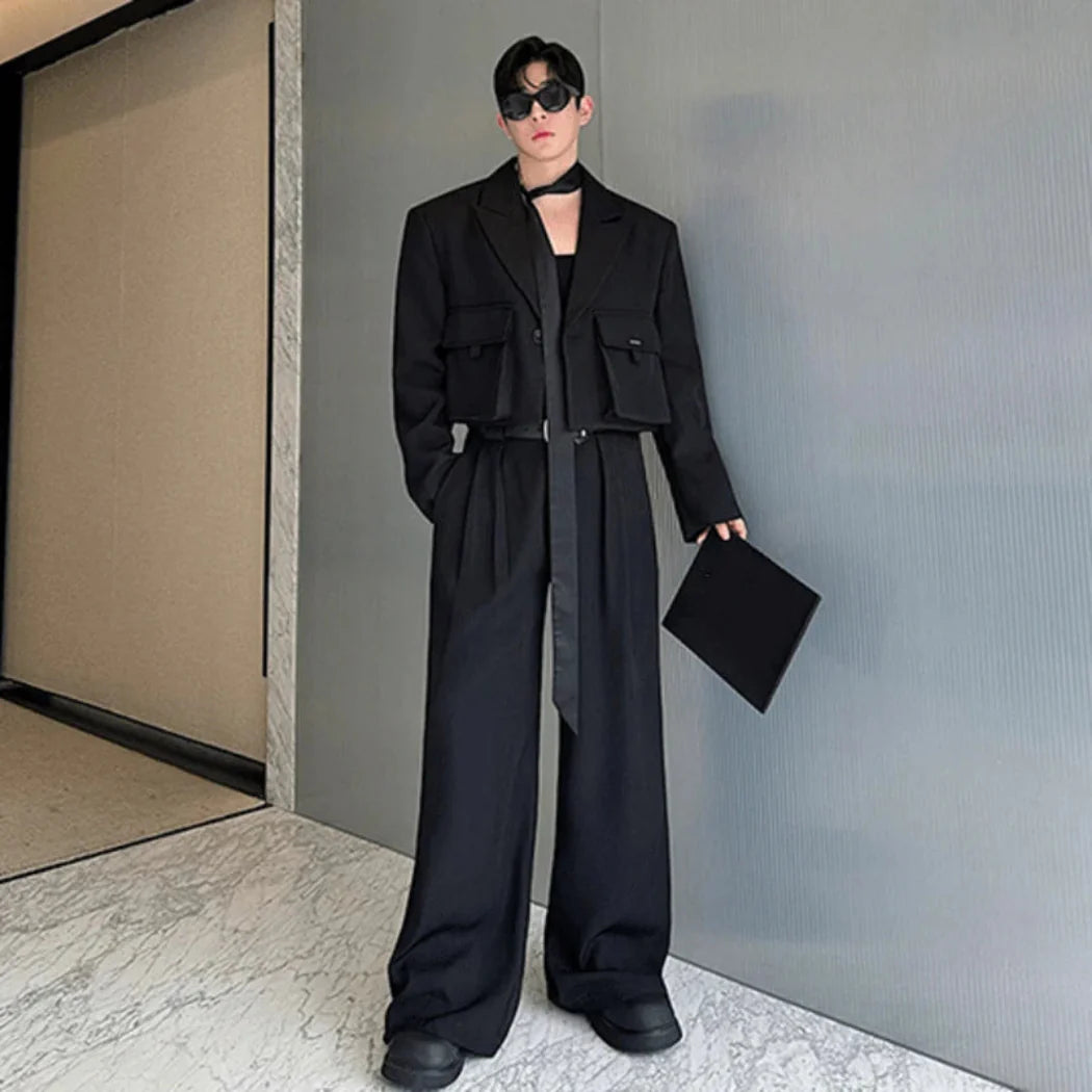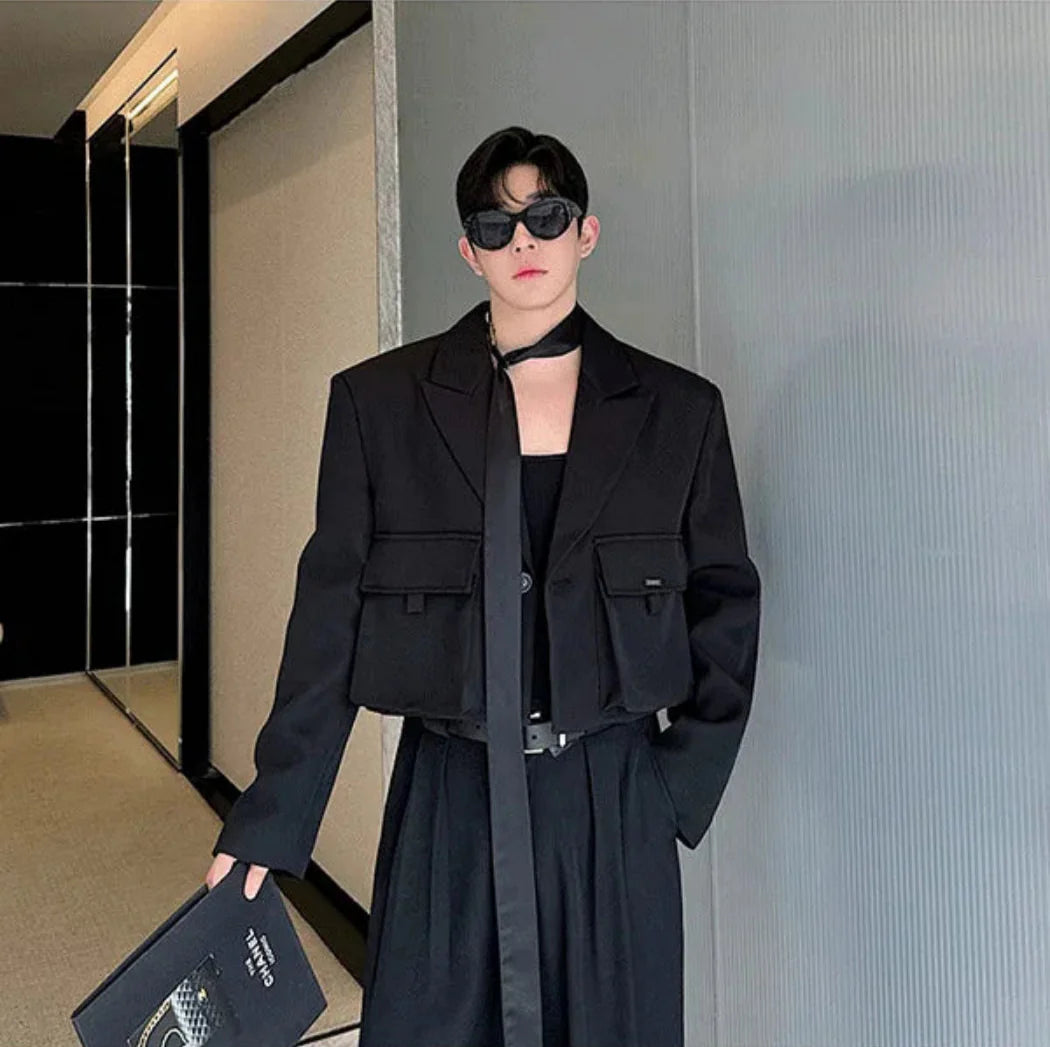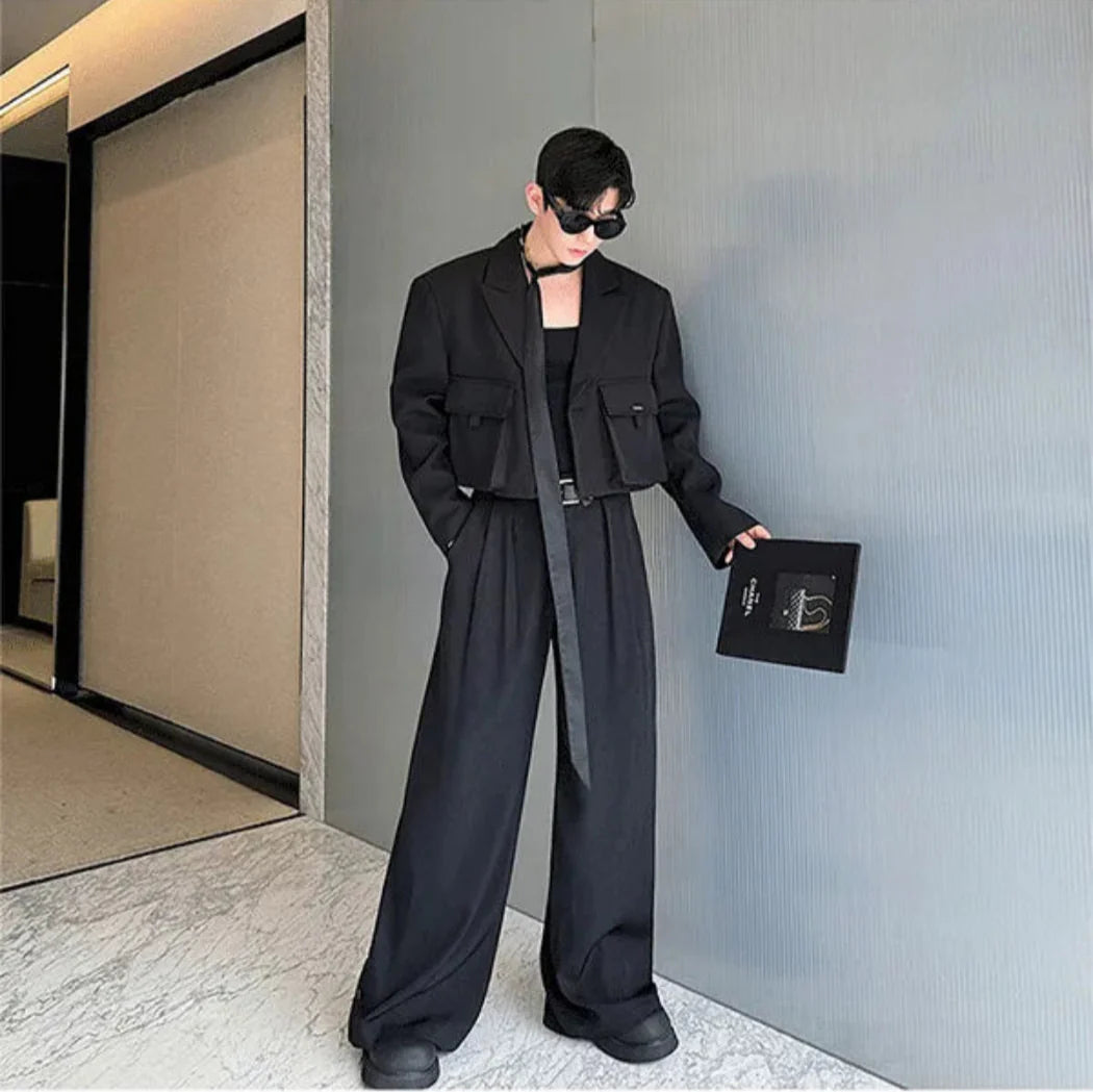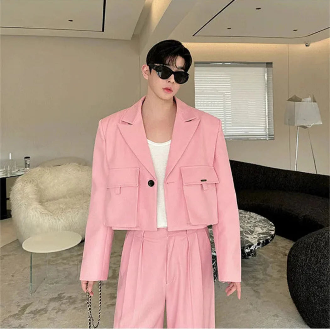 This 2-piece set features a cropped blazer with strategically placed cargo pockets for added practicality.
