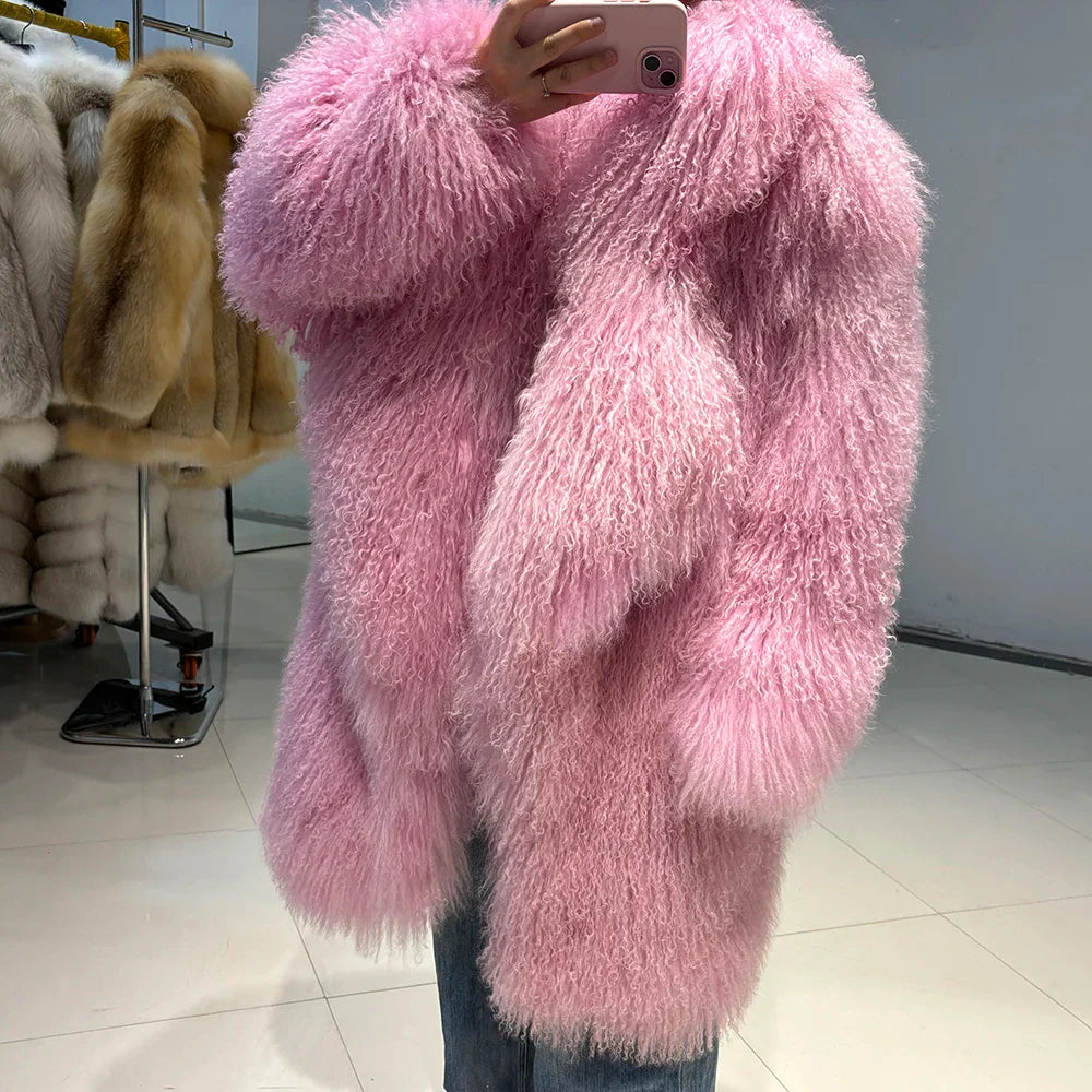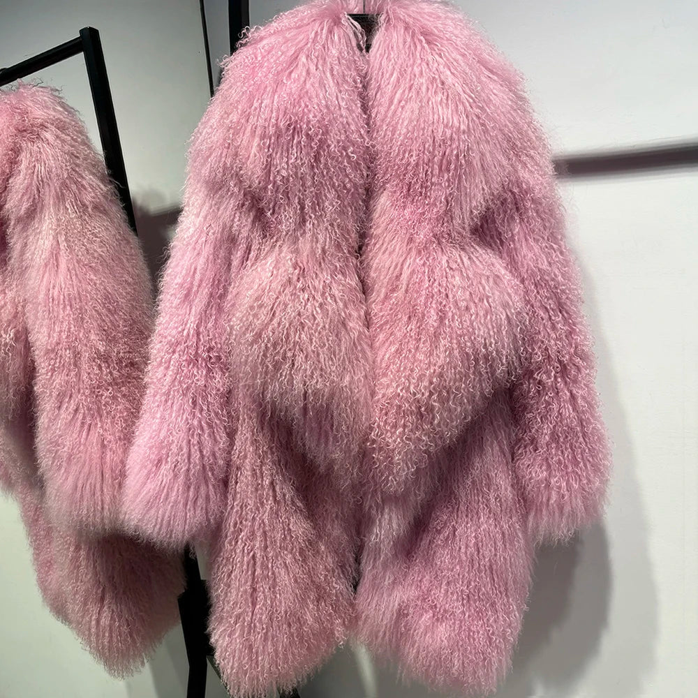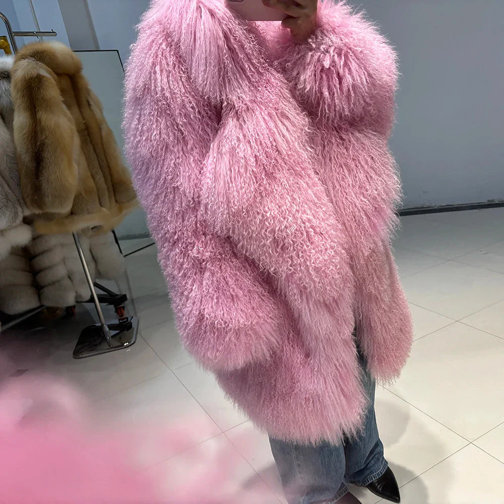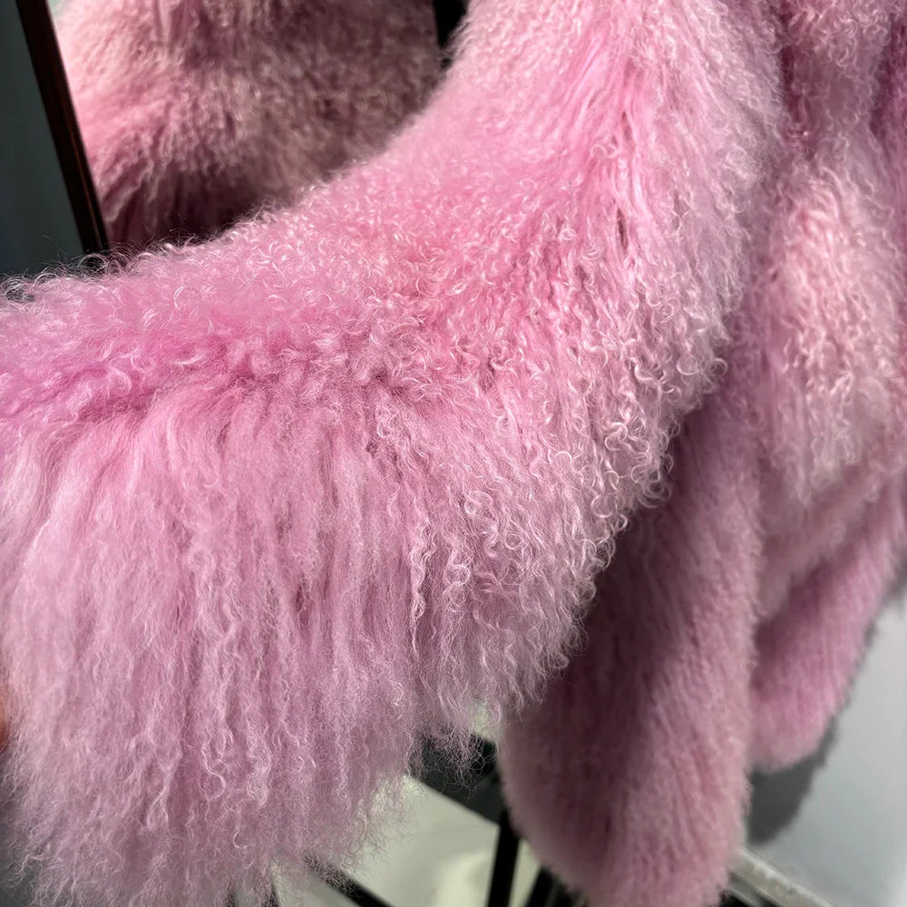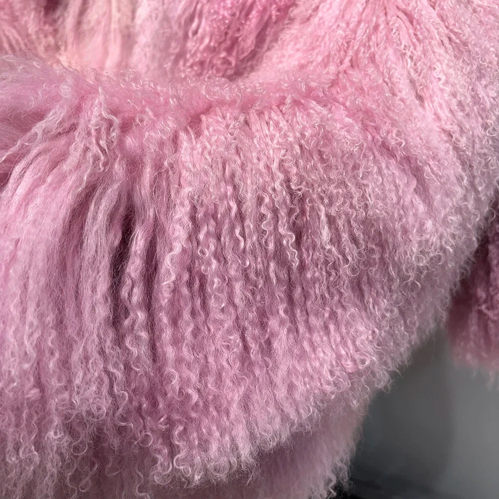 The epitome of luxurious warmth. This Mongolian Curly Shearling Wool Coat features premium Tibetan Mongolian curly sheep fur. hand-dyed in a soft pink hue.