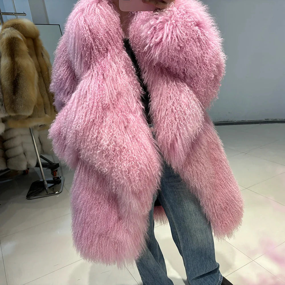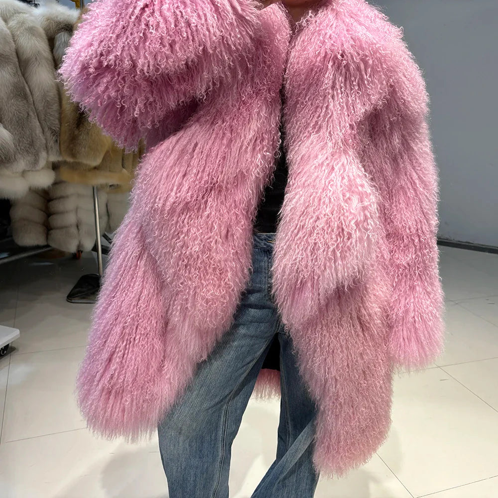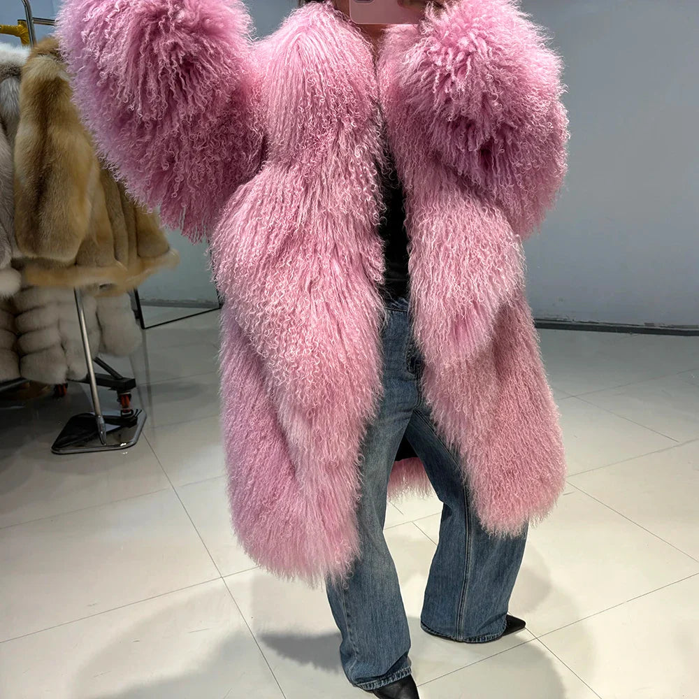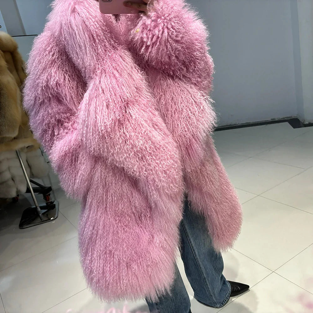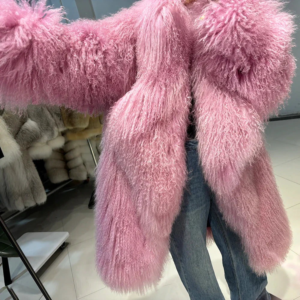 The epitome of luxurious warmth. This Mongolian Curly Shearling Wool Coat features premium Tibetan Mongolian curly sheep fur. hand-dyed in a soft pink hue.