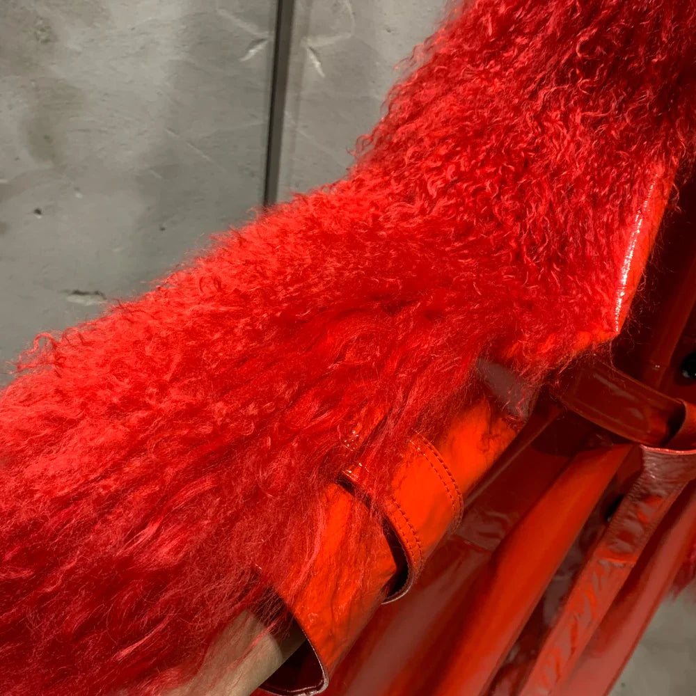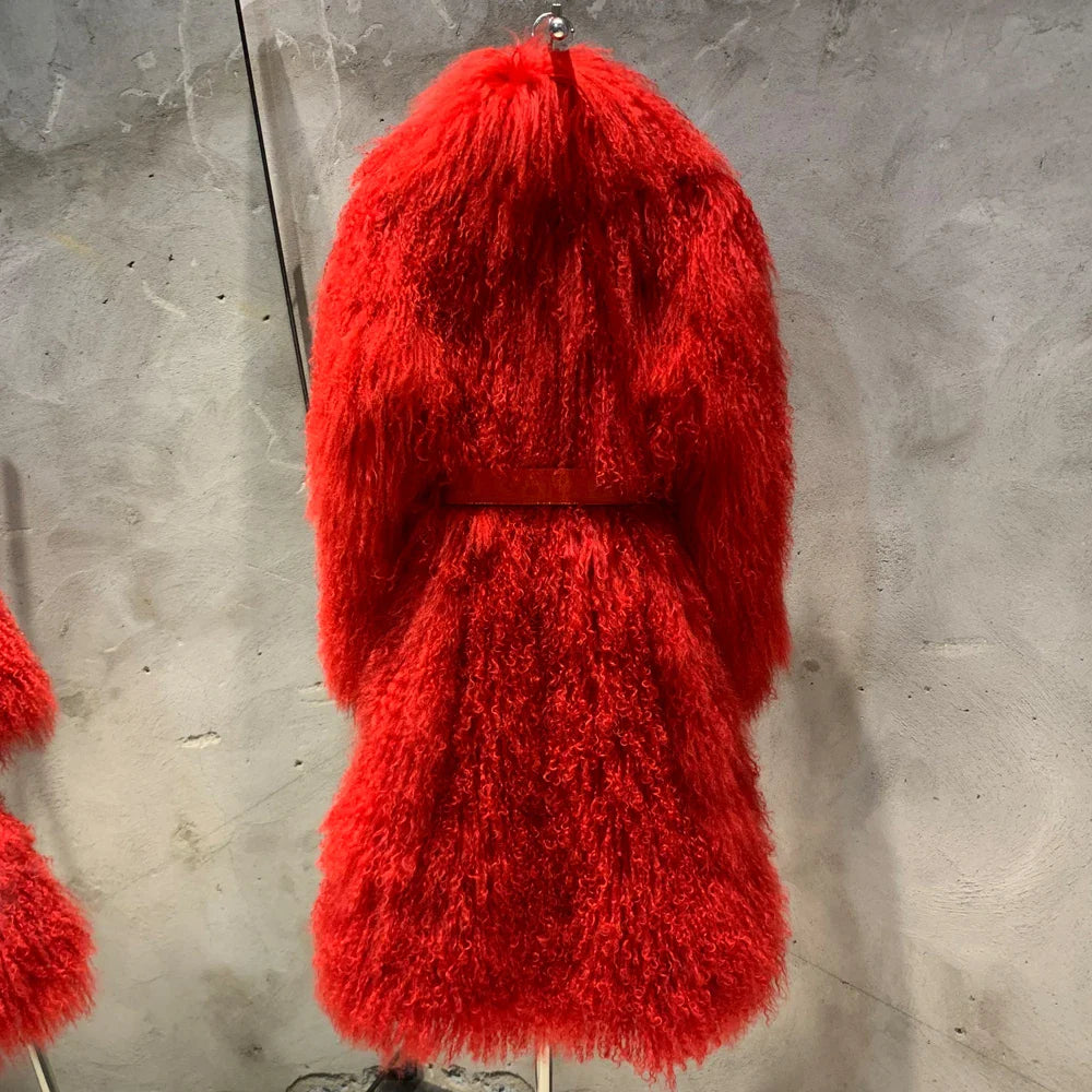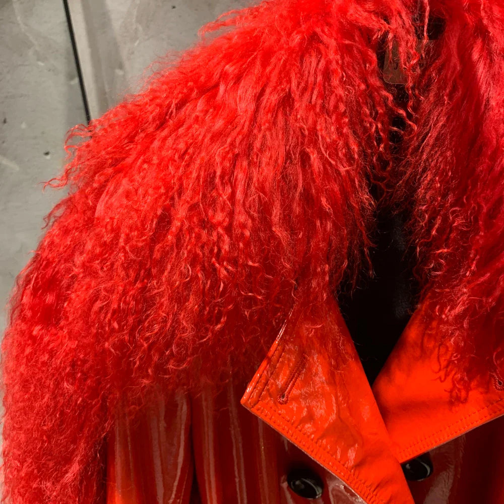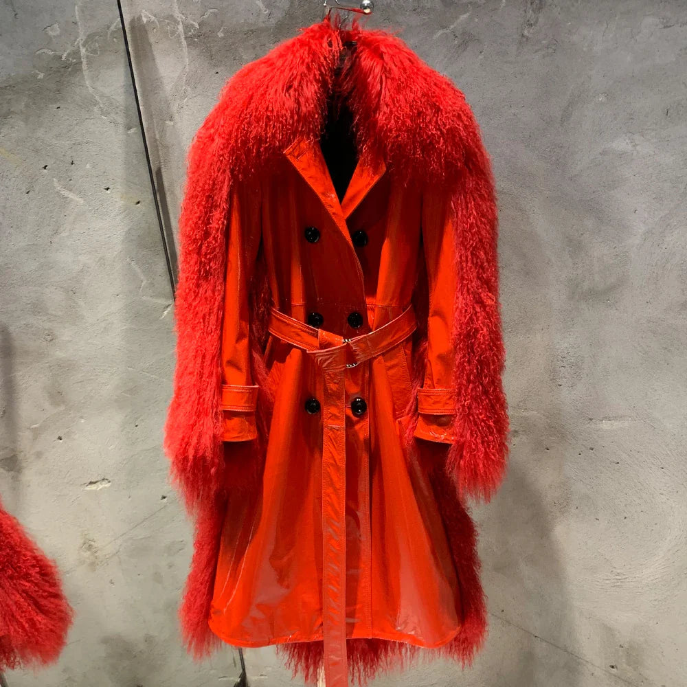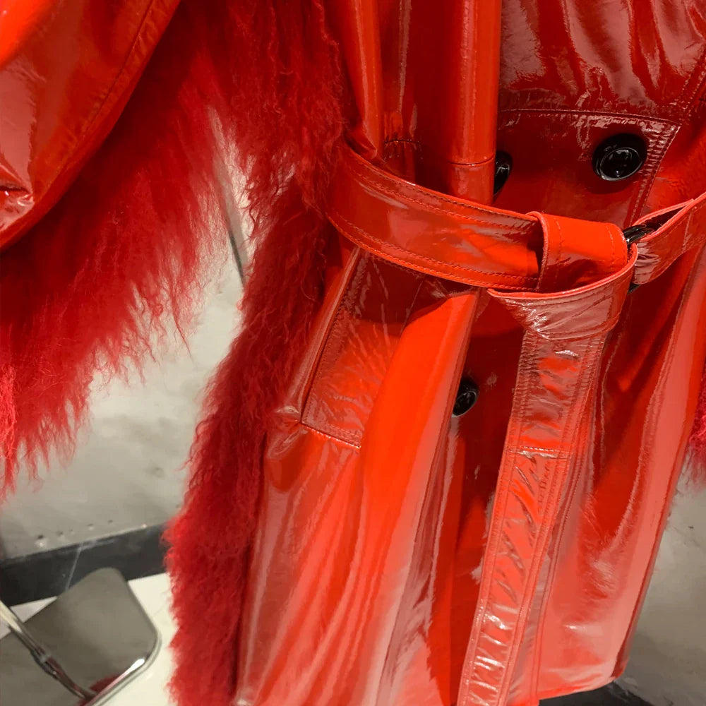 Stay warm and stylish this winter with this luxurious. custom-made trench coat. Crafted from genuine lambskin patent leather and 100% real Tibetan Mongolian curly fur. this coat offers exceptional warmth and a striking look.