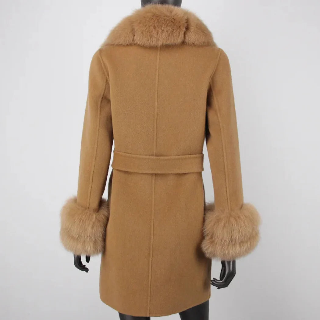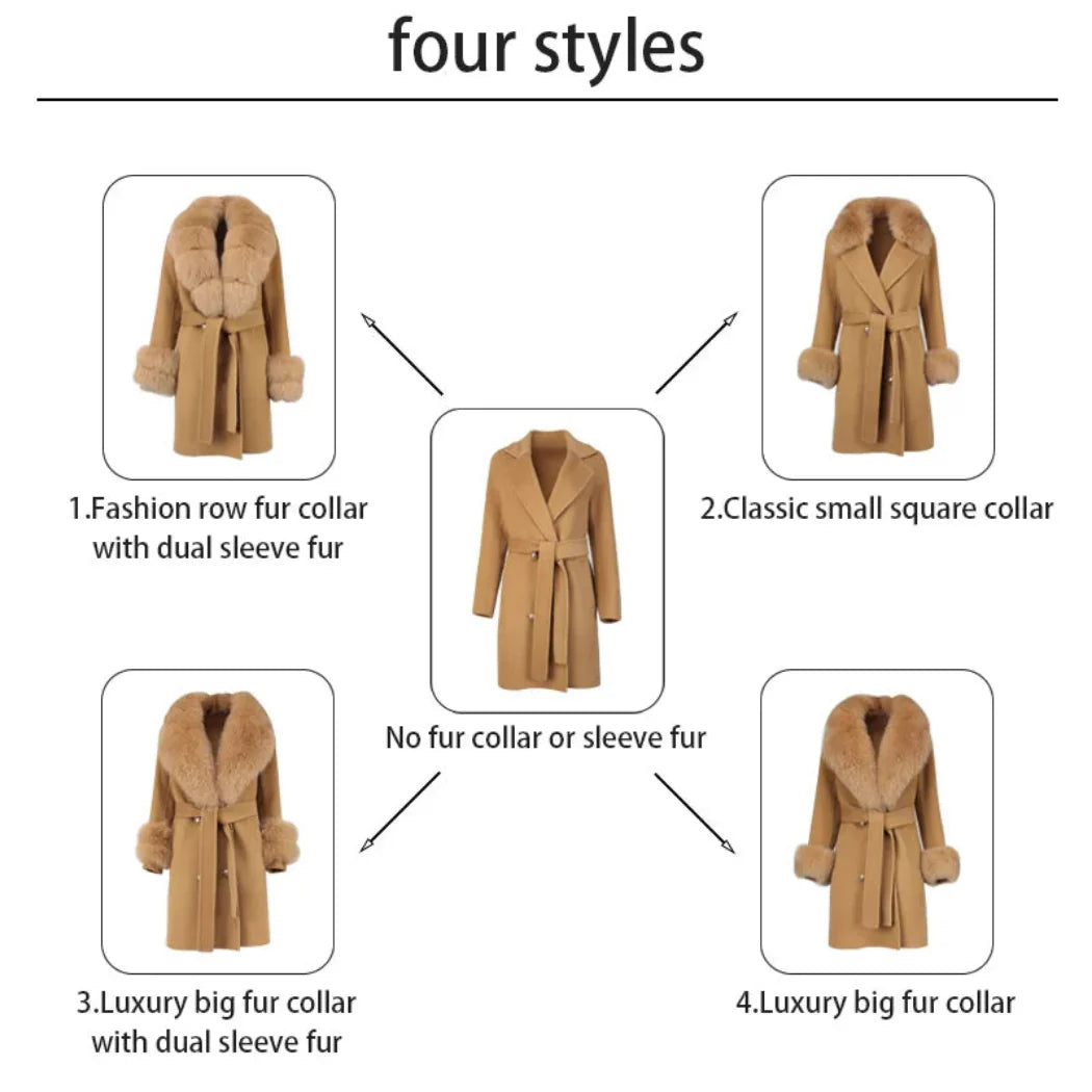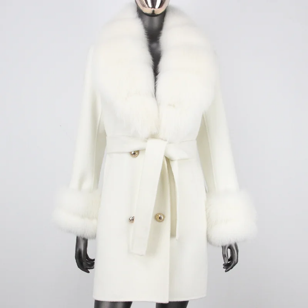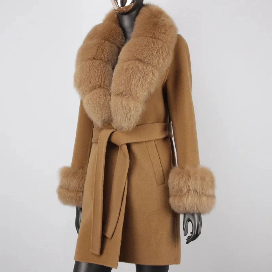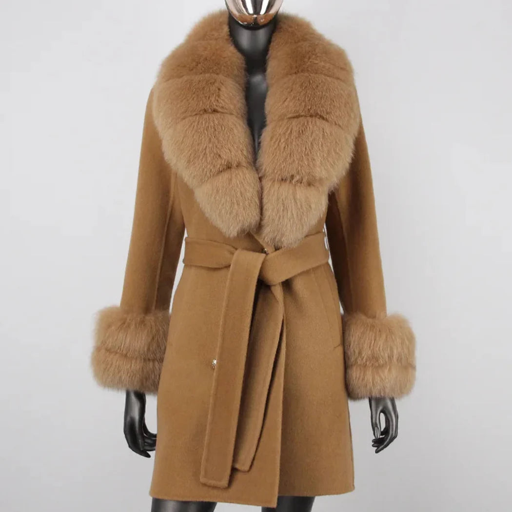 Stay warm and cozy in style with this petite cashmere wool real fur coat. Made with a premium cashmere and wool blend and featuring real premium fox fur trim. this jacket provides exceptional warmth and a comfortable fit.