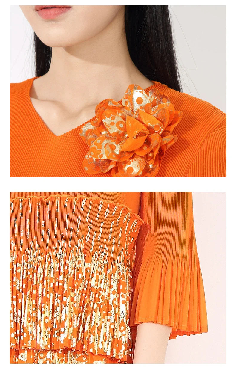 The 3D floral top and wide-leg pants blend formality with ease—without sacrificing sophistication.