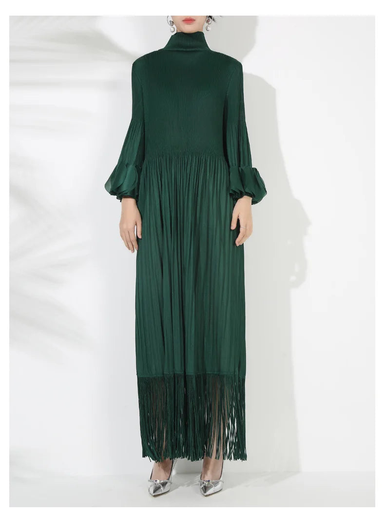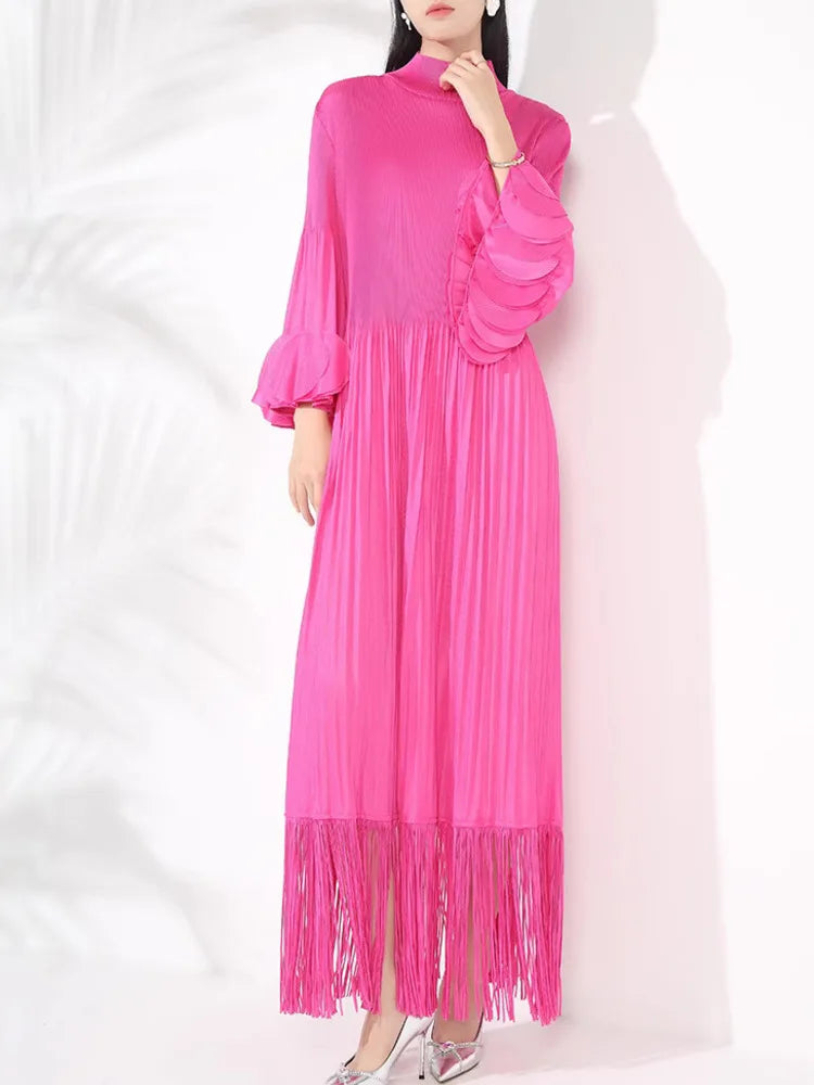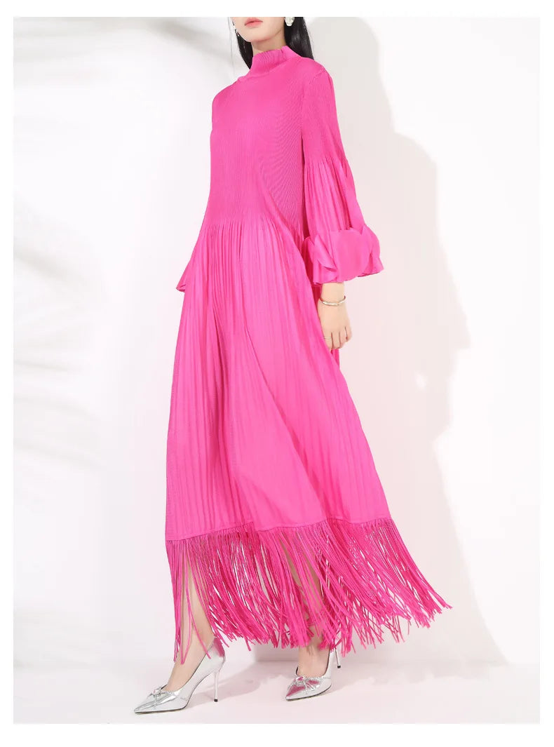 This pleated midi dress is the perfect blend of elegance and comfort. Crafted from genuine pleated fabric. it features oversized long sleeves and tassels at the hem for a luxurious. flowy look.