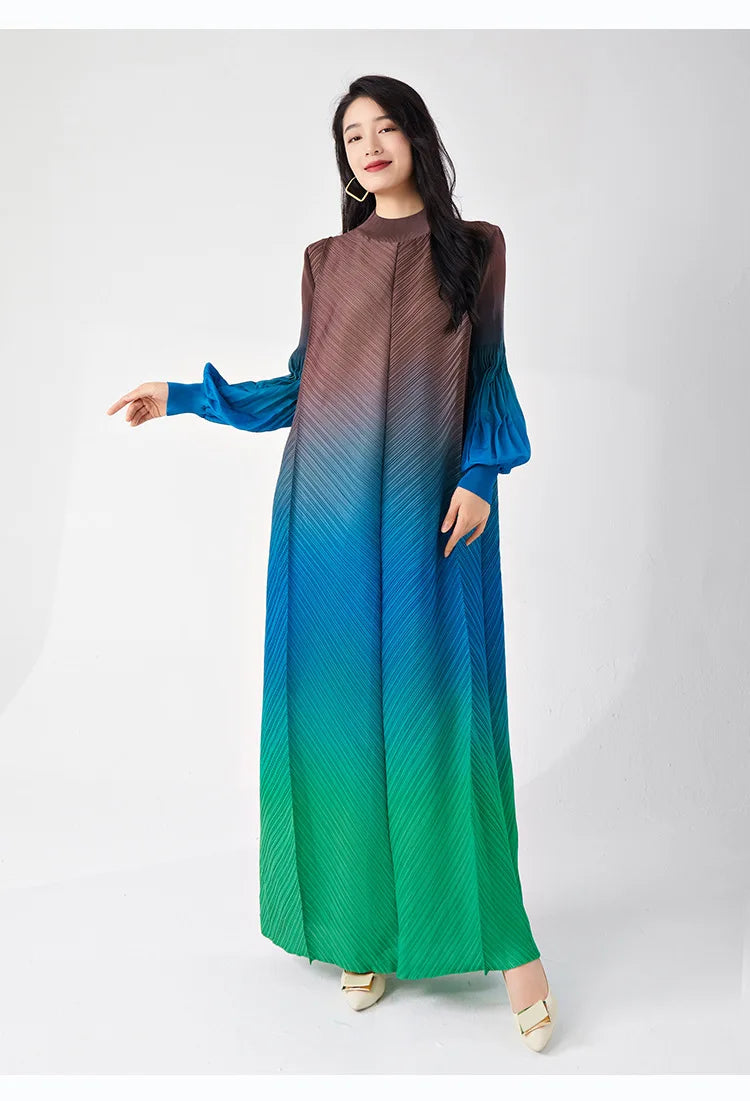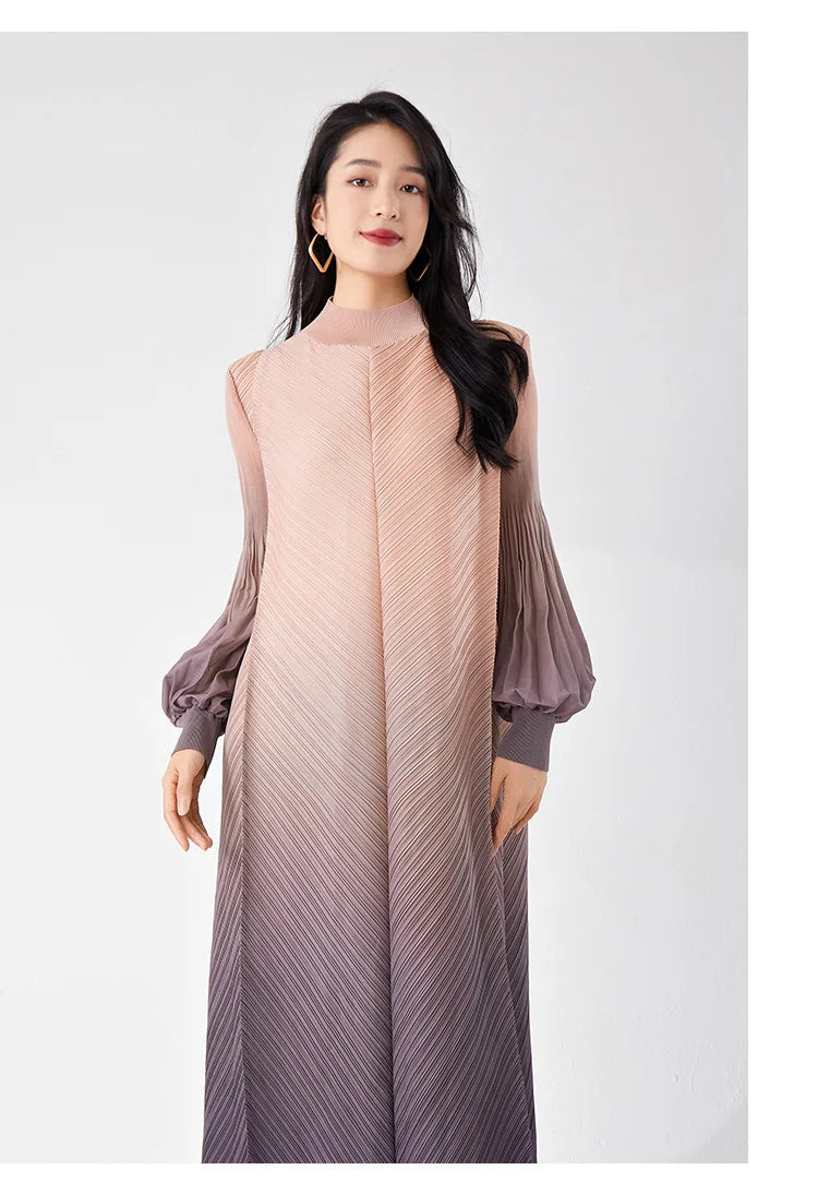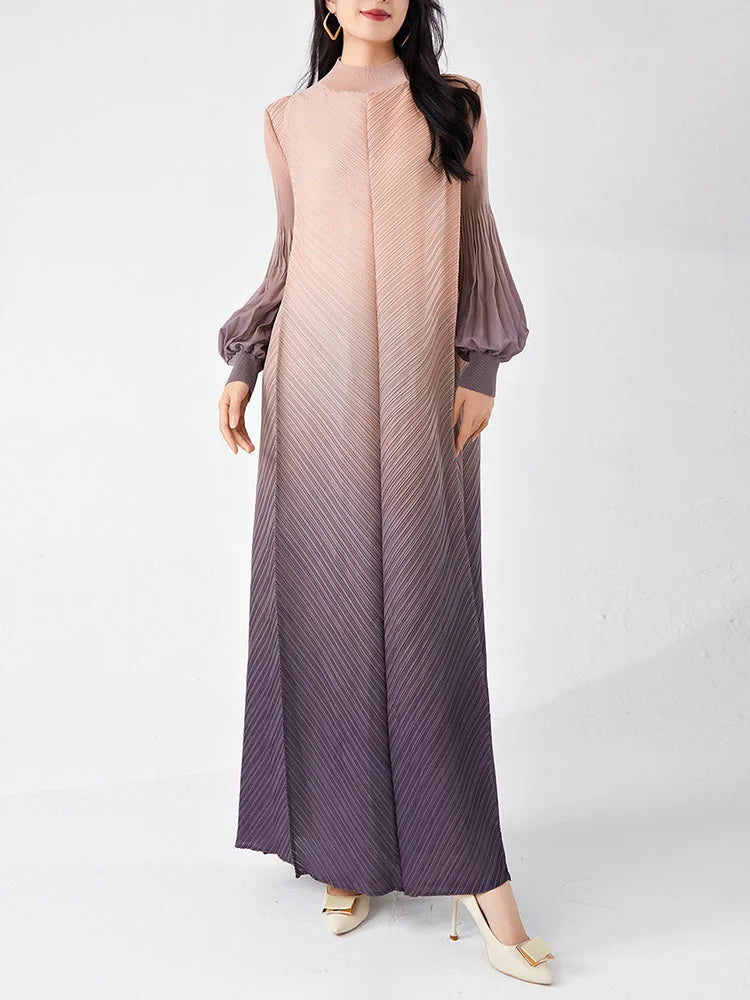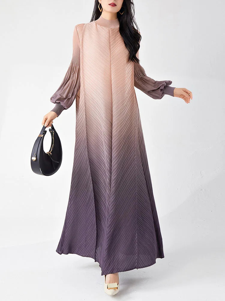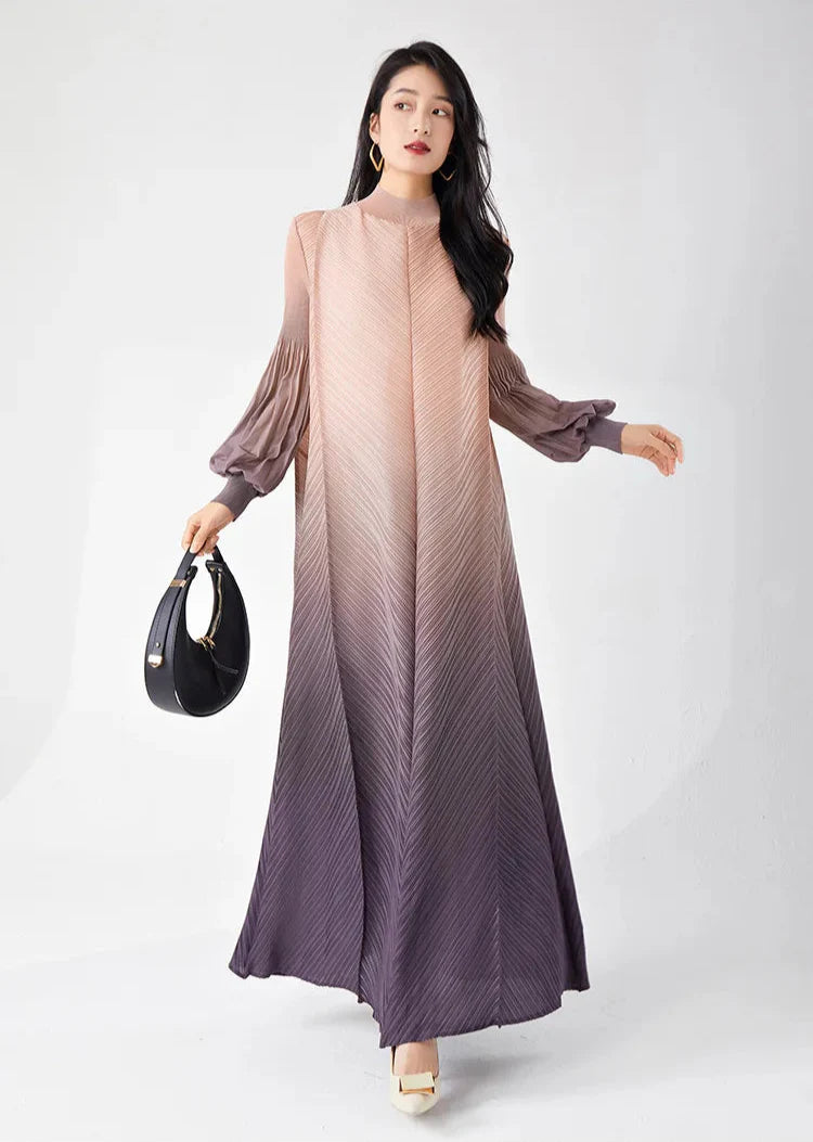 Timelessly chic. this pleated midi dress combines elegance with a contemporary twist. The puffed long sleeves and ombre hues create a statement look. while the midi length and pleated design ensure all-day comfort and sophistication.