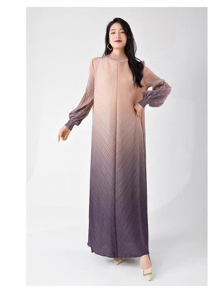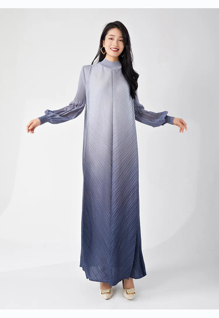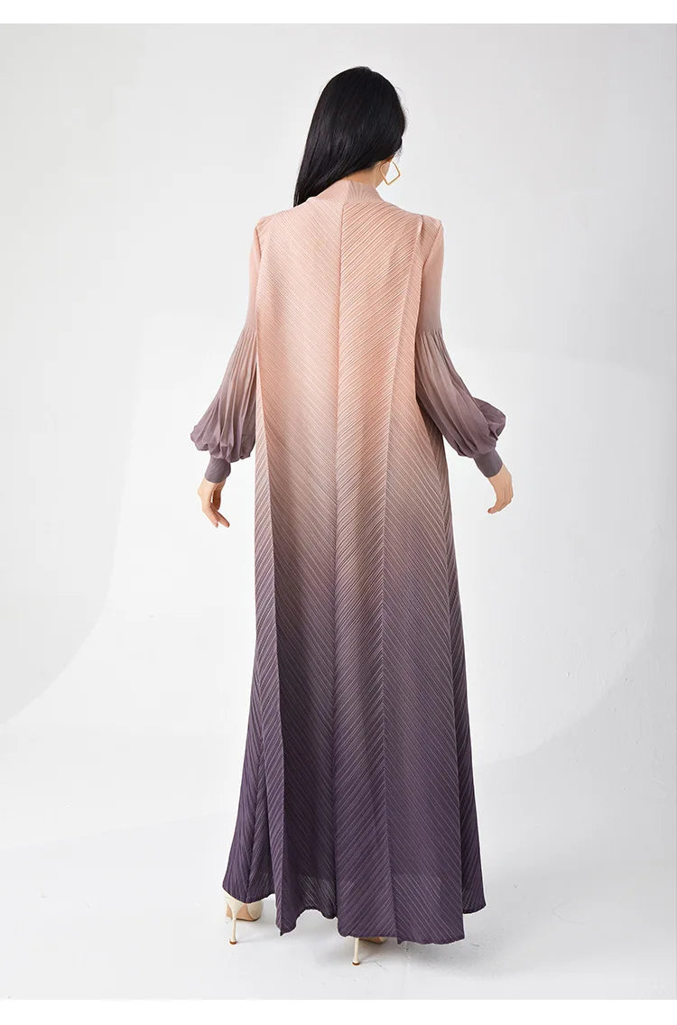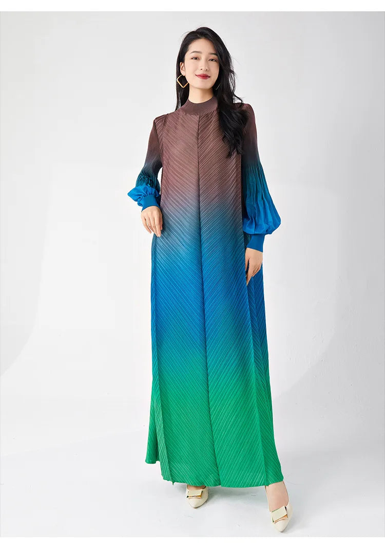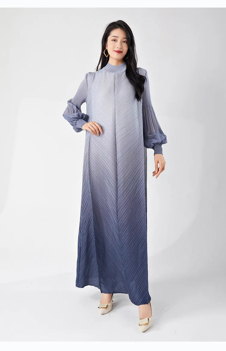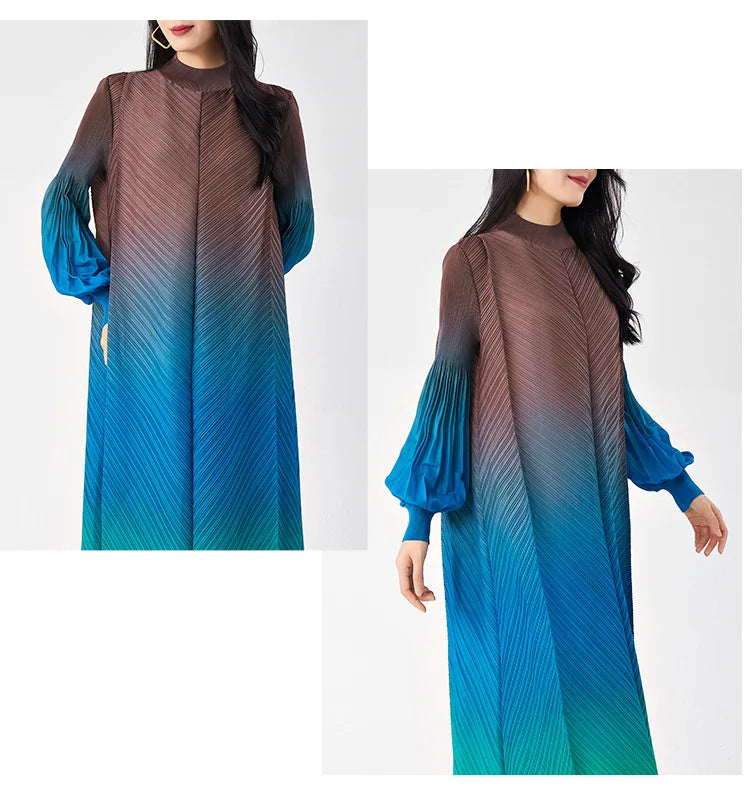 Timelessly chic. this pleated midi dress combines elegance with a contemporary twist. The puffed long sleeves and ombre hues create a statement look. while the midi length and pleated design ensure all-day comfort and sophistication.