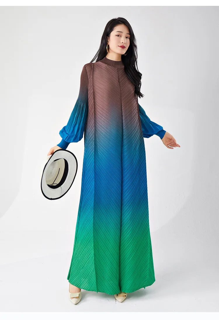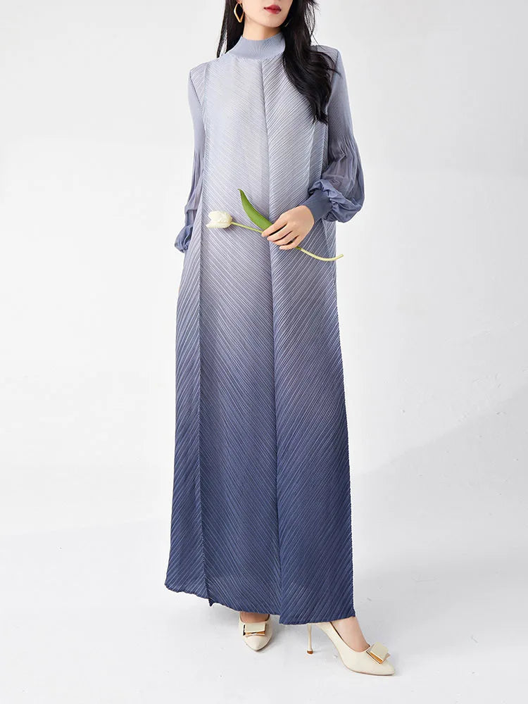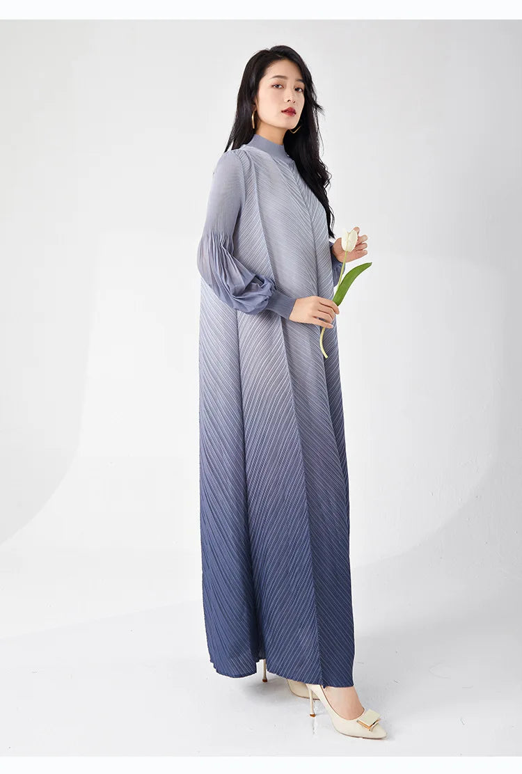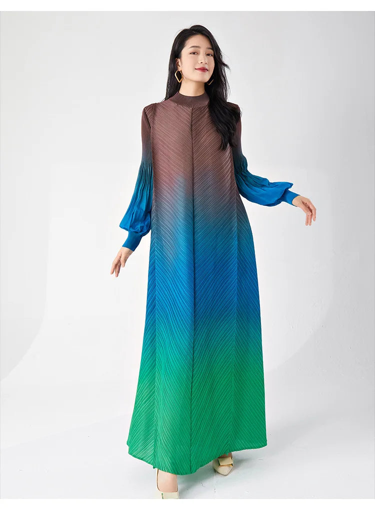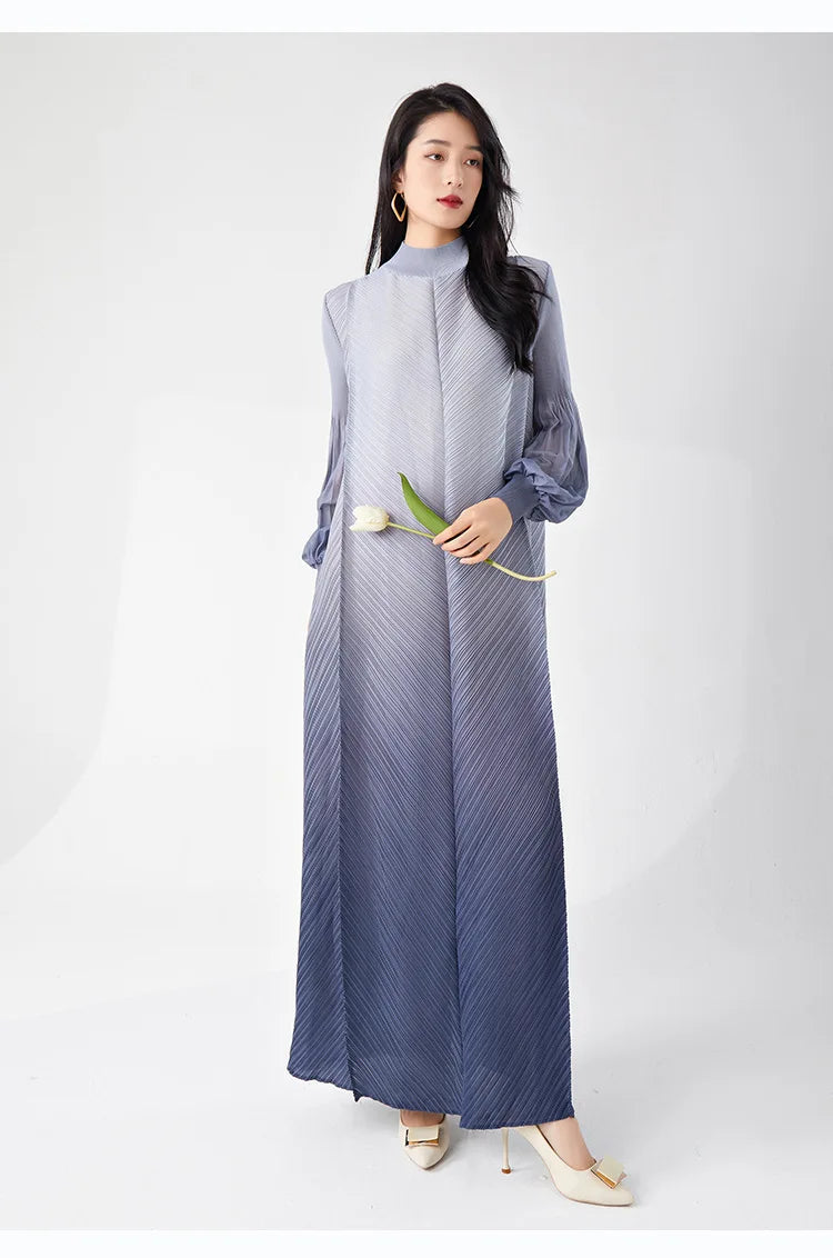 Timelessly chic. this pleated midi dress combines elegance with a contemporary twist. The puffed long sleeves and ombre hues create a statement look. while the midi length and pleated design ensure all-day comfort and sophistication.