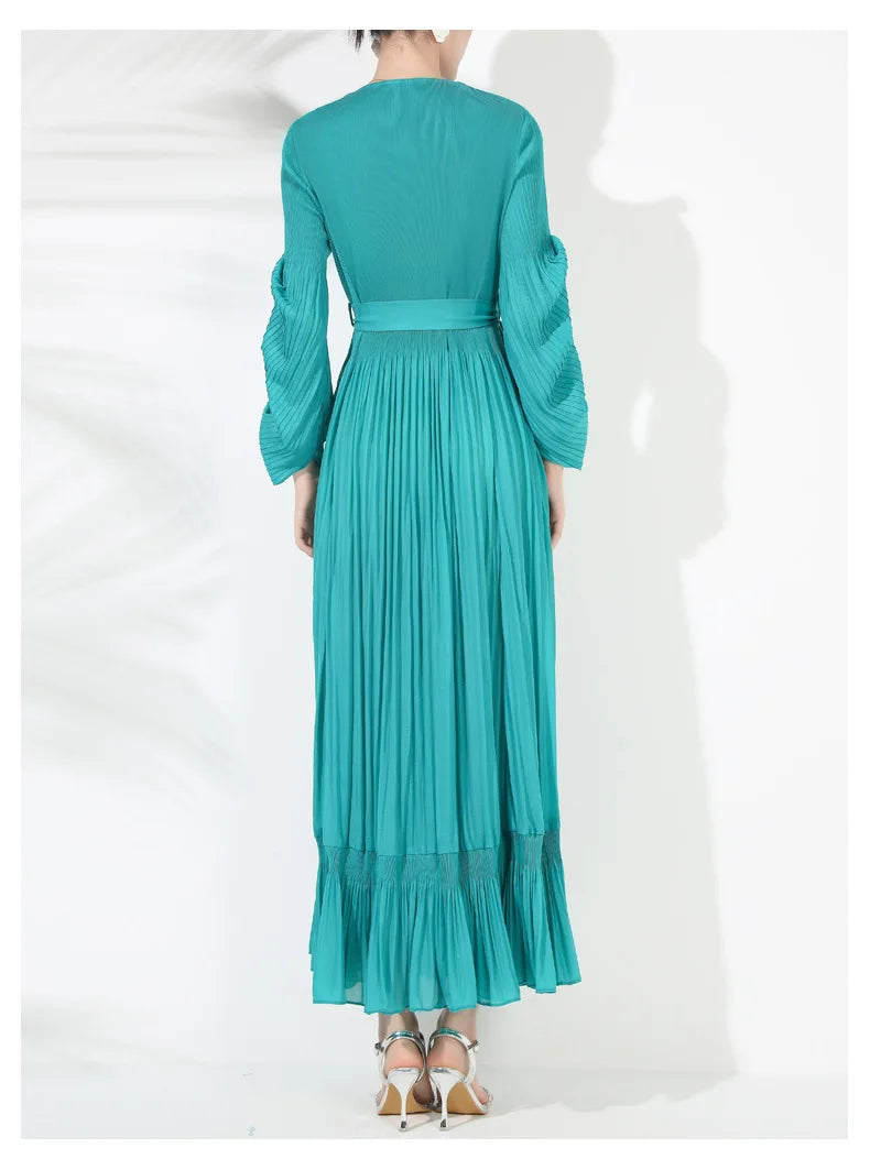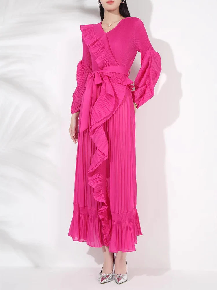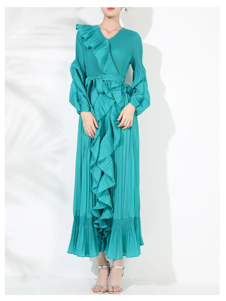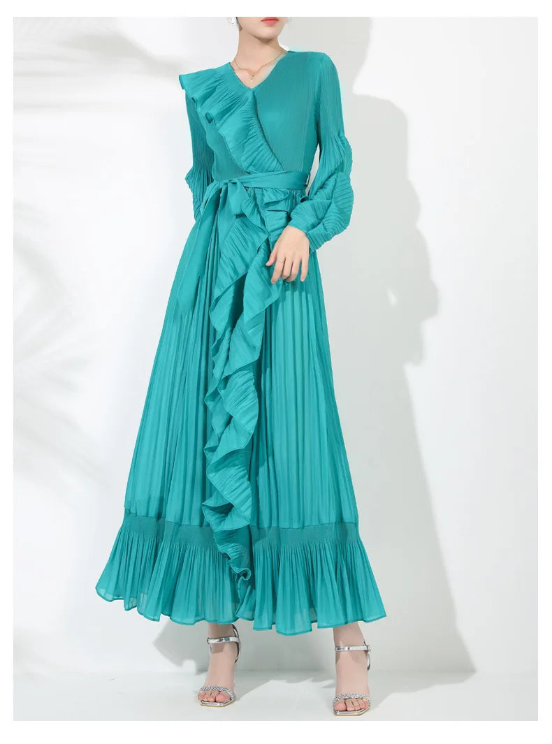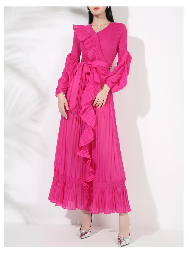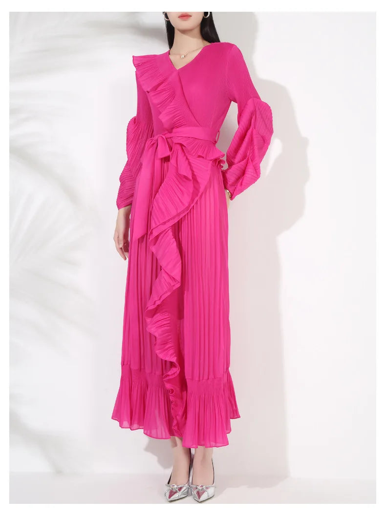 This stunning maxi dress blends elegance with unique flair. Crafted with pleated plissé fabric. it features a flattering long sleeve design and delicate ruffle trim. making it a standout piece for any special occasion.