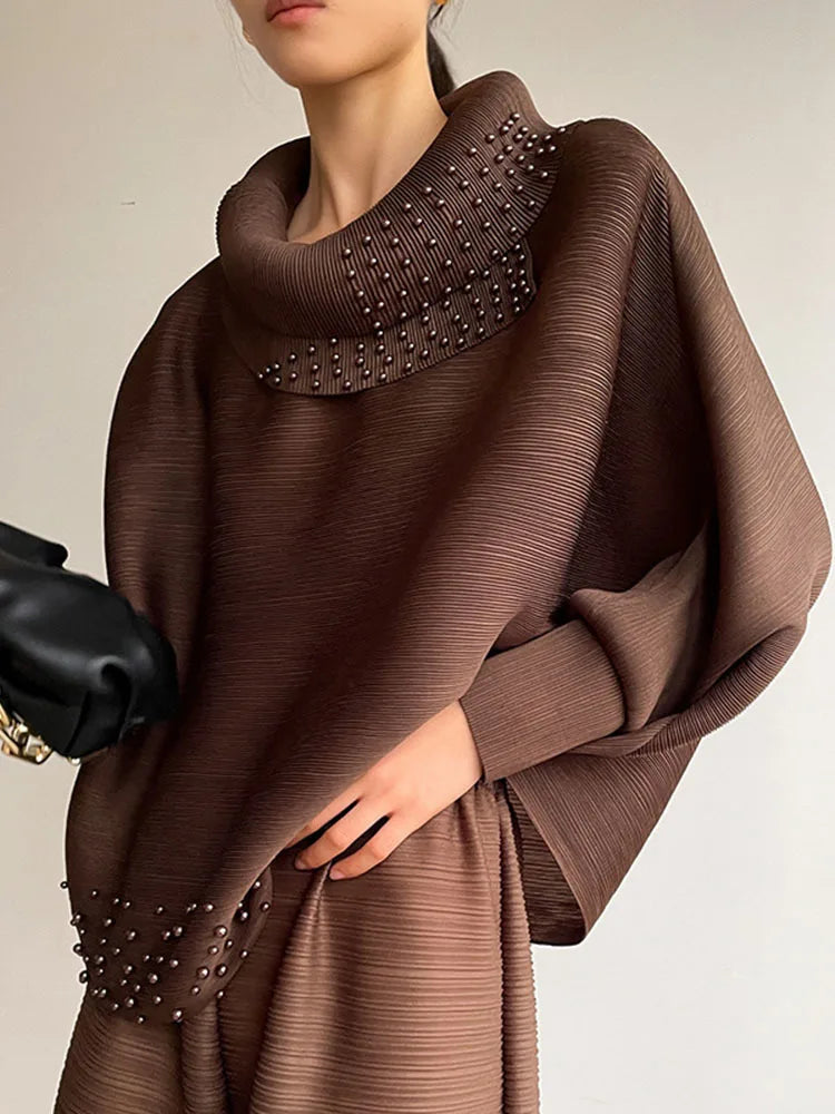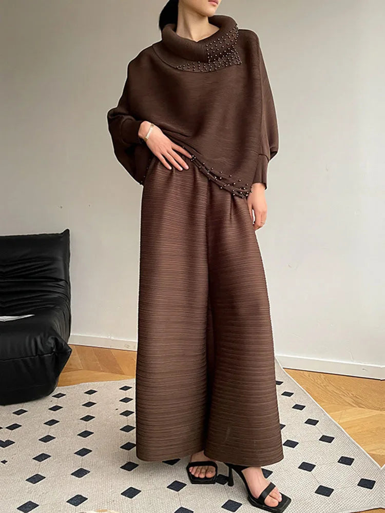 The Pleated Sweater & Pant Set - Exclusive Design is where comfort meets style. Crafted from genuine pleated fabric. this set features a beaded batwing sleeve sweater paired with chic wide-leg pants.