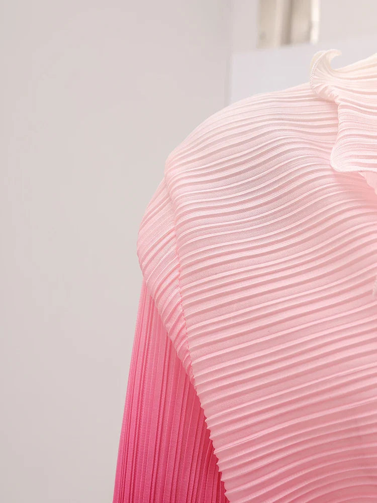 This elegant duster coat features delicate plissé pleats and ruffled detailing. creating a soft. flowing silhouette. The ombre pink color adds a touch of sophistication. perfect for any special occasion or daily wear. all with a Japanese-inspired aesthetic.
