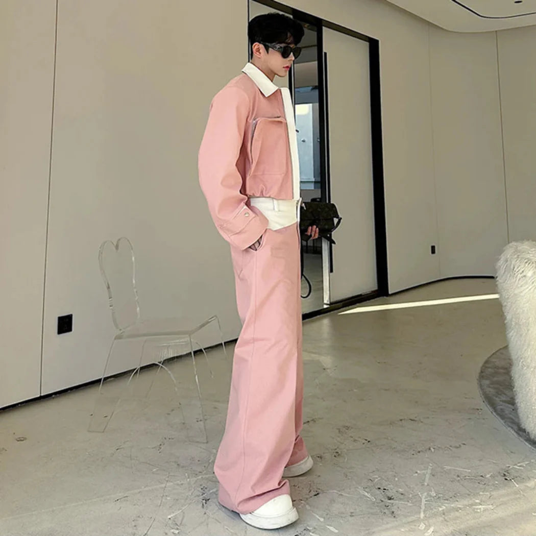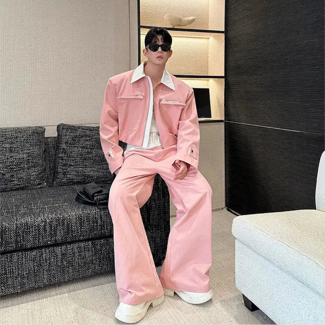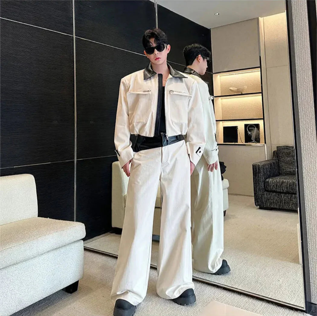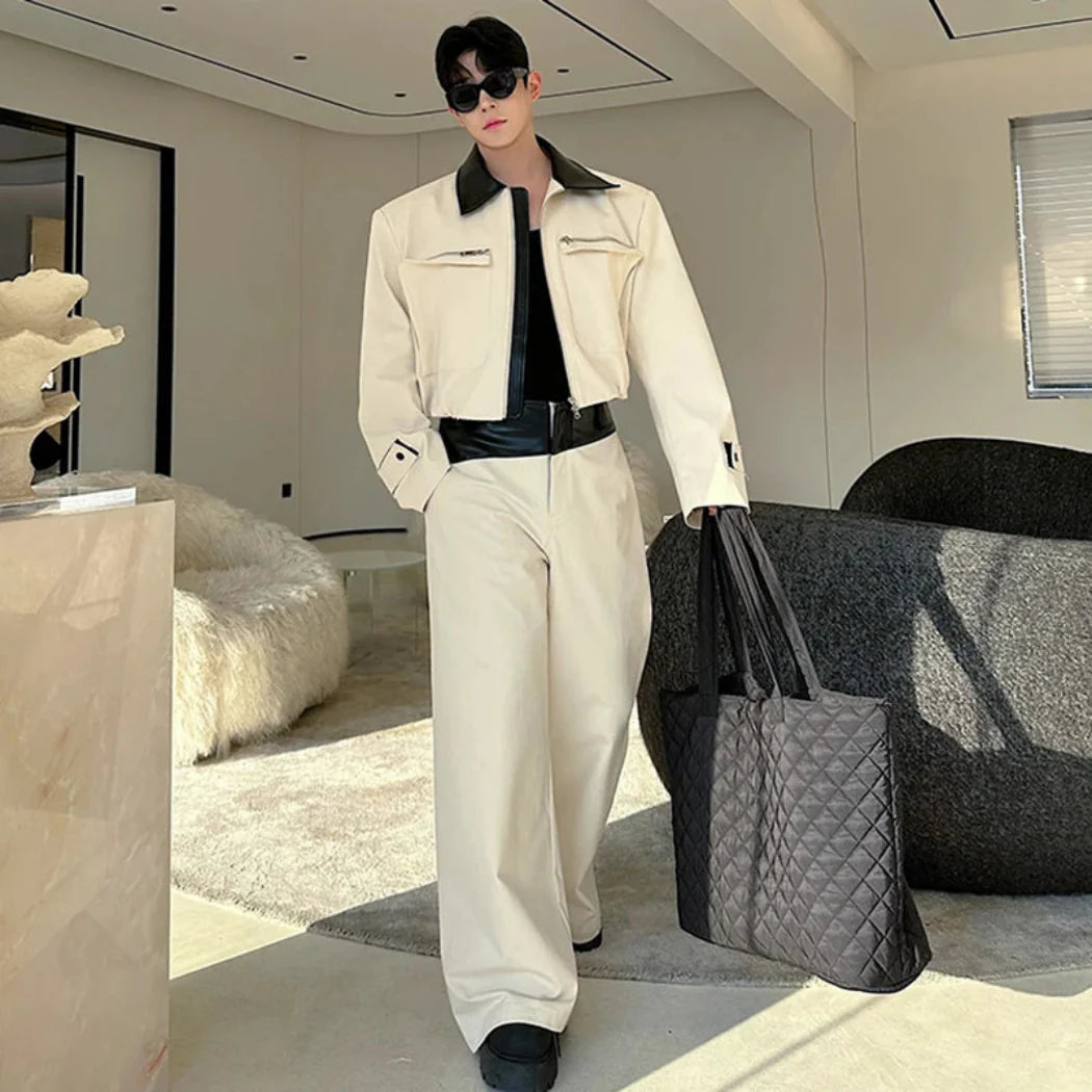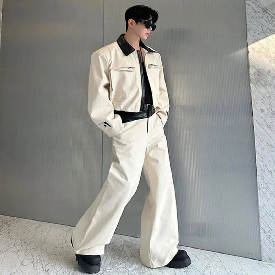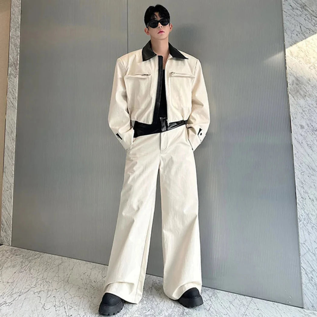 A tribute to Japanese high-end streetwear. this premium 2-piece set combines a cropped jacket and baggy pants with sleek faux leather accents.