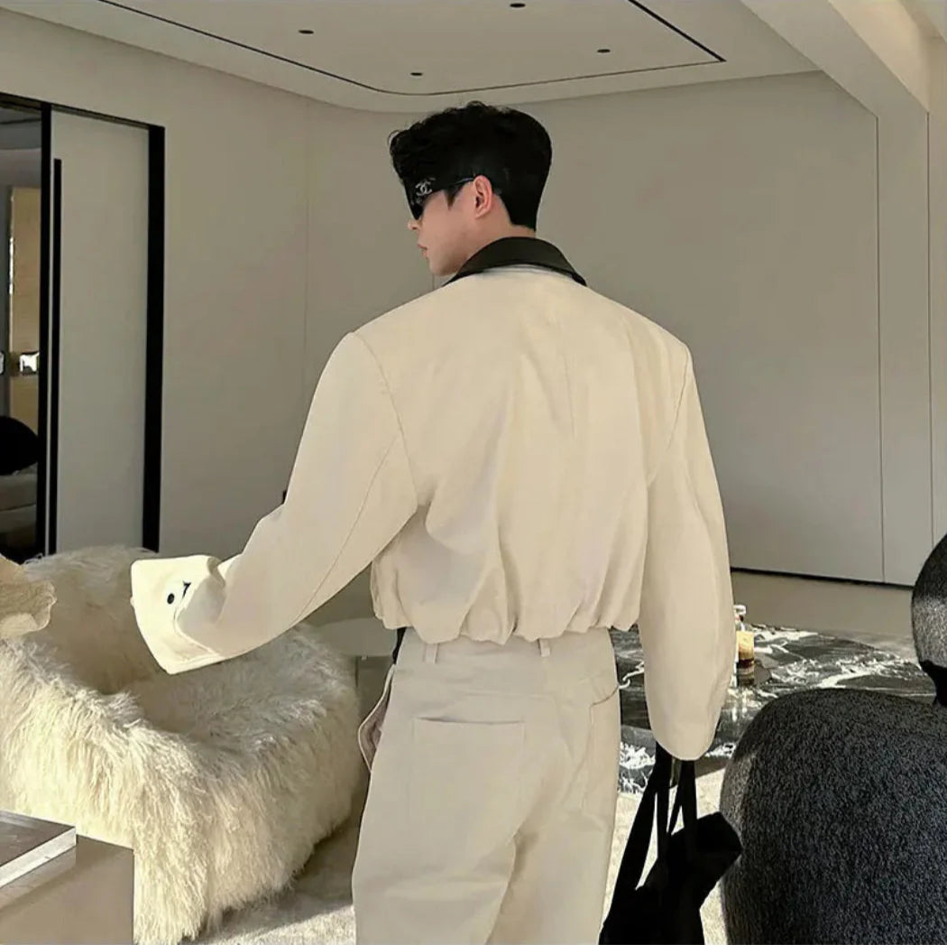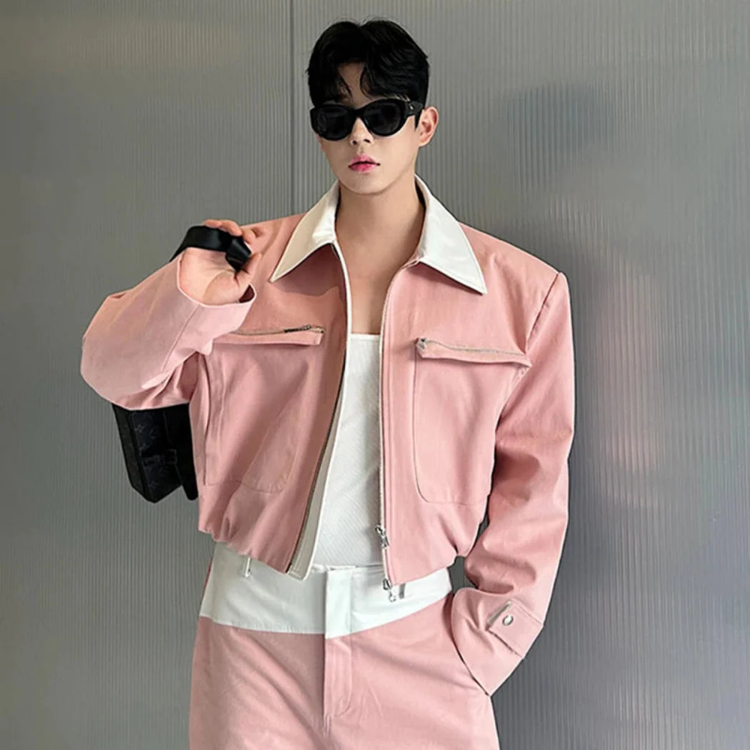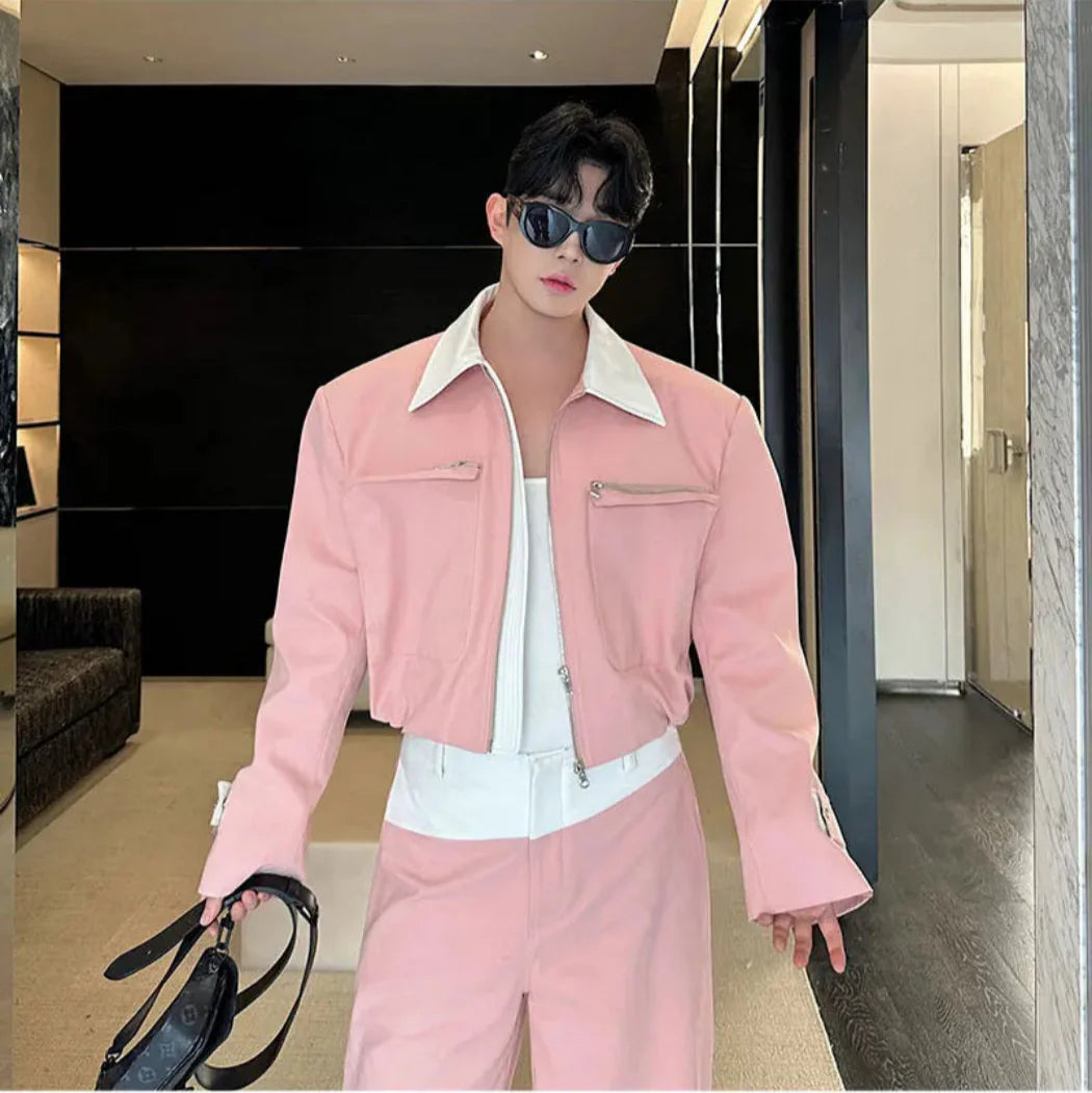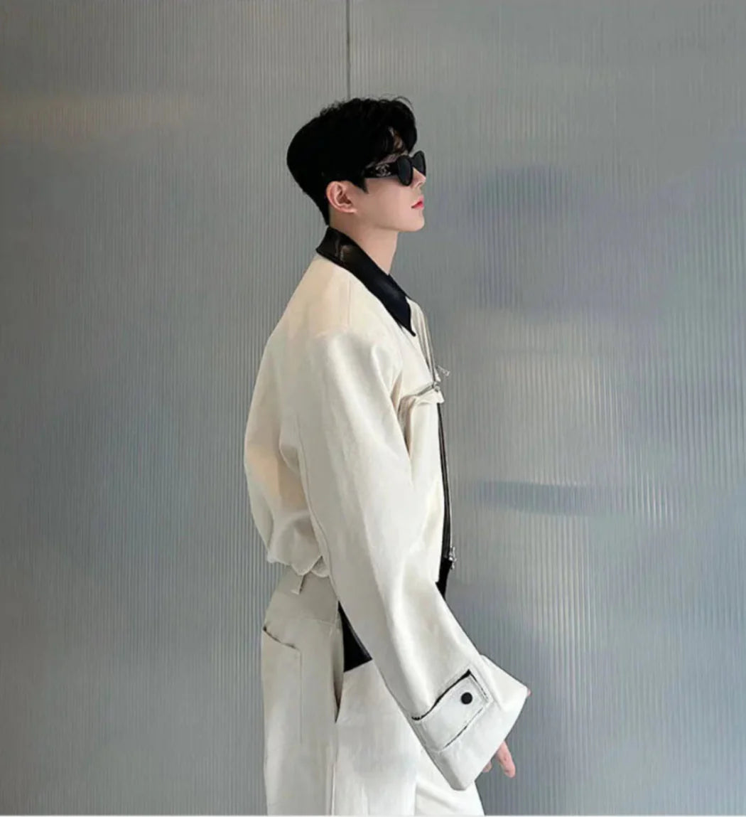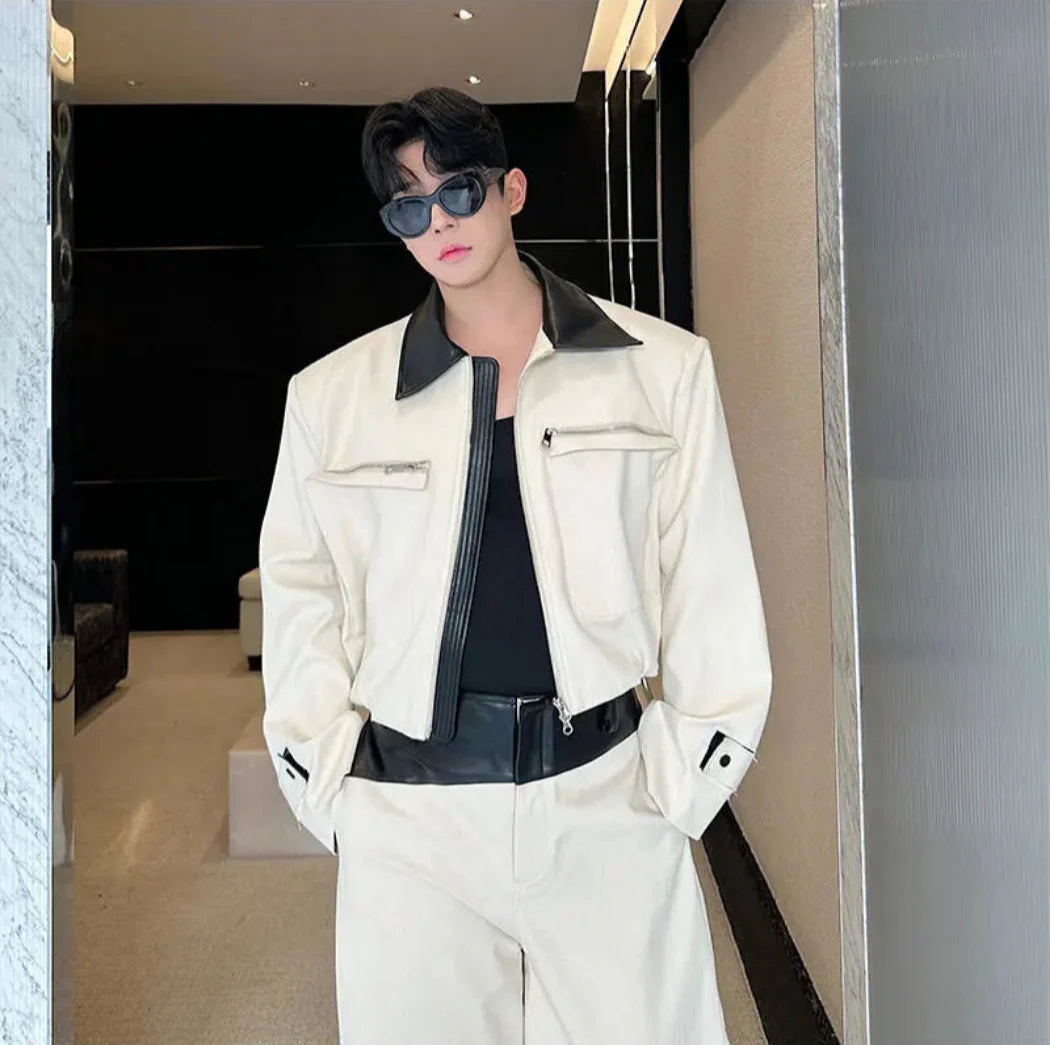 A tribute to Japanese high-end streetwear. this premium 2-piece set combines a cropped jacket and baggy pants with sleek faux leather accents.