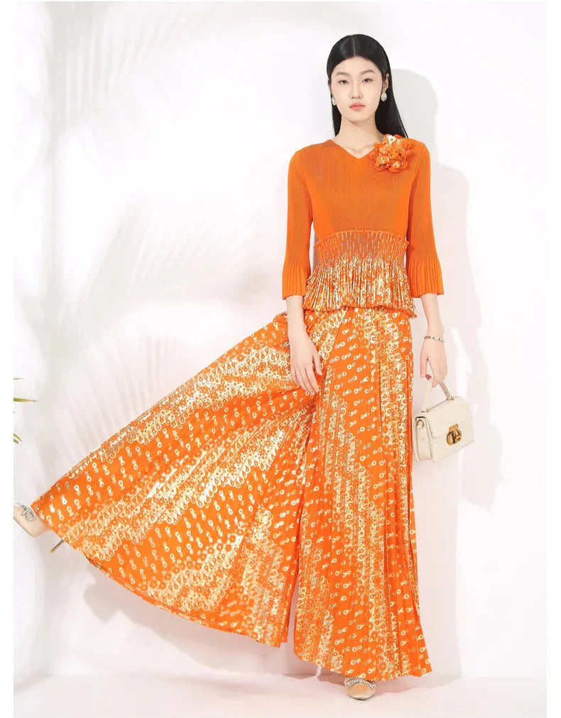 Luxury Two-Piece Pleated Wide-Leg Palazzo Pants & Top