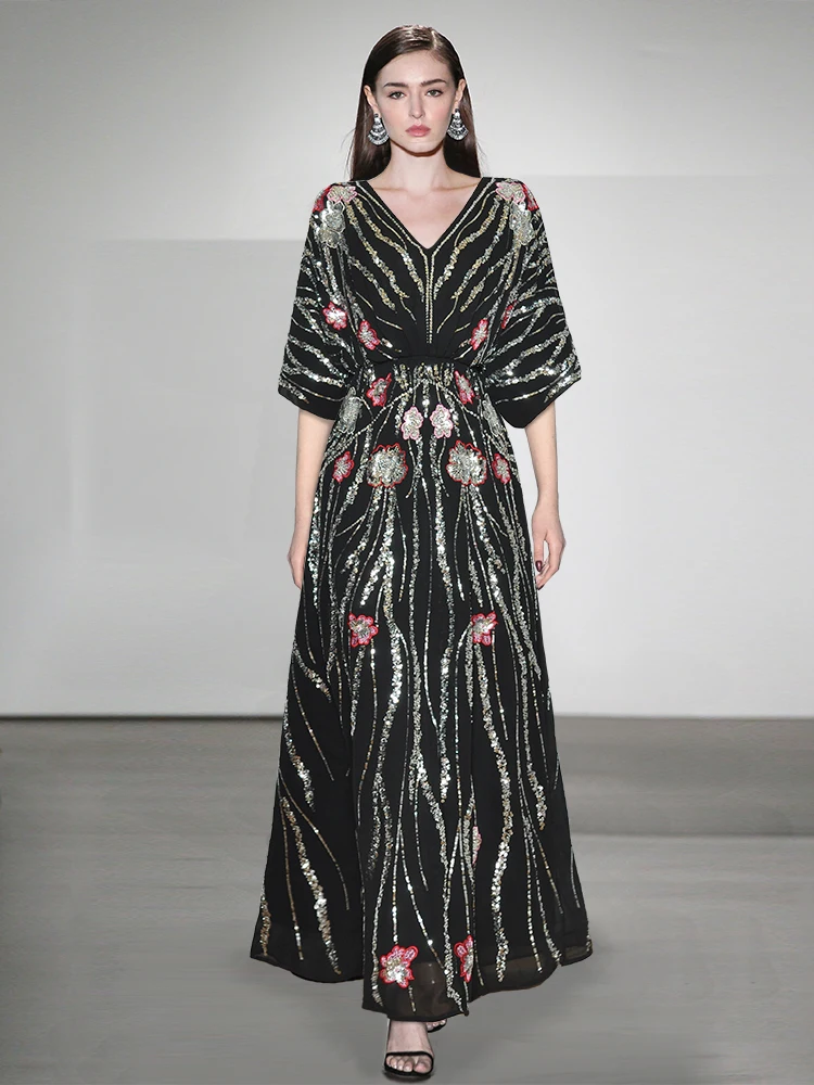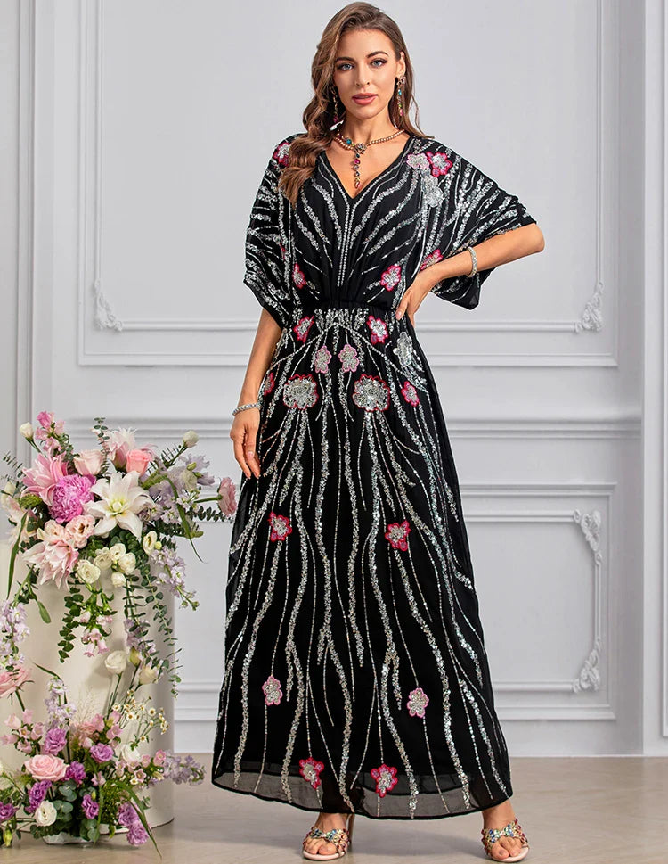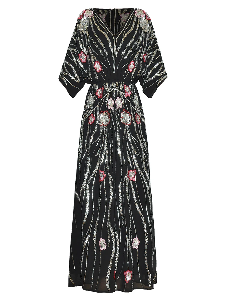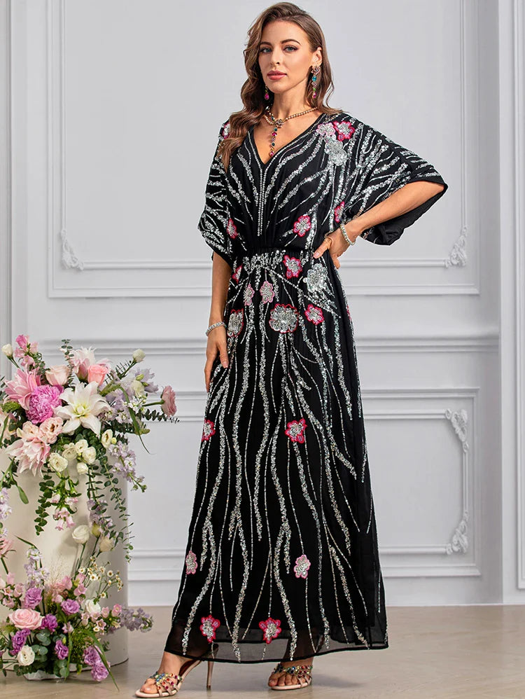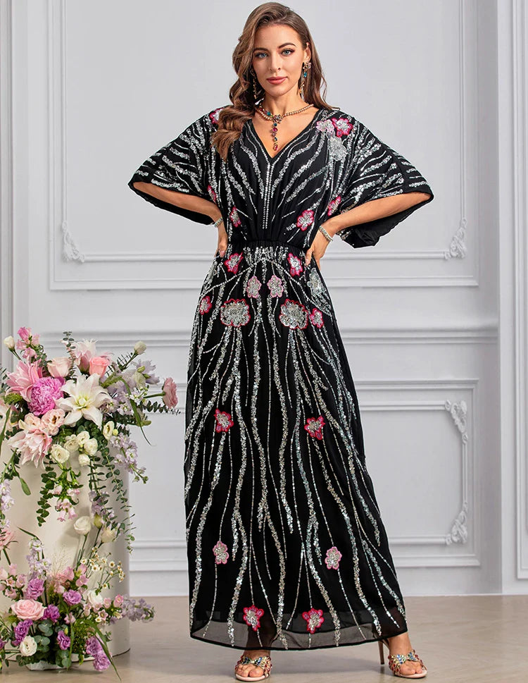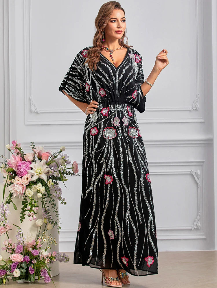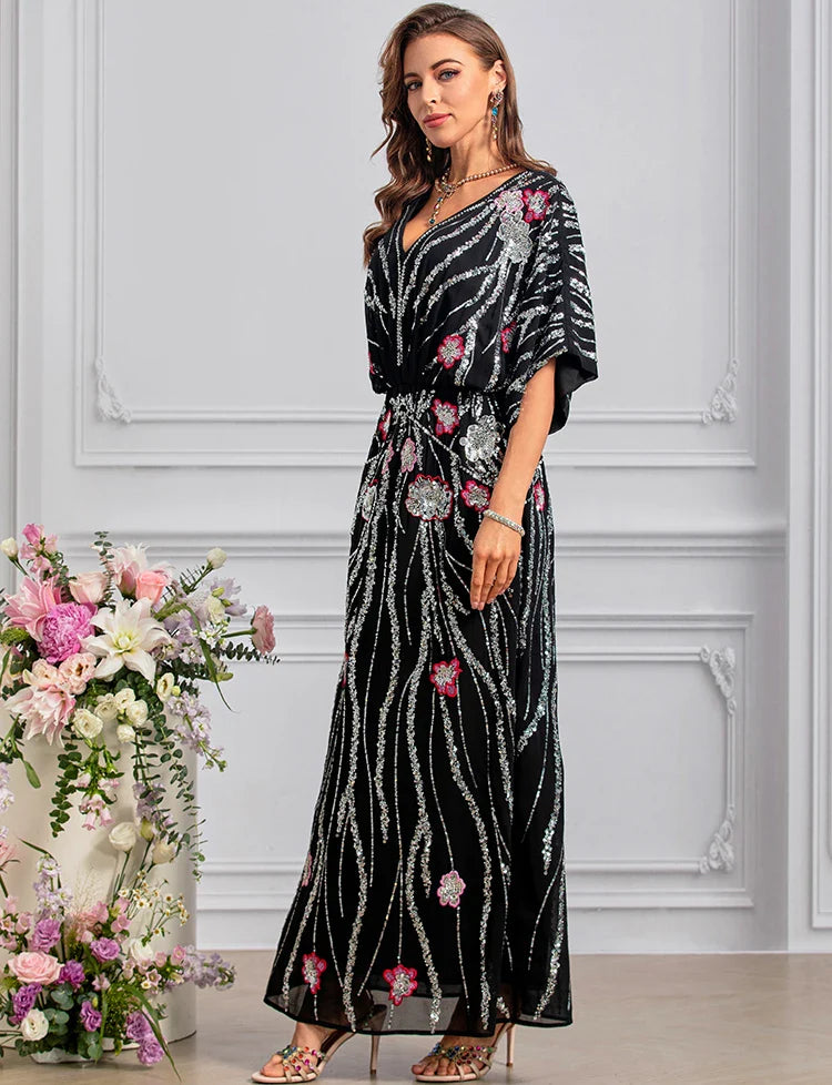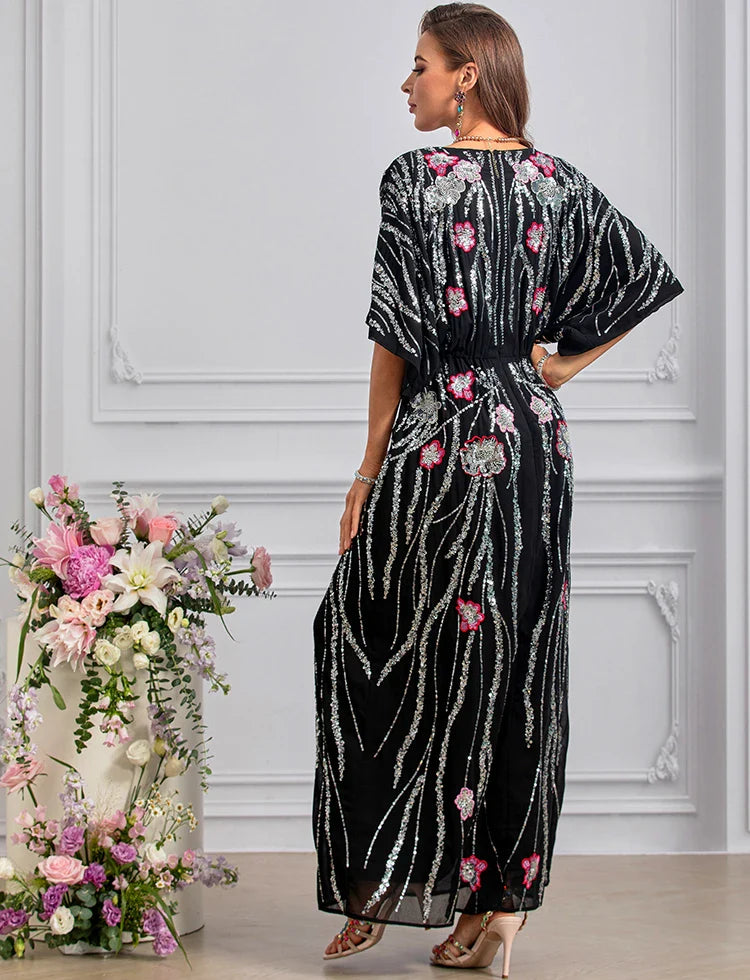 Want to turn heads at your next night out? This Luxe Floral Sequin Batwing Dress is your go-to. Imagine all that sparkle catching the light as you move—it's seriously mesmerizing.