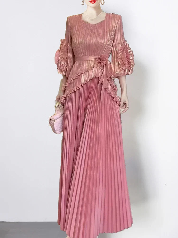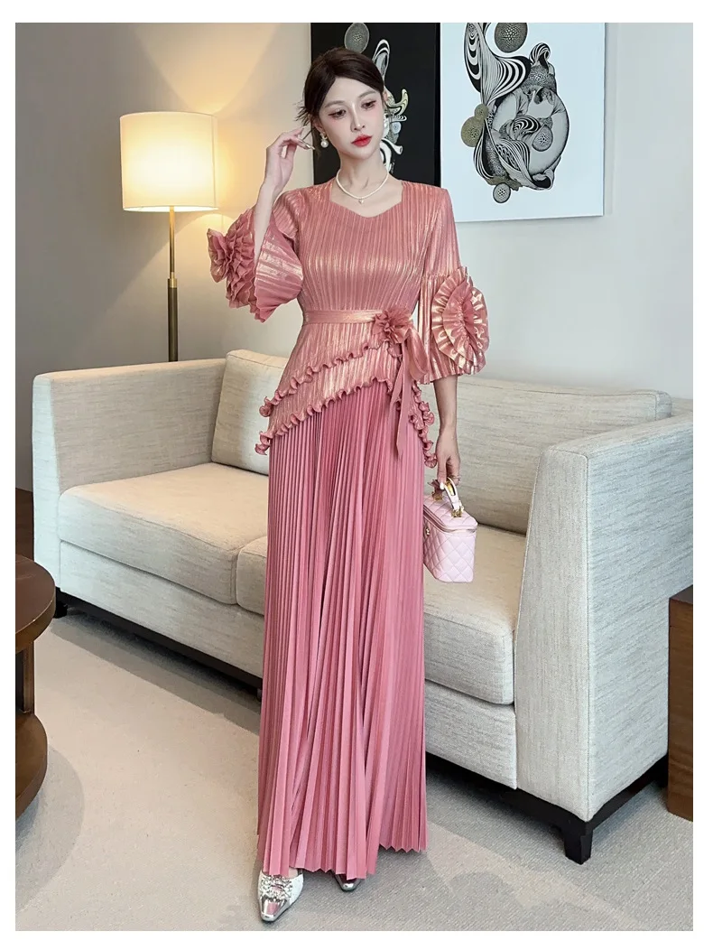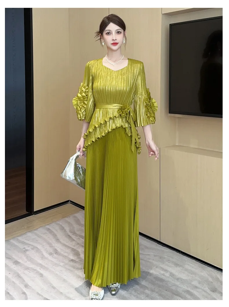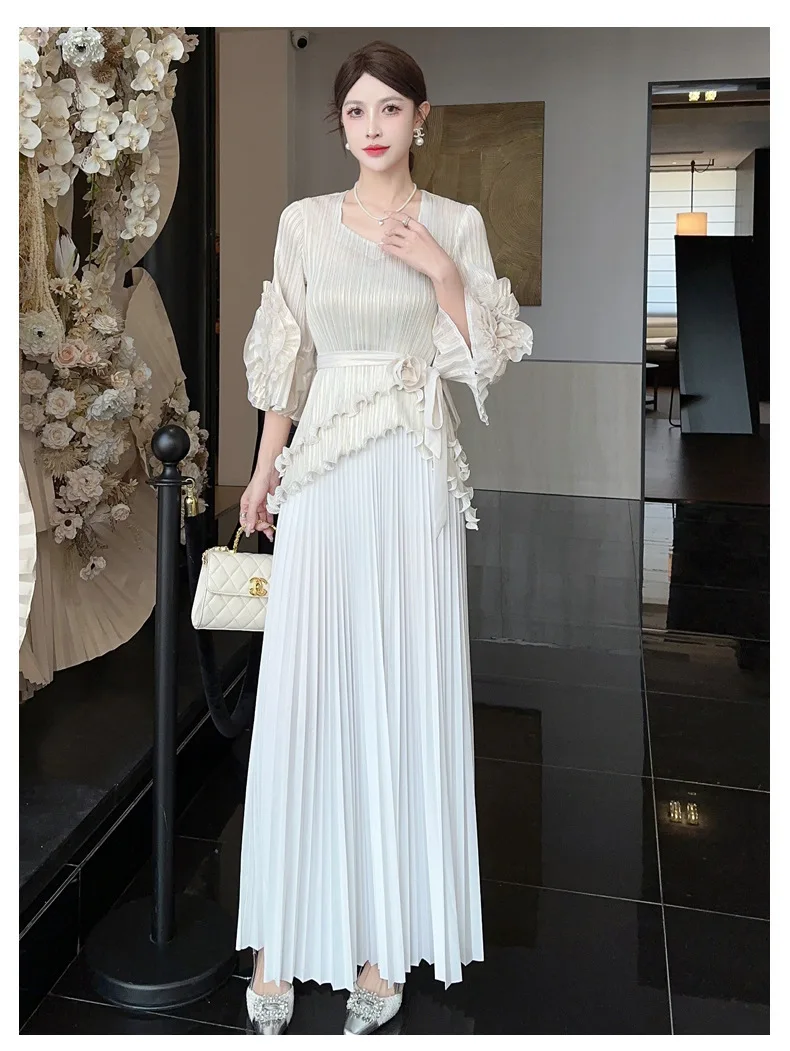 Searching for something bold yet timeless for weddings. formal events. or special dinners? This two-piece set pairs dramatic floral sleeves with a fluid pleated skirt that moves with you.